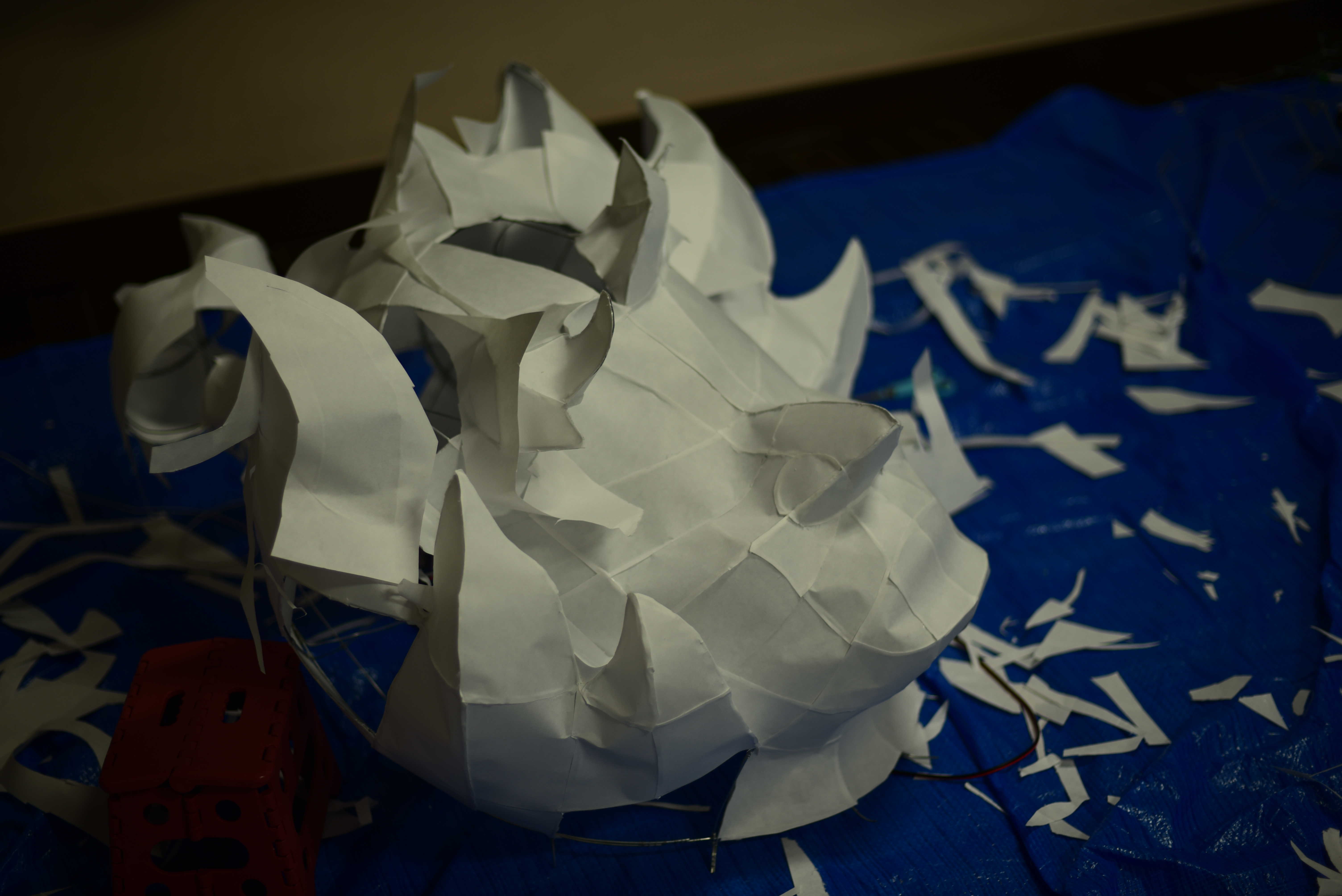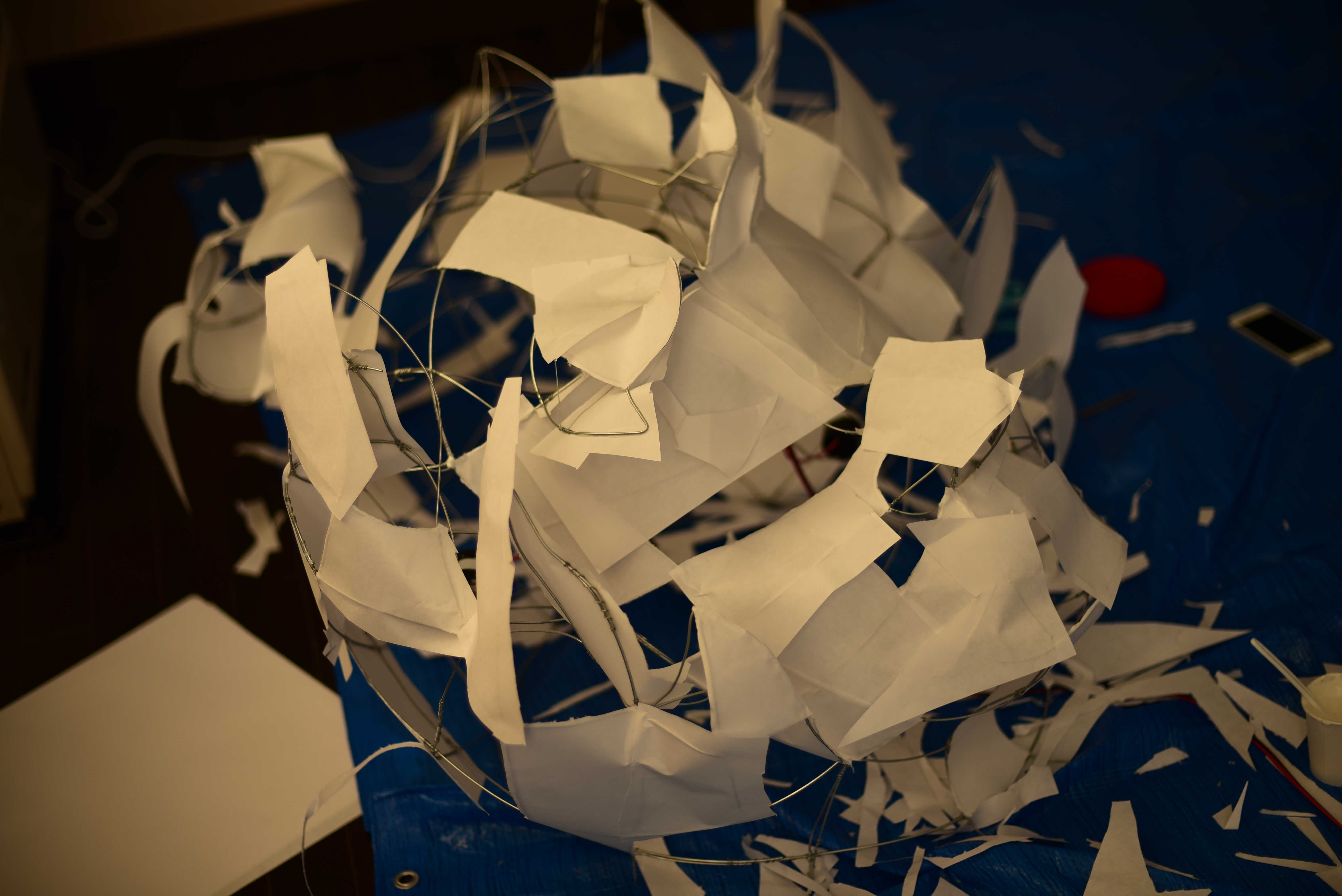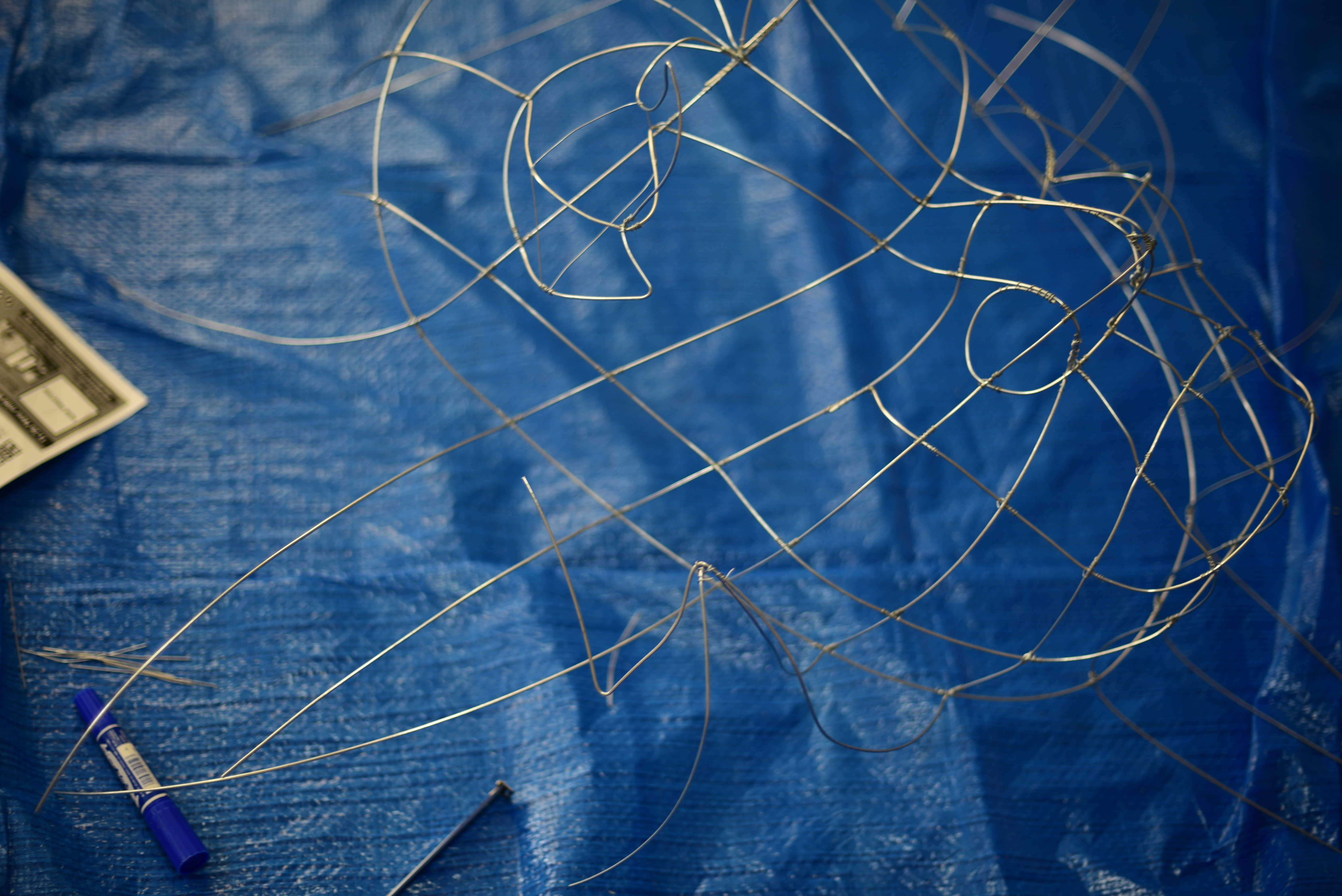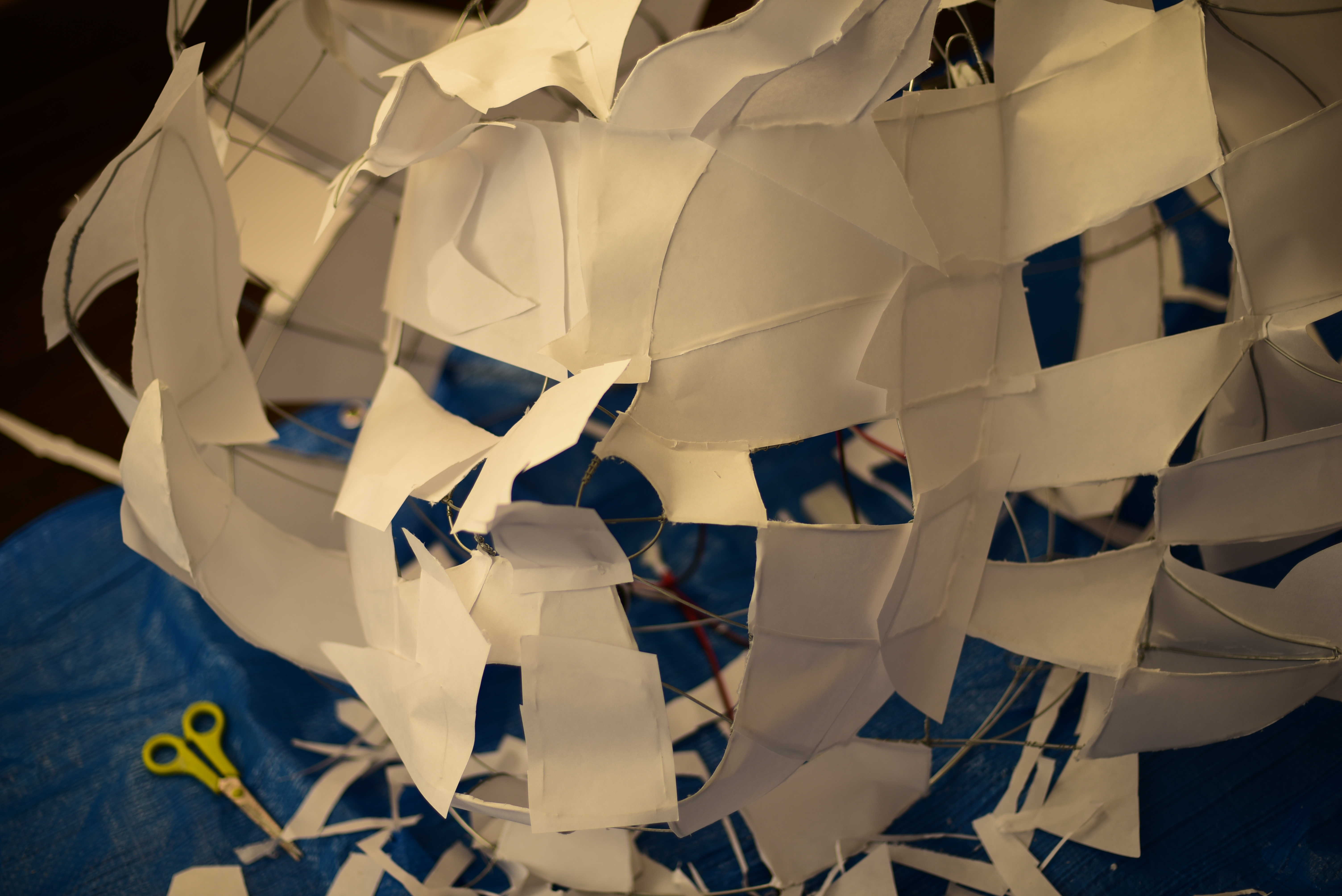予め作ってあった、顔側の境界と本体側の境界を合わせ、数カ所縫います。…縫いますというと聞こえはいいですが、実際は紙を破いて結束線でくくりつける感じです。