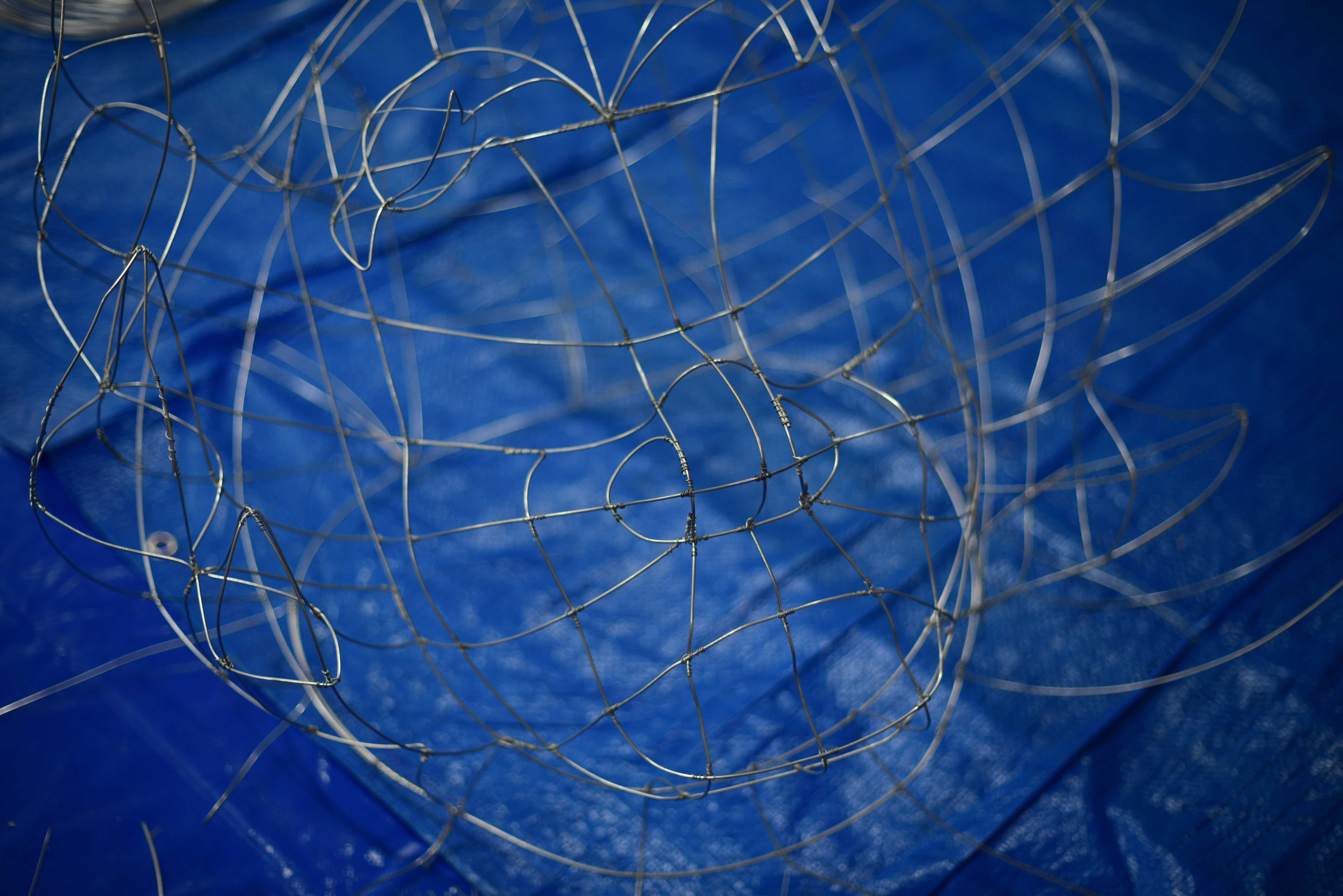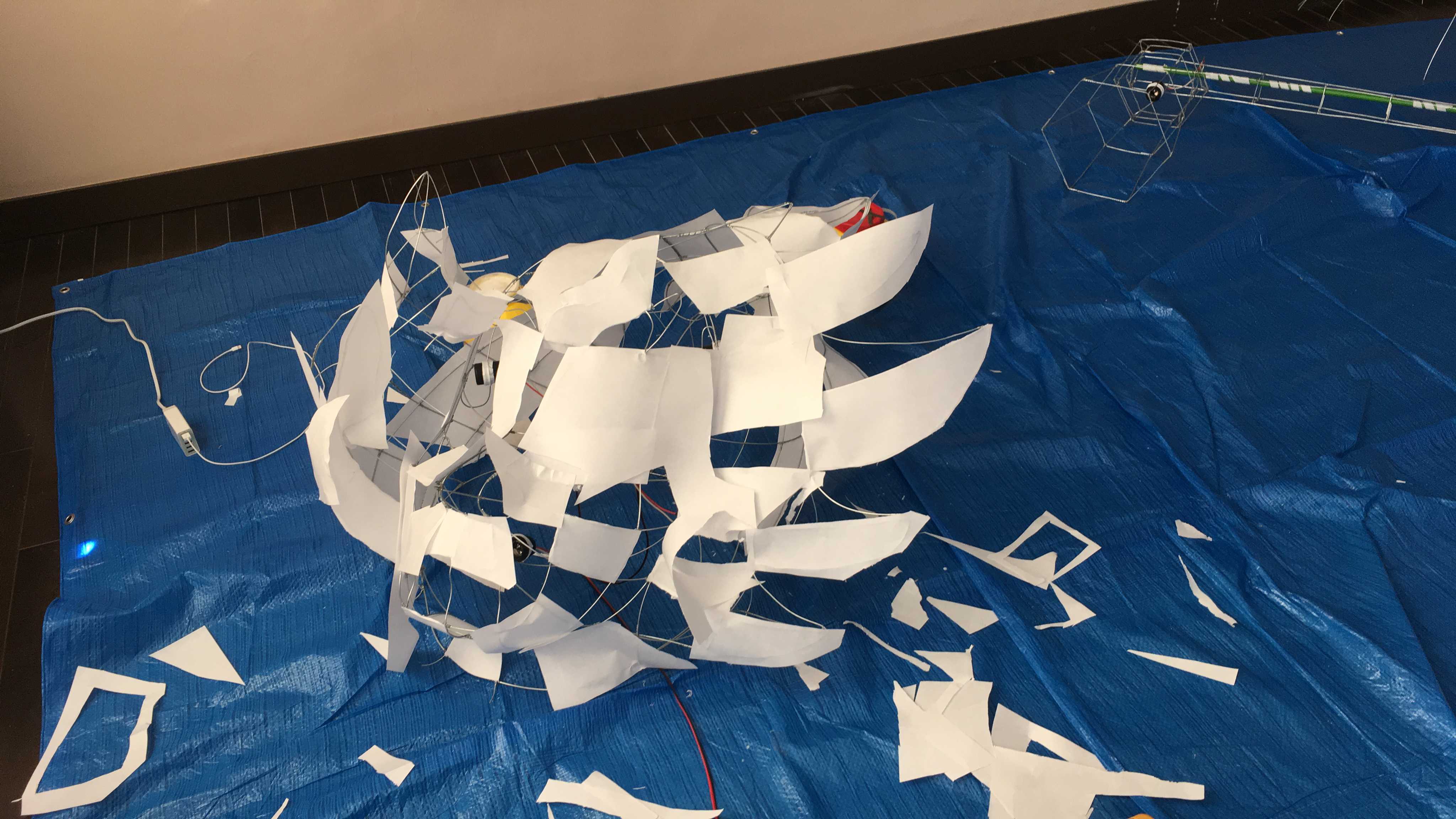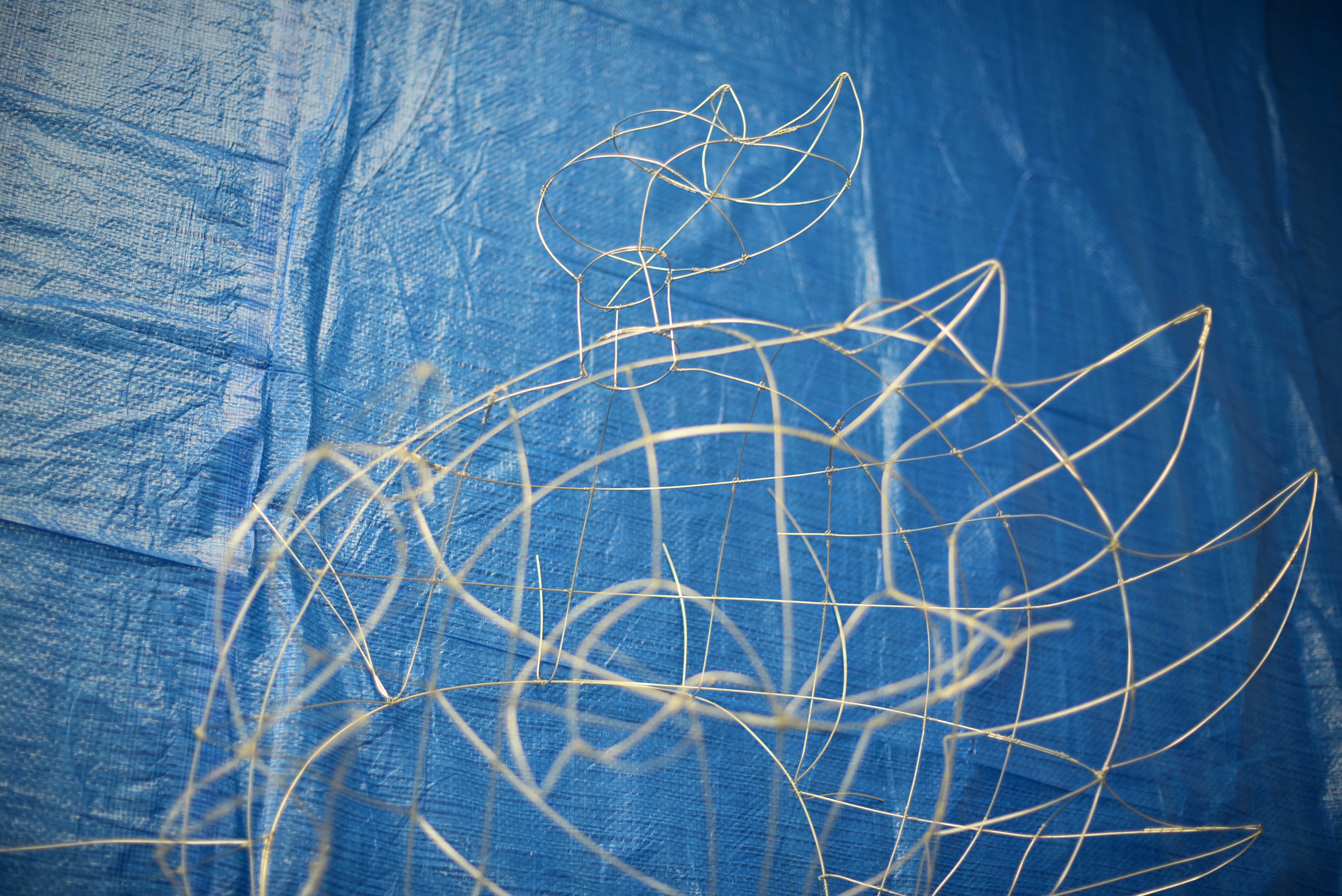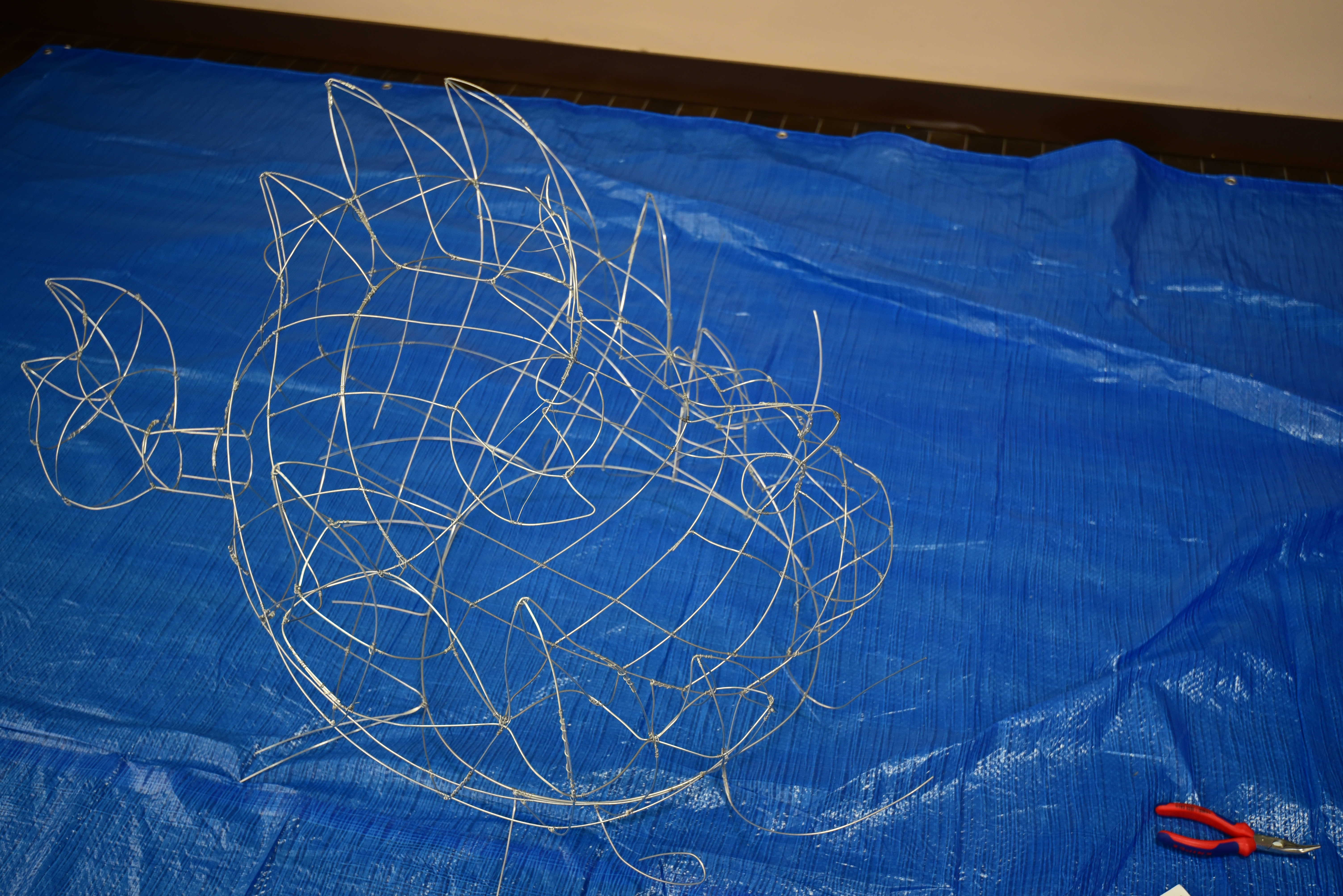 予め作ってあった、顔側の境界と本体側の境界を合わせ、数カ所縫います。…縫いますというと聞こえはいいですが、実際は紙を破いて結束線でくくりつける感じです。