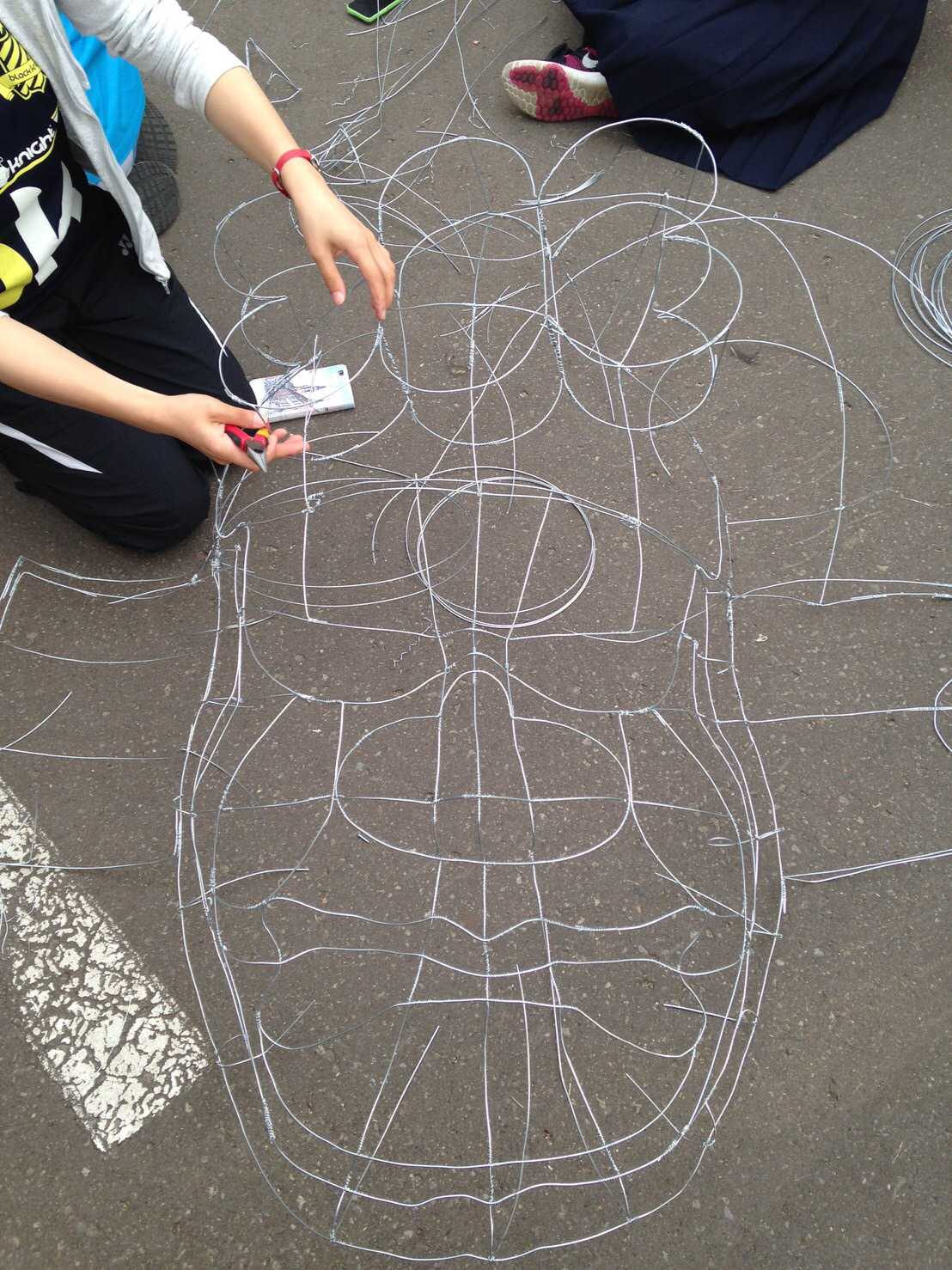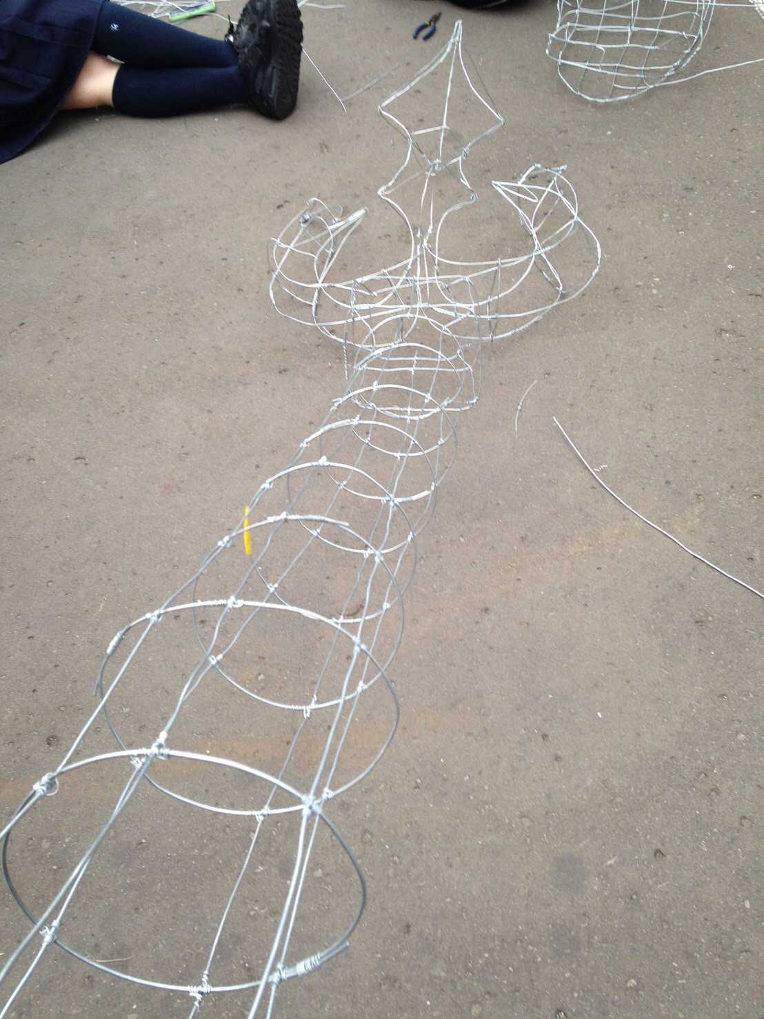 針金は上から下にかけて作りたかったので、男子は月曜から土曜にかけて龍の胴体部分を作り、顔や手、女の顔や龍など、それぞれの担当部分も作り始めました。
