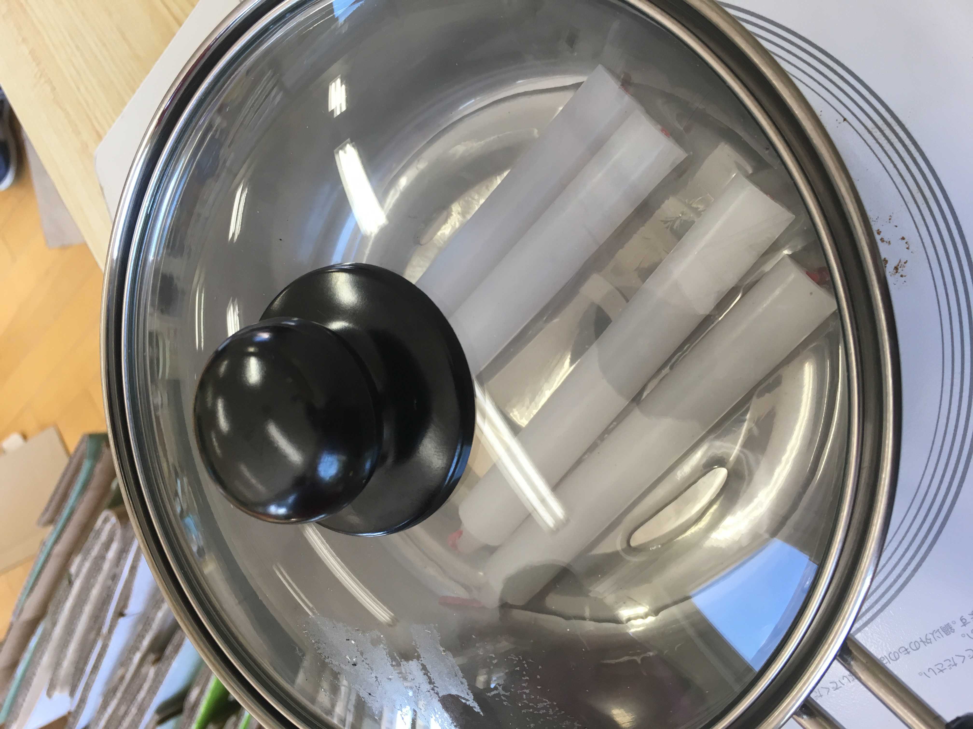 ここでロウ書きをする際の注意点ですが、生徒会でもコンロと鍋の貸し出しはしていますが、蓋がないため教室でロウ付けをせずに僕らのように外でロウ書きをする場合、すぐに冷めて使えなくなってしまいます。そのため800円くらいの蓋つきの鍋を1組は買いました。また、筆はすこし扱いを間違えるだけで使えなくなってしまうので、100円ショップで3本入りの筆などをたくさん買っておくといいと思います。