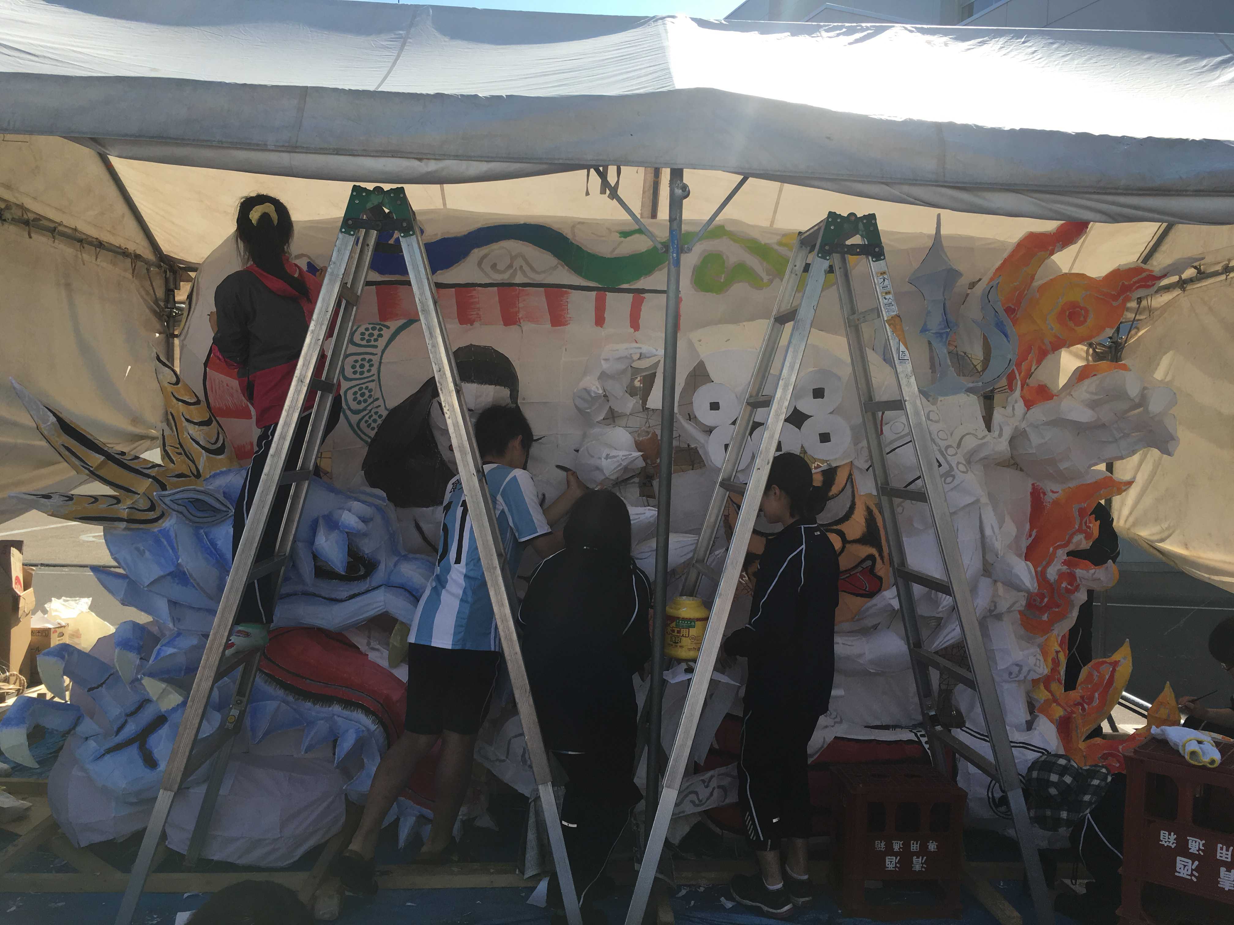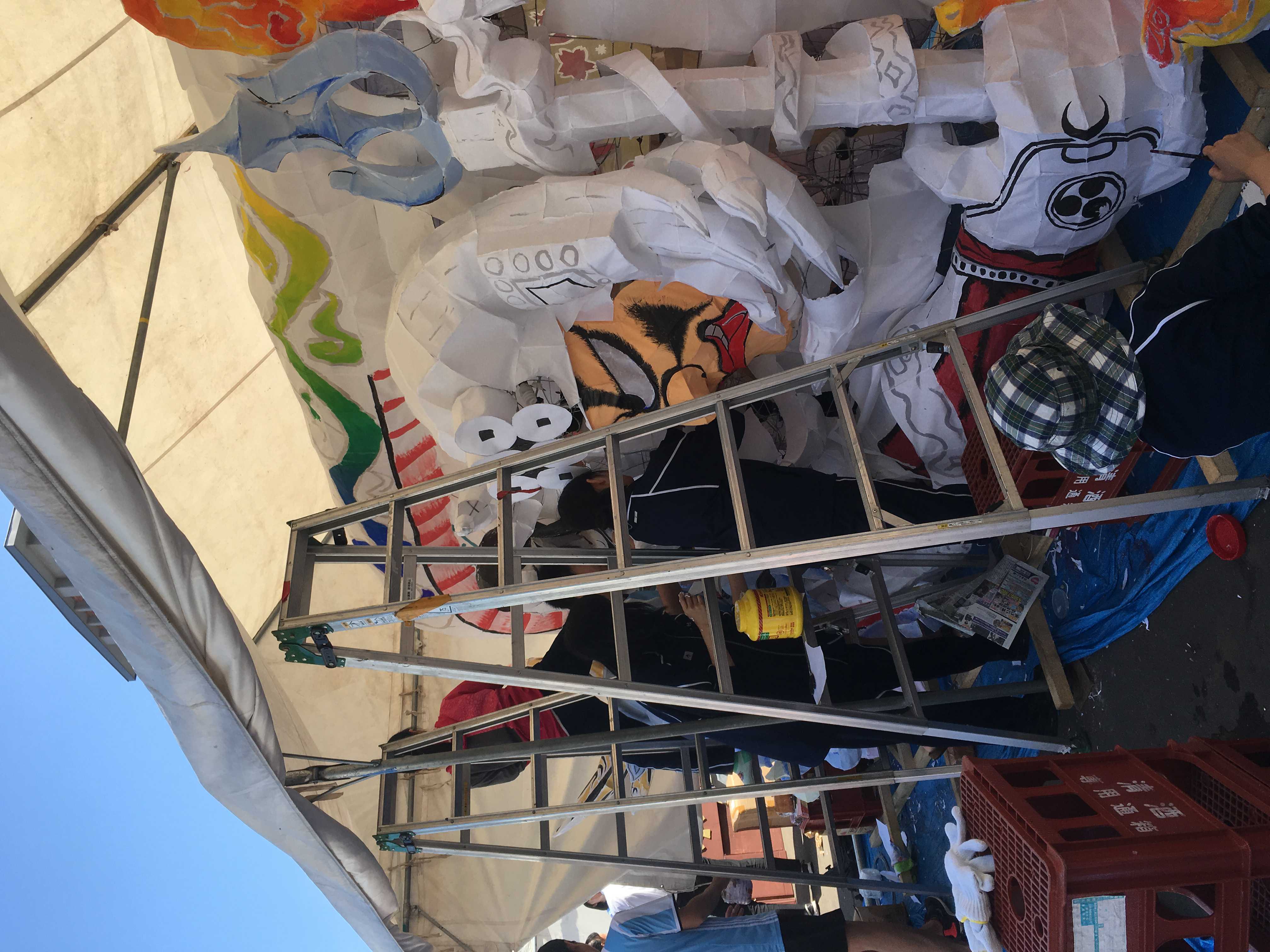 また、行灯を直置きしているので中に入って電飾作業などをしていると自分の意思だけでは外に出れません。そんな中でも最後の最後まで中で電飾の最終確認、光漏れの修正をしてくれた男子に感謝です。ありがとう。