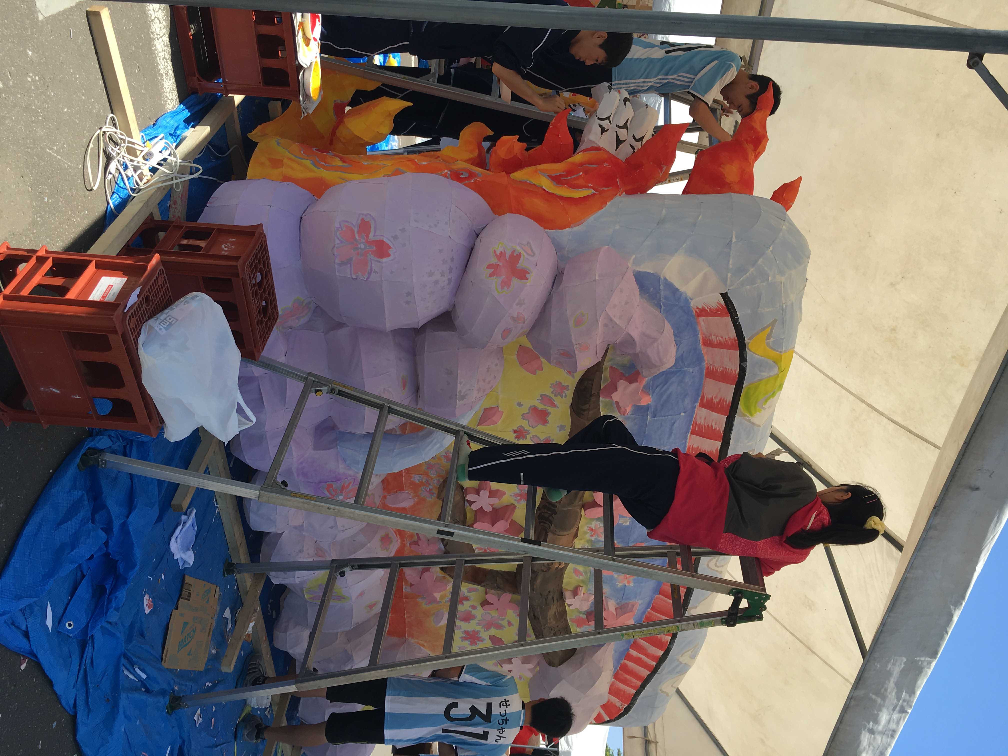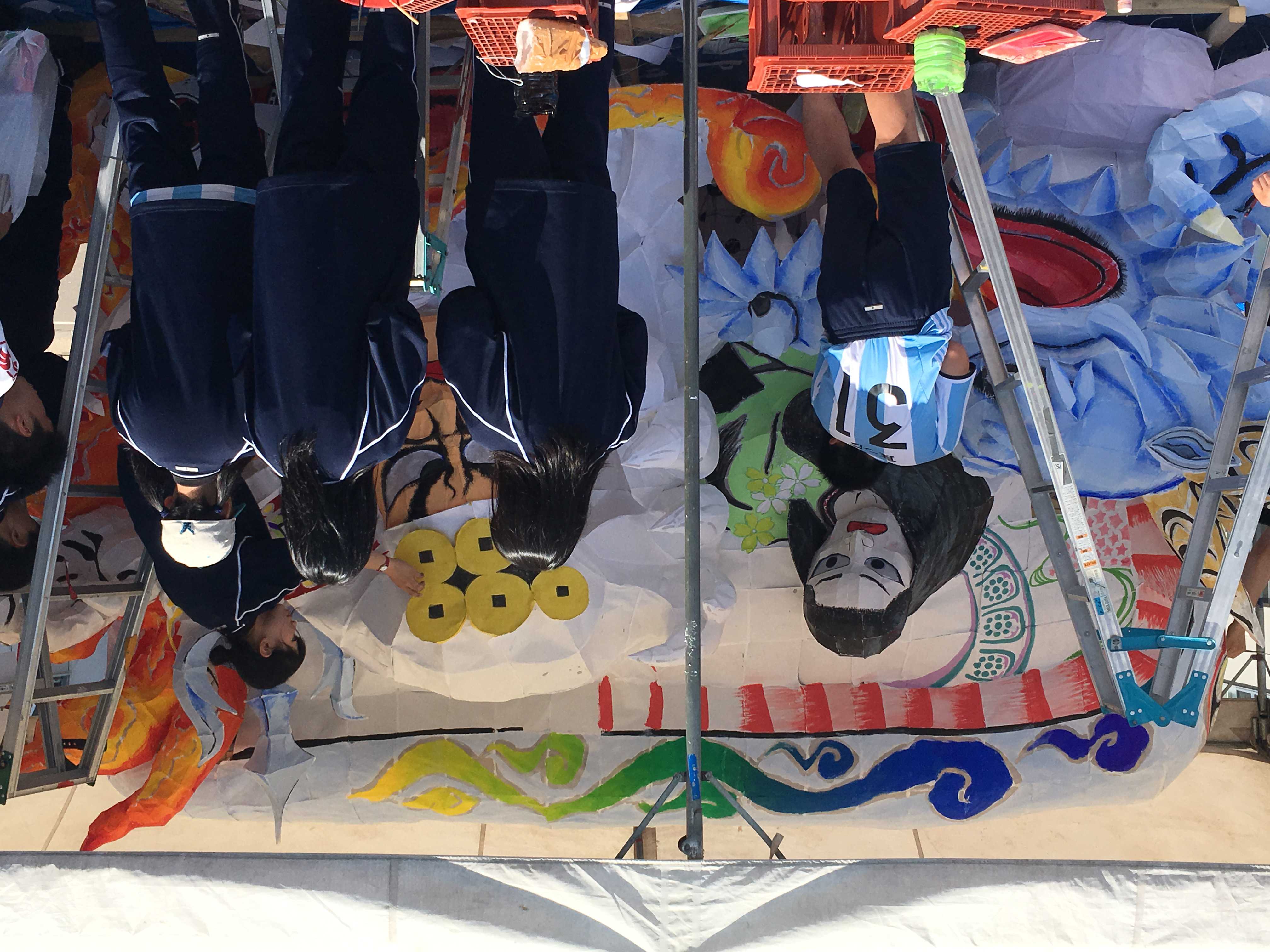 また、晴れた日にはビールケースから行灯を下ろし、地面に直置きすることで女子でも龍の胴体を描けるようにしました。後塗りに挑戦したいクラスは脚立を持っている人を探しておいたほうがいいかもしれません。天井140cmなどでは太刀打ちできません。