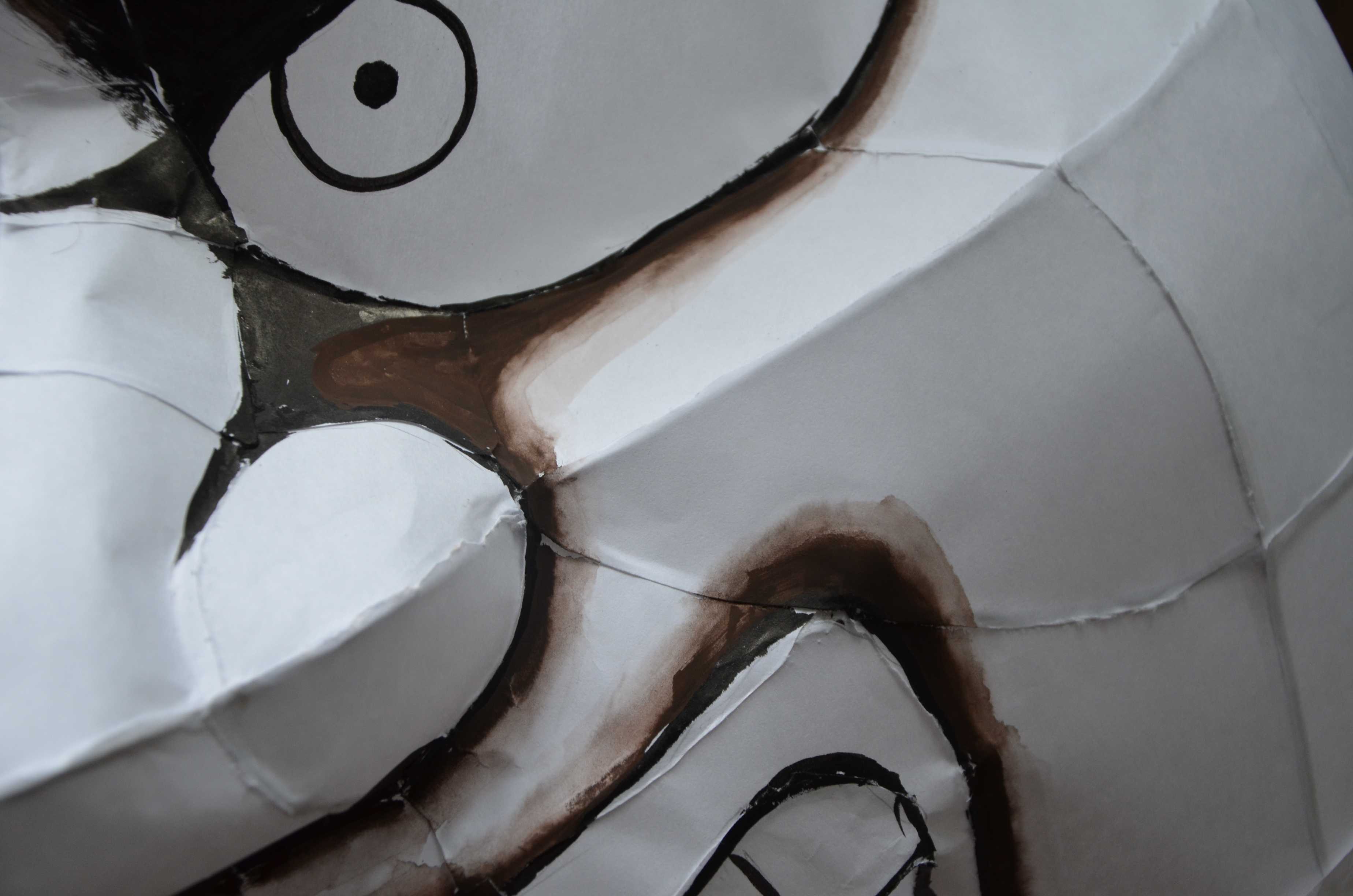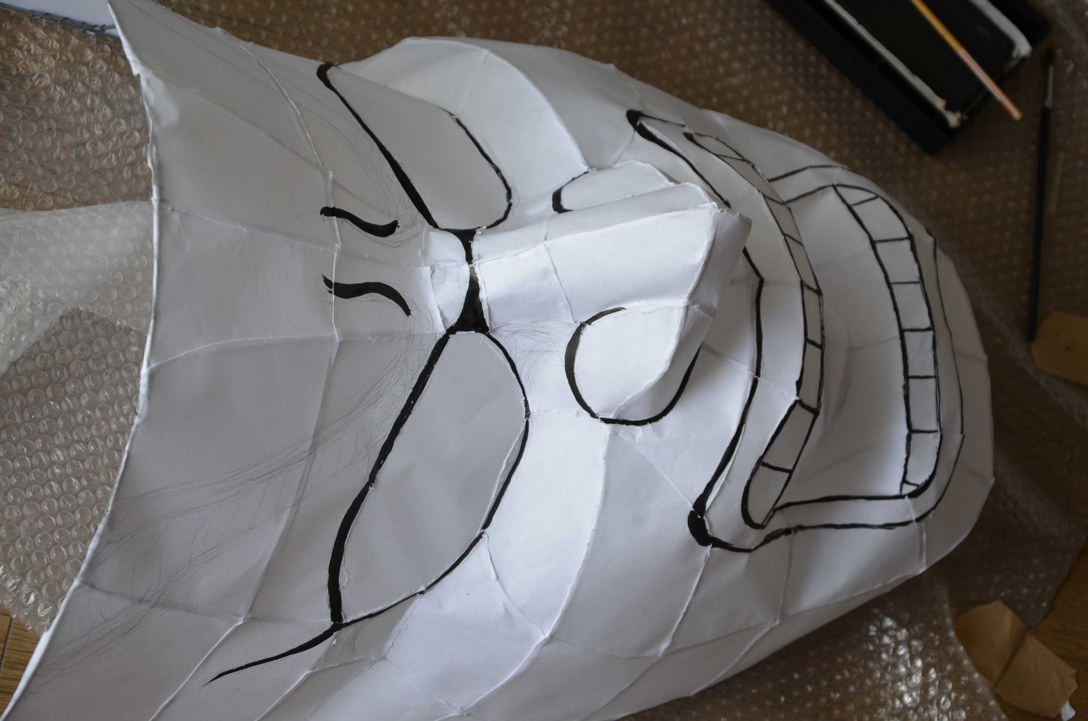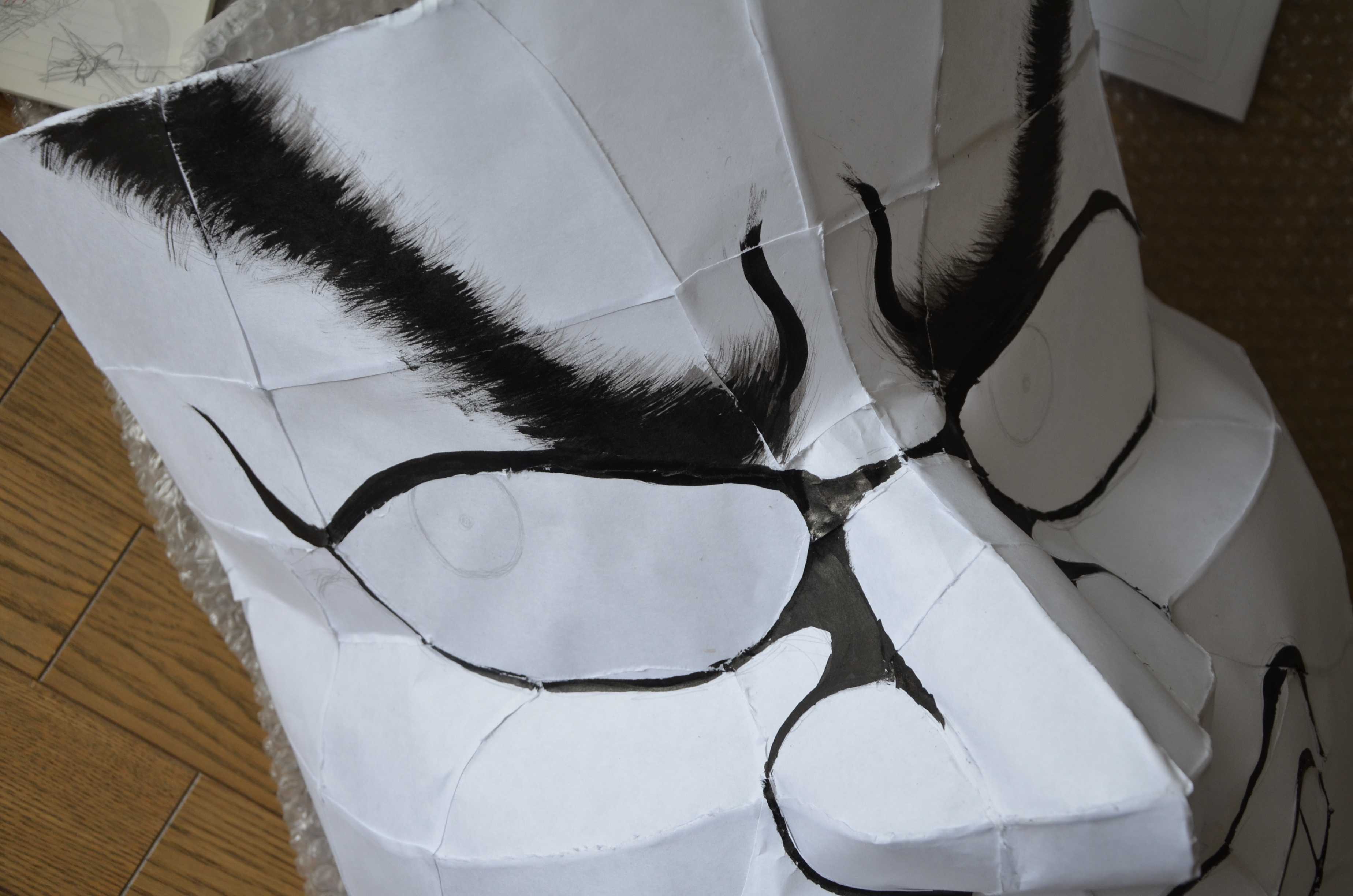 最初に述べたようにこれ以外の作り方もいろいろありますが、基本的にこの針金の組み方で、そこから凹凸を少し変えたり口を閉じたり、墨の入れ方・隈取りのやり方を変えるといった感じで表情を作っていく方が安全です。特に、技術力に自信がない、作りたい顔が特殊でない、顔に対するこだわりがない、という場合はそうした方が無難です (逆に当てはまらない場合はどんどん違う作り方にしていったほうが差別化できていいと思います)。