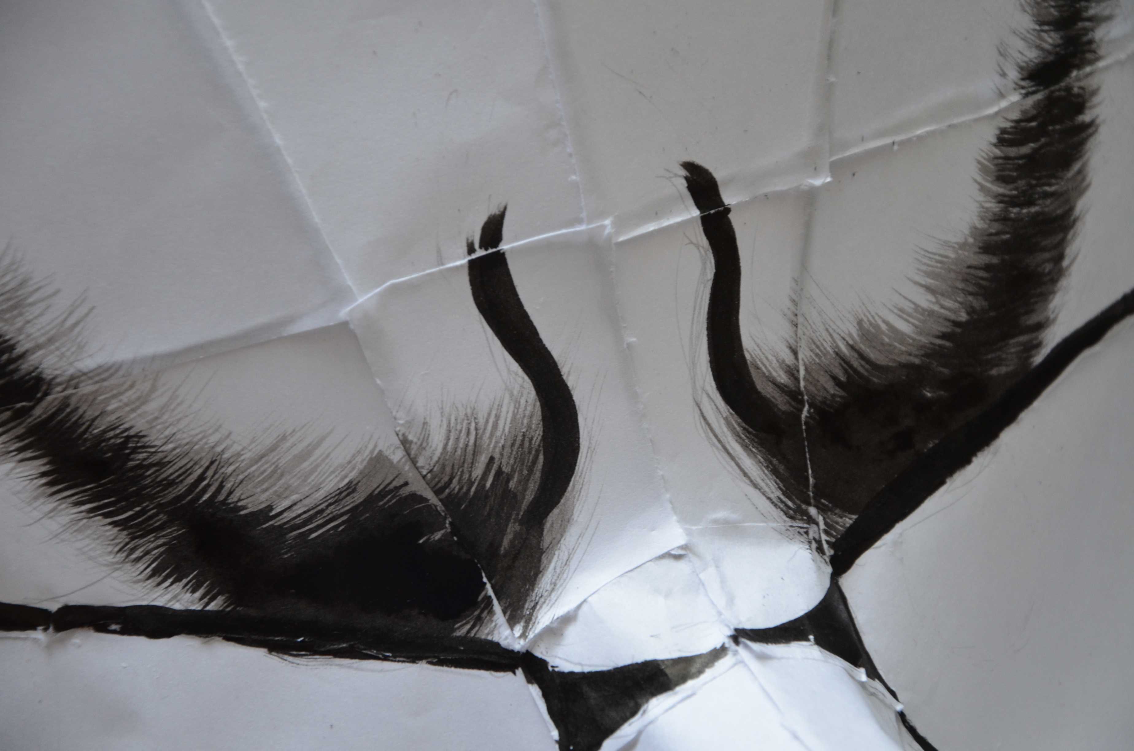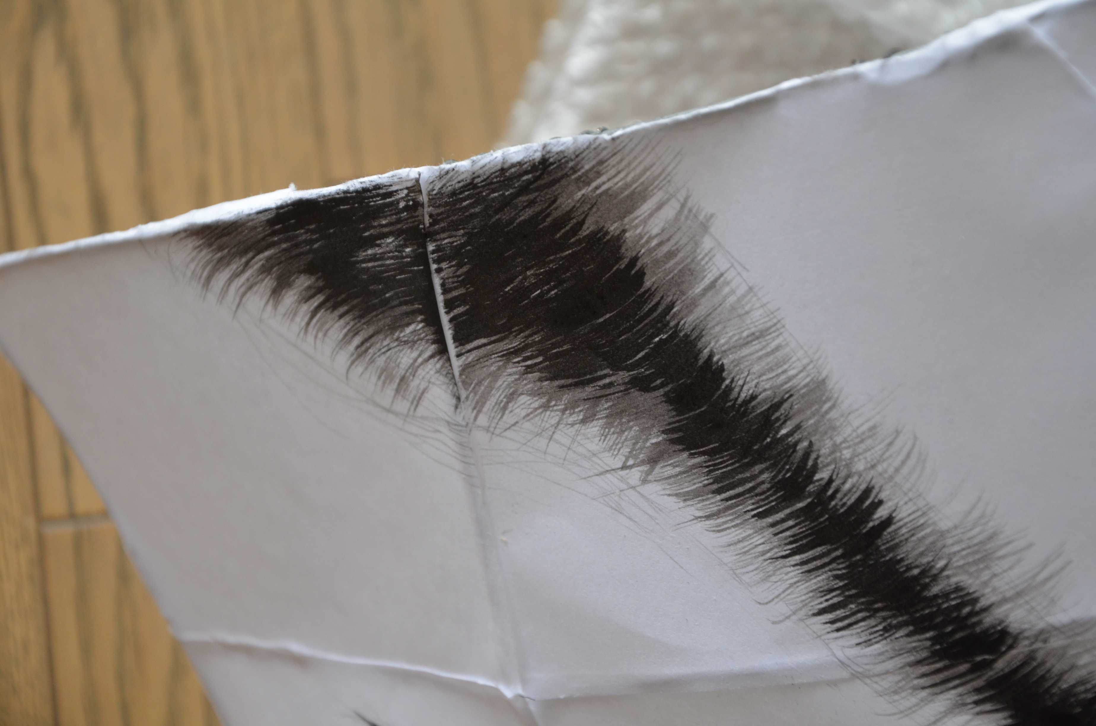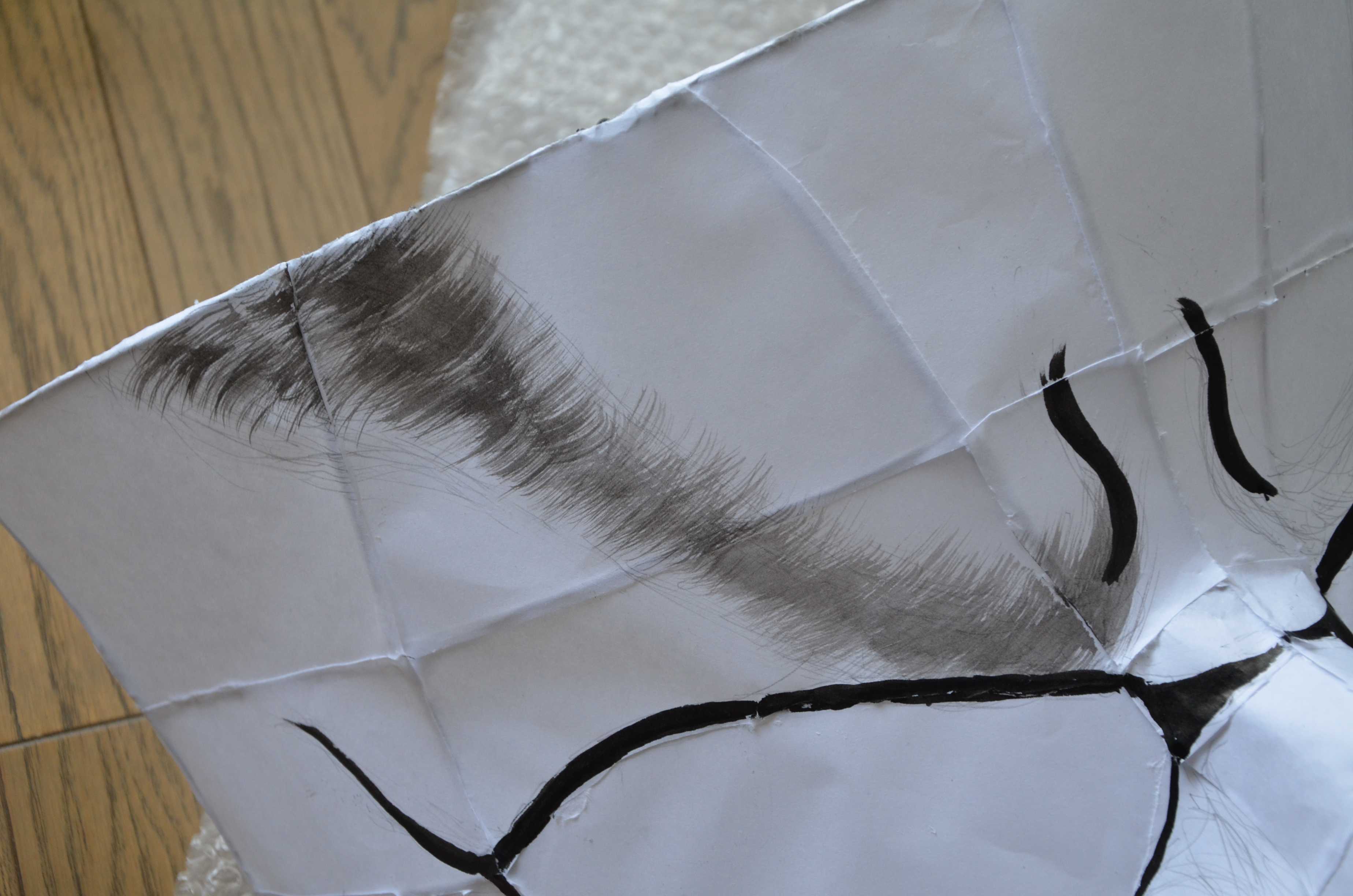 特に重要なのは眉と眉間の部分です。眉の部分は、写真のように、筆を開き、まずは薄墨から、その後に濃墨で書きます。眉間はかなり表情に影響を与えるので、よく下書きをしてから書きましょう。
