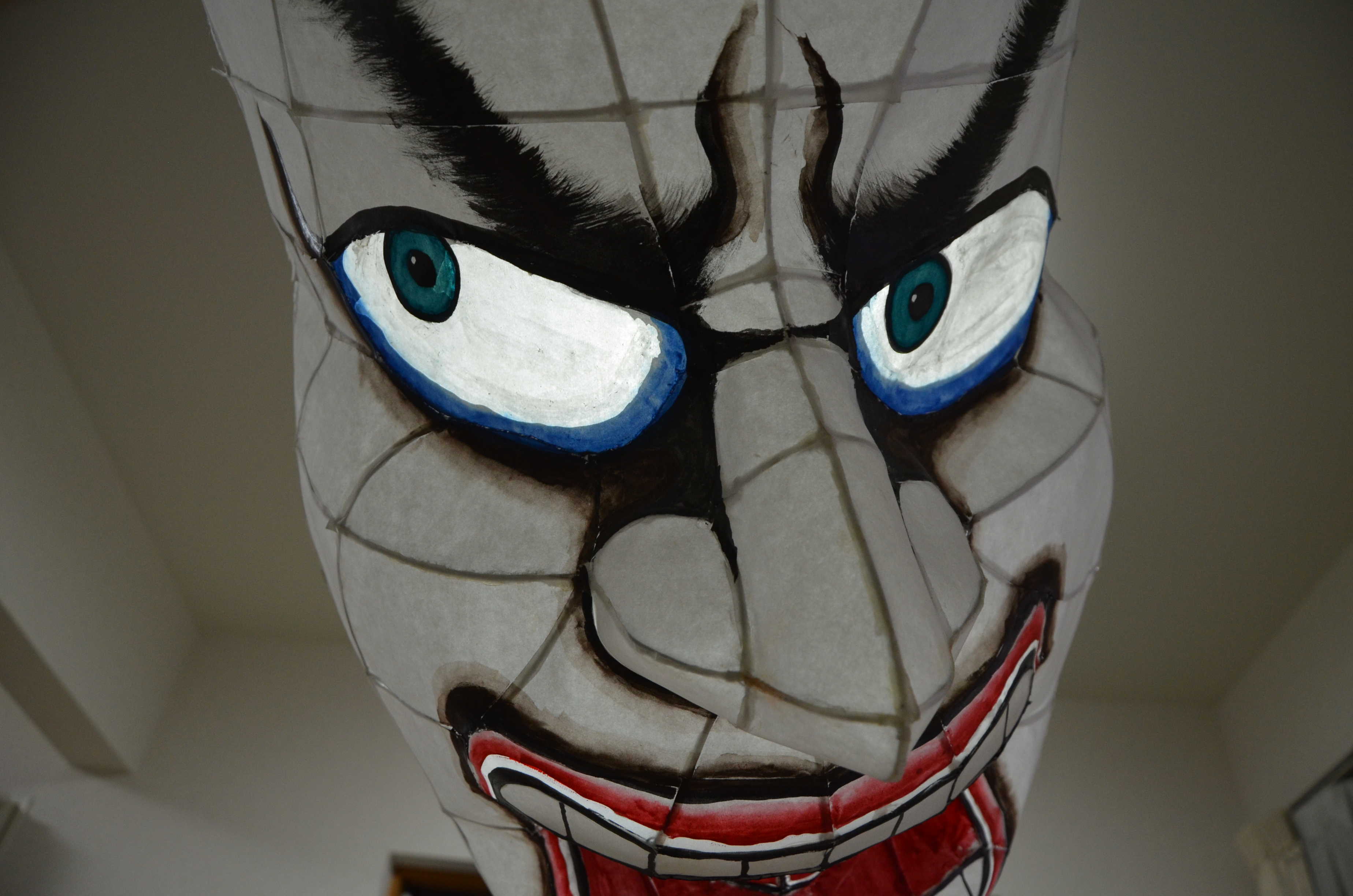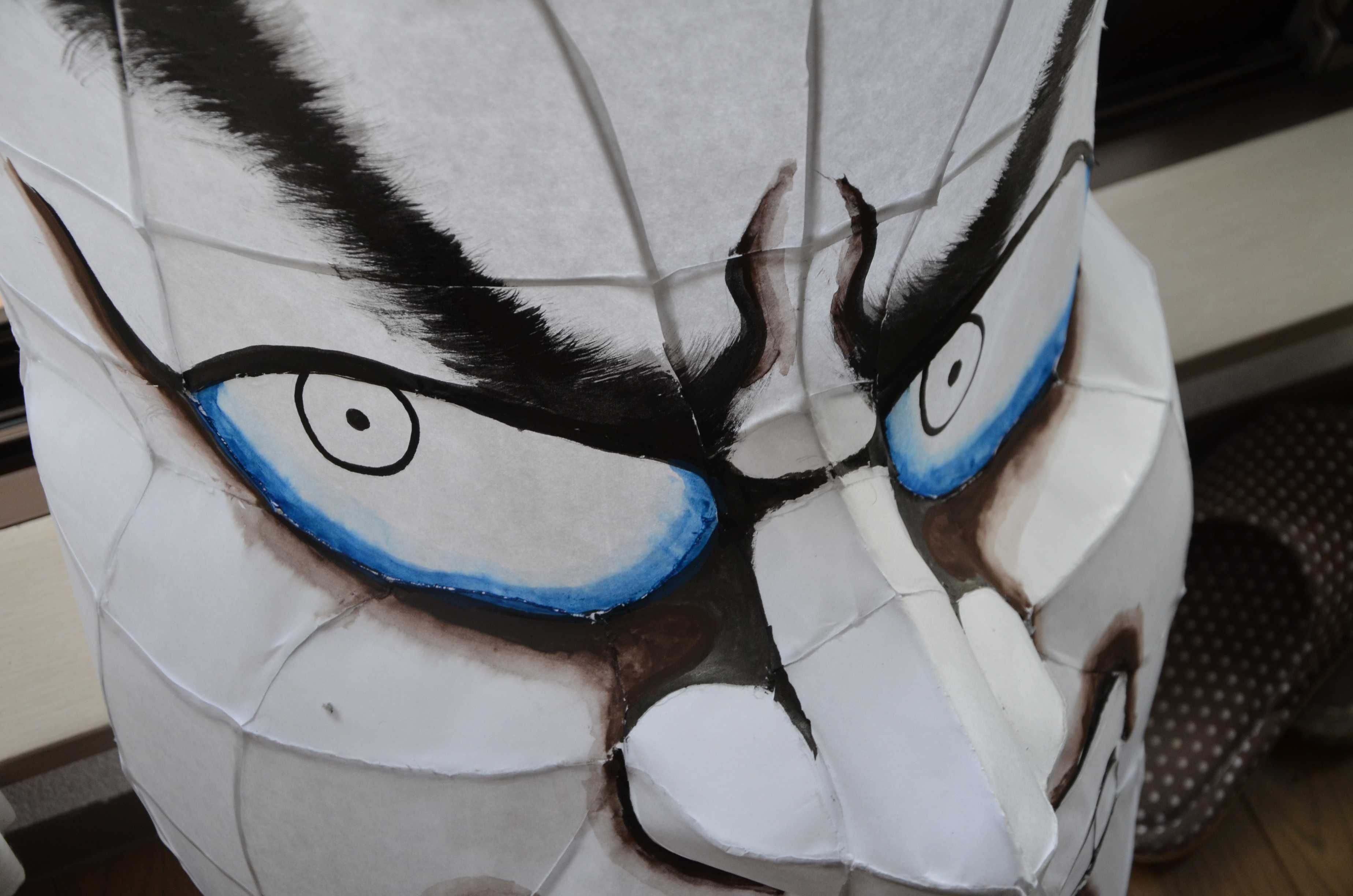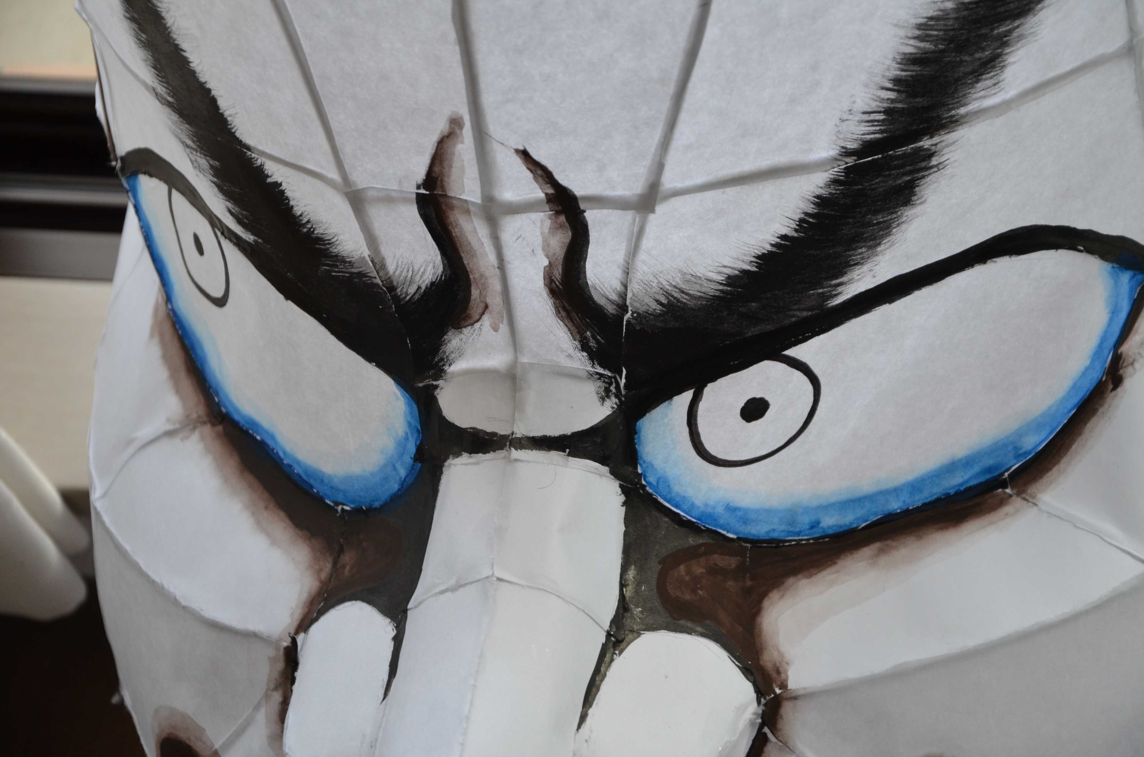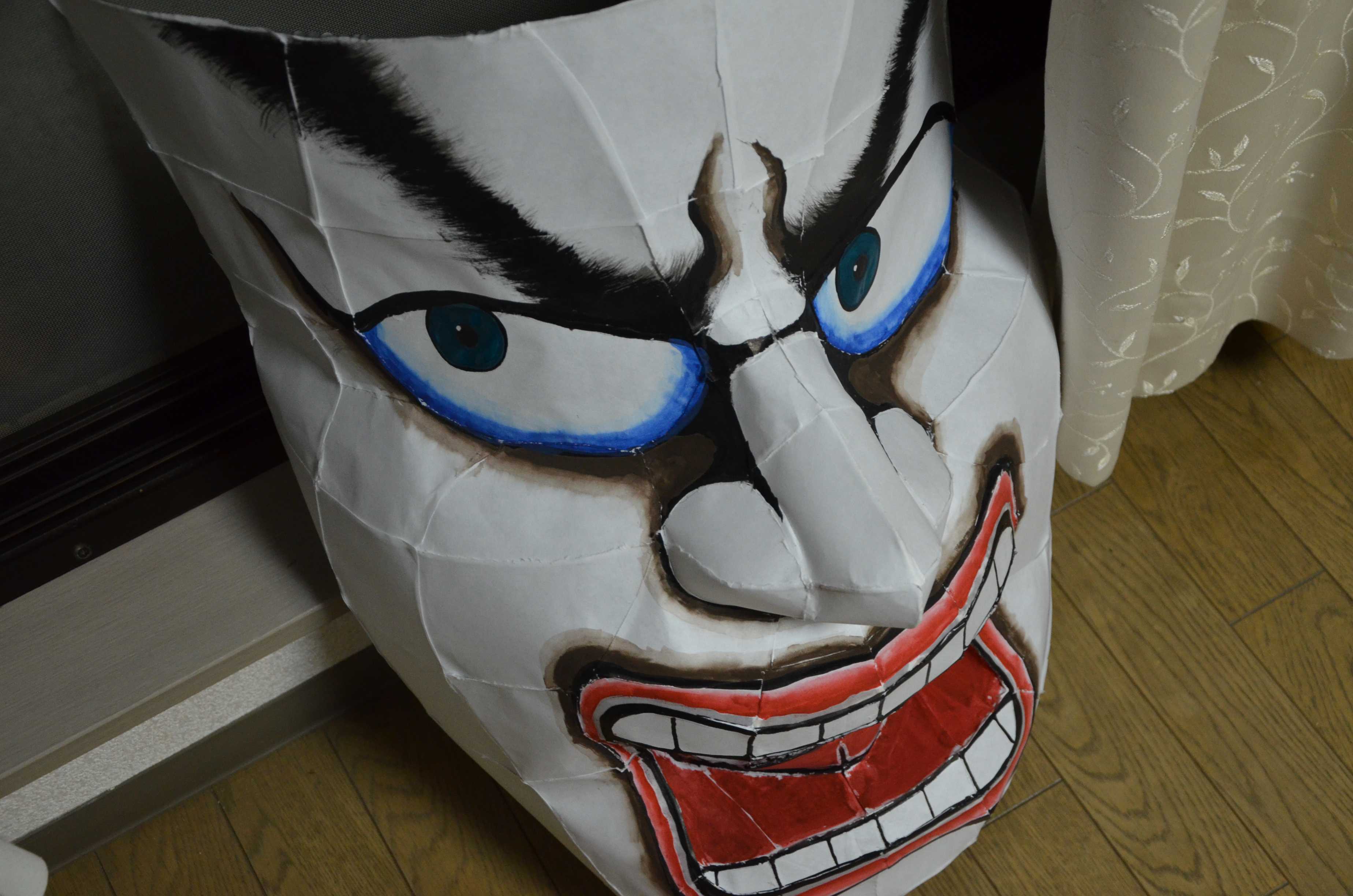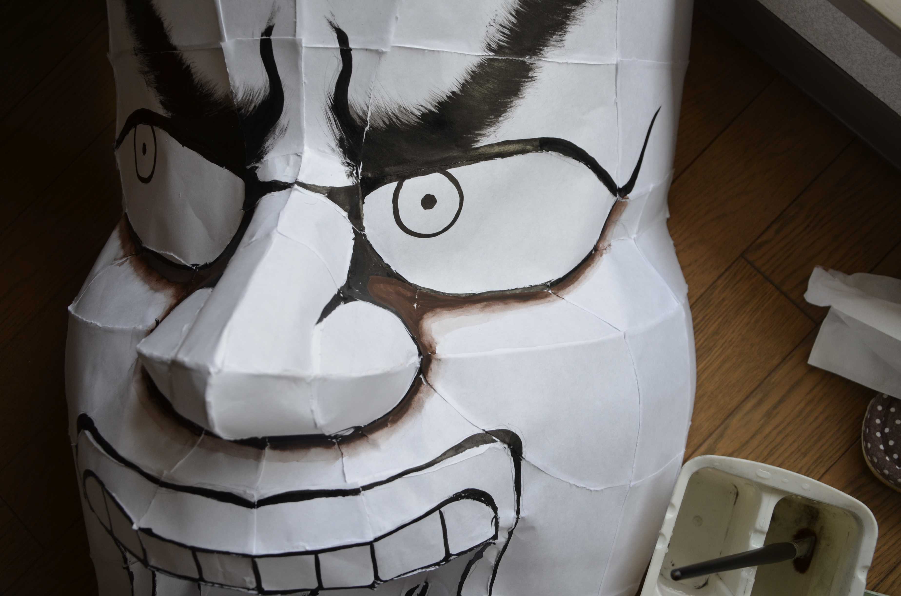 北高行灯ではあまりやらない(知らない?)のが隈取り(くまどり)で、隈取りをするとおもちゃっぽさが抜けて立体感と凄みがでます。必ずやりましょう。