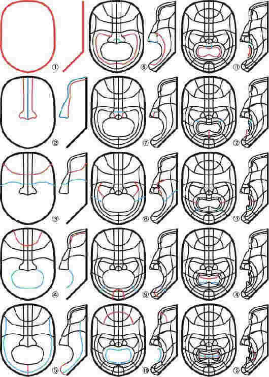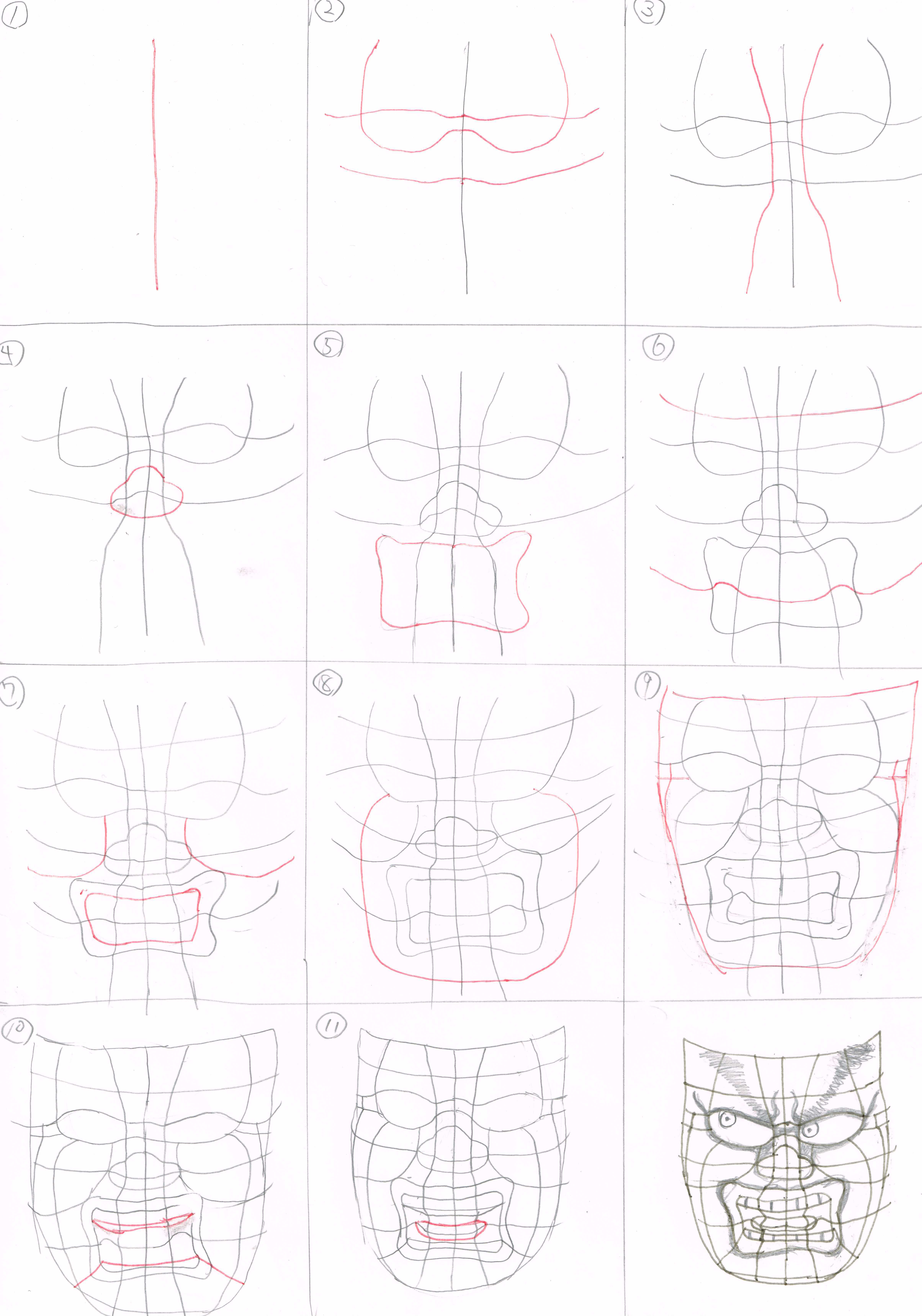 線を入れる順番ですが、顔の中心から作っていくと作りやすいと思います。複雑さでは口の中が一番ですが、例によって最初の縦中心線がもっとも難しいです。