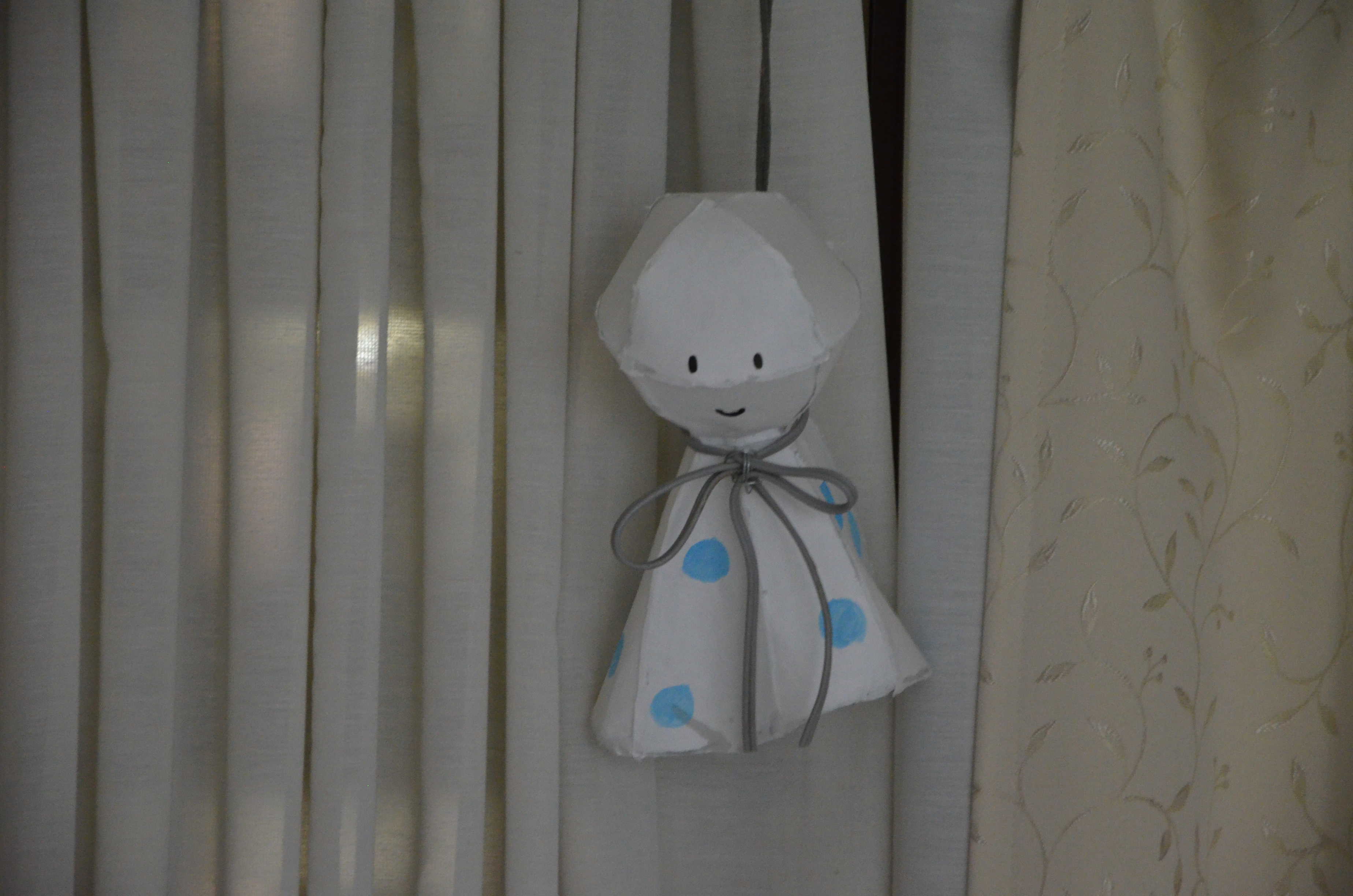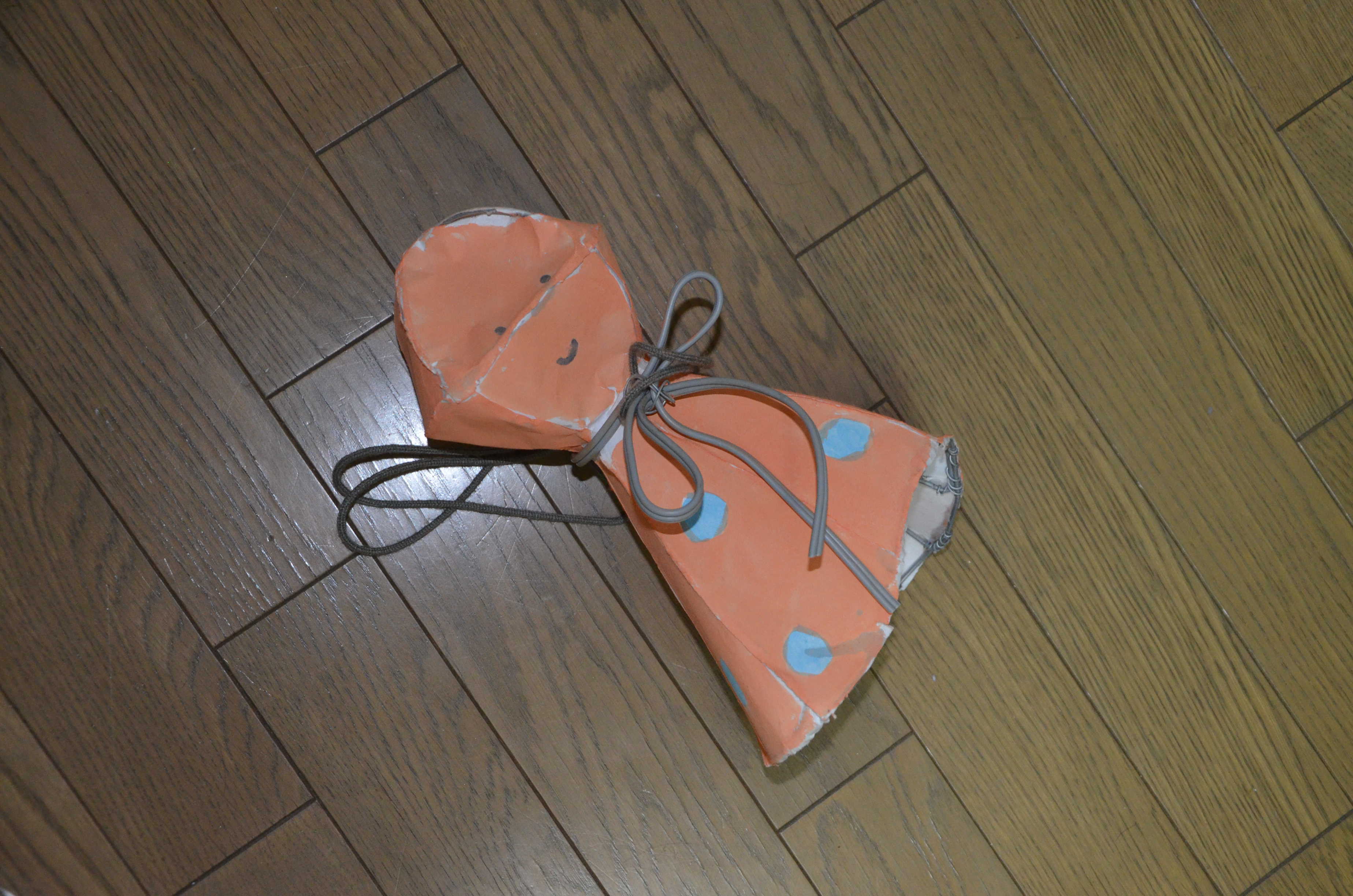 試し塗りの犠牲になったてるてる坊主くん。(余談ですが、このてるてる坊主は65thの行灯行列前日の夜に作りました。65thの行灯行列の日は台風が直撃しそうだったのですが、晴れました。)