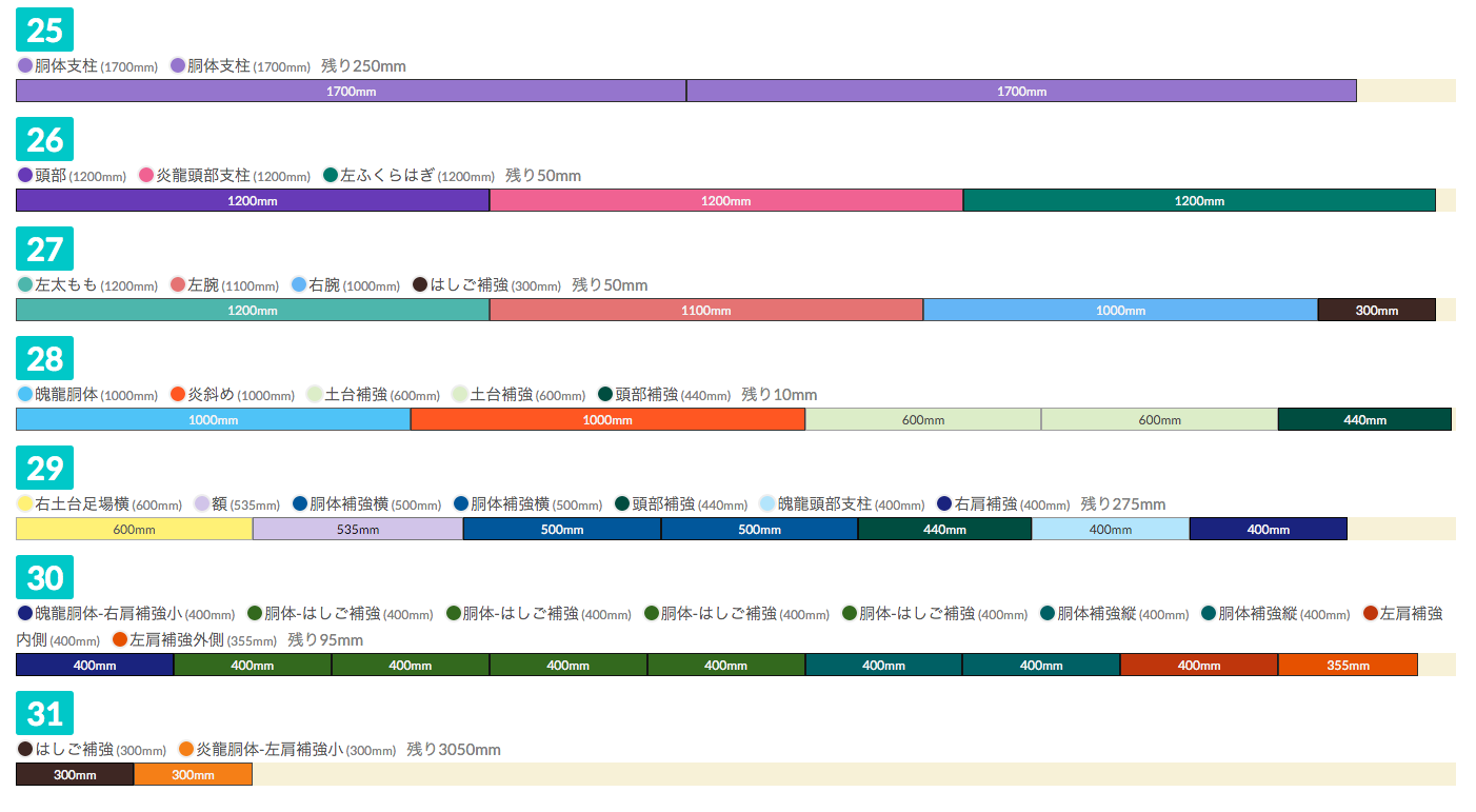 ということで、5月の発注前に、構図を決め、支柱を設計し、どの長さの木材がどのくらい必要なのかを出したとします。しかし、木材発注はその長さピッタリの木材を発注できず、すべて一律3650mmで発注しなければいけません。したがって、必要かつ十分な量を発注するためには、必要な支柱をどのように組み合わせて切れば、余りが最小になるかということを考えなければいけません。