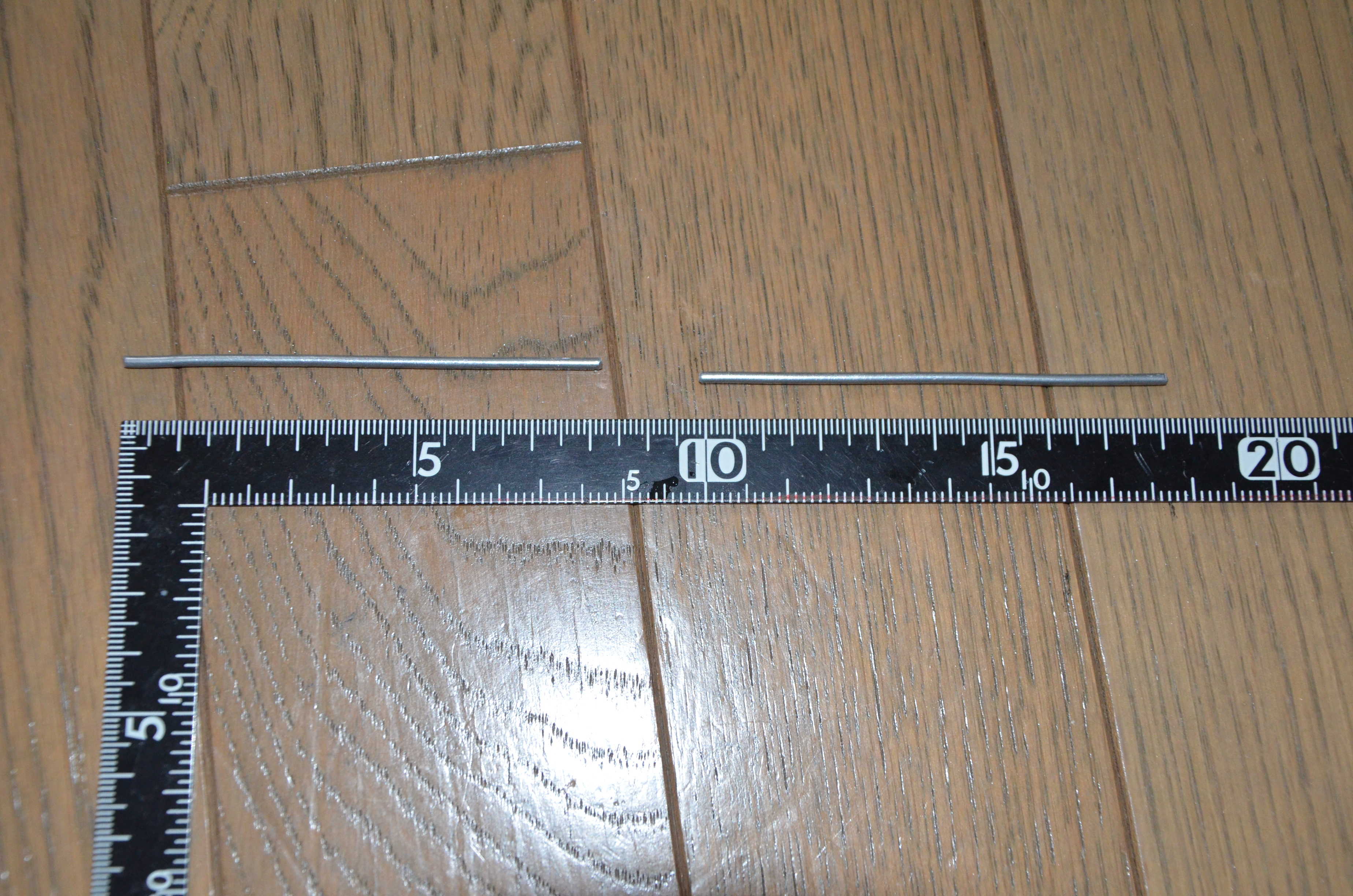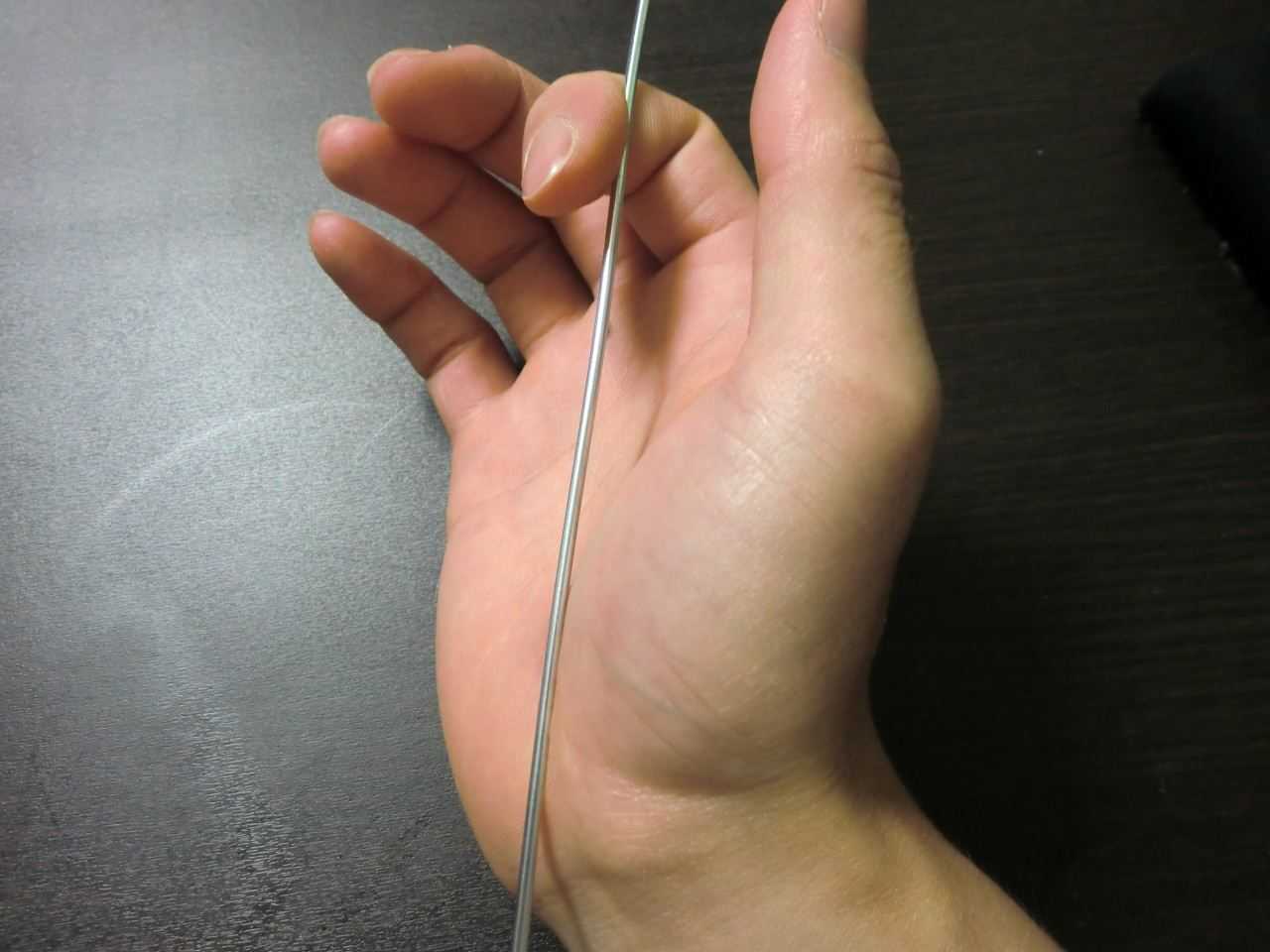 針金は始め円状の束になっていますが、曲線の凸の部分に対して均等に力を加えていき、まっすぐにしていきます。自分は親指の付け根のふっくらした部分と小指の付け根のふっくらした部分の間の溝になっている部分(ほとんど手首)と、人差し指の第1関節に針金を当てて伸ばす方法を使っています。(画像参照)