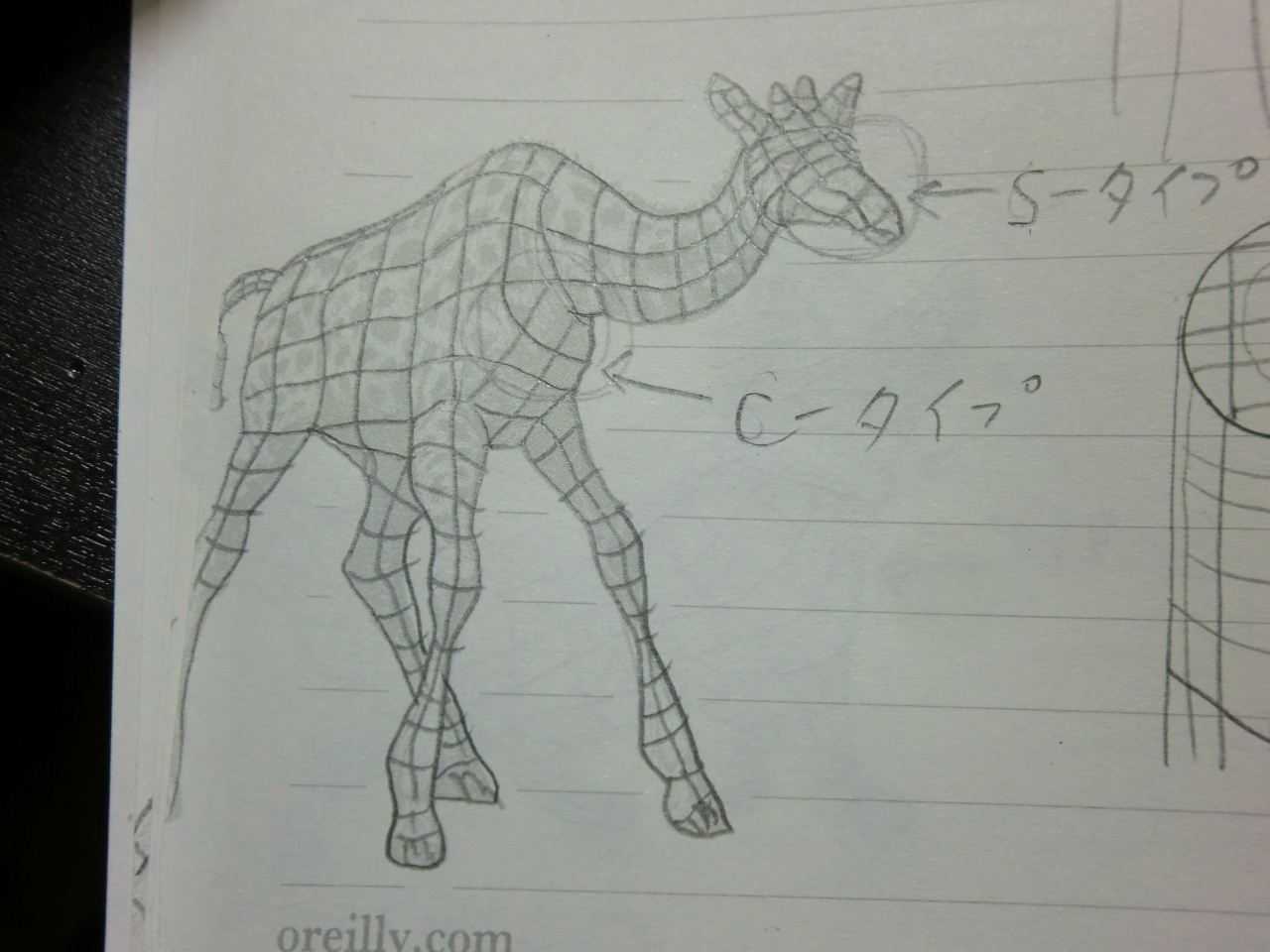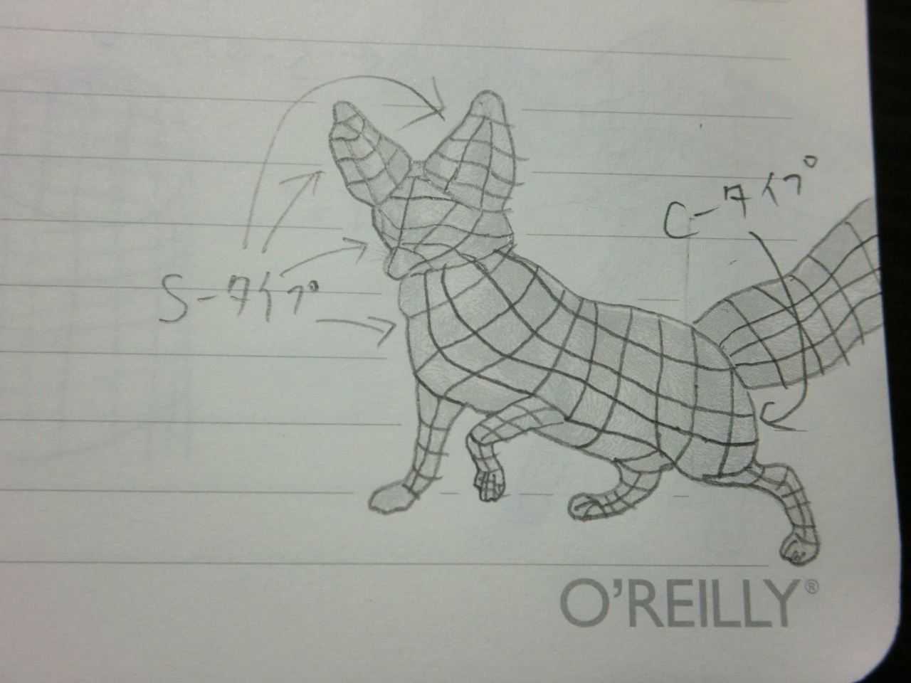 このように、球体の作り方と立方体の作り方でどのような物体でも作れるようになります。ここで、球体を作るような格子の張り方をS型(Sphere Type)、立方体の張り方をC型(Cube Type)と呼ぶことにします。