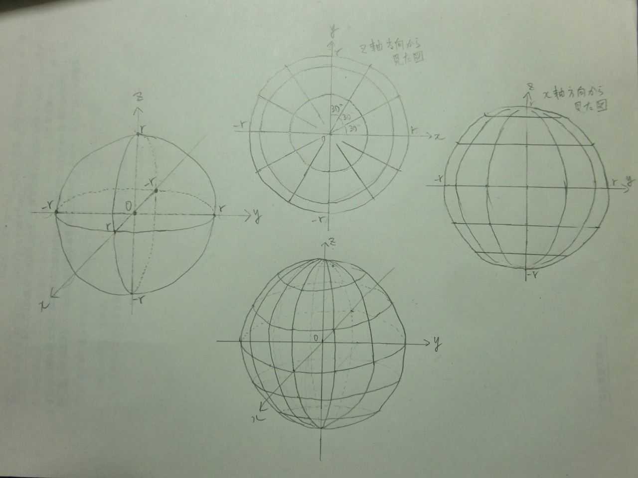 まずは球体です。地球の緯度と経度のようにします。(ここでは30°にしてありますが、22.5°でも18°でも構いません。角度を揃えることが重要です)
