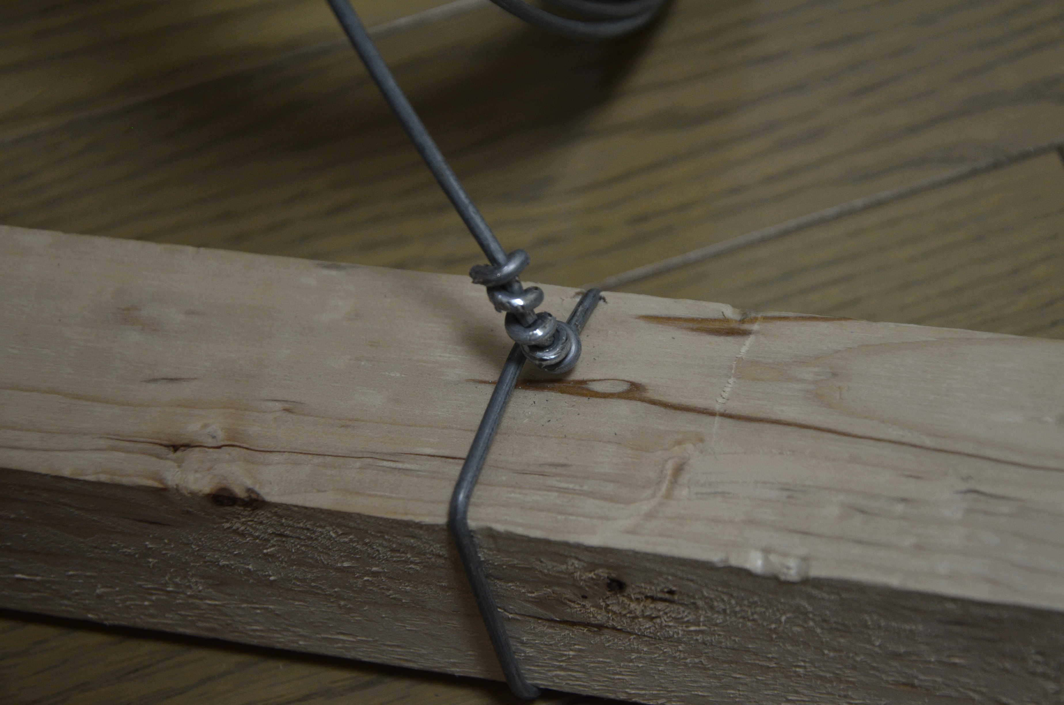 針金を伸ばし、支柱格子間の針金と固定します(格子の針金と木材格子間の針金はT字になるはず)。格子の針金はまだ束につけたままにしておくとよいです。