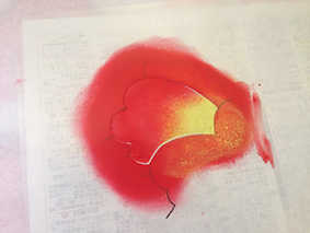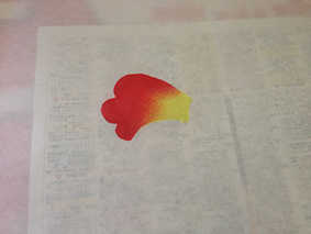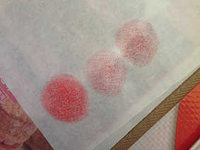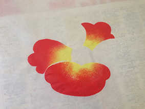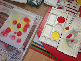 パレットにインクを少量出し、ぽんぽんにつけます。1色につきパレットを2枠使い、1つにインクを入れ、もう1つにぽんぽんを置くようにすると調節が楽です。インクはあまりがっちりつけず、さらに調節用紙でガーゼの目がスタンプのように見えるまで落とします。(多すぎると型からにじんでしまうので…)