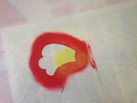 1枚目の型を使って塗っていきます。グラデーションをつけるので、まず半分だけ塗ります。2色目と重なる部分を考慮して塗る範囲を決めてください。今回は淡色から塗っていますが、逆にするとまた雰囲気が変わるので柄や色よって試してみるといいでしょう。