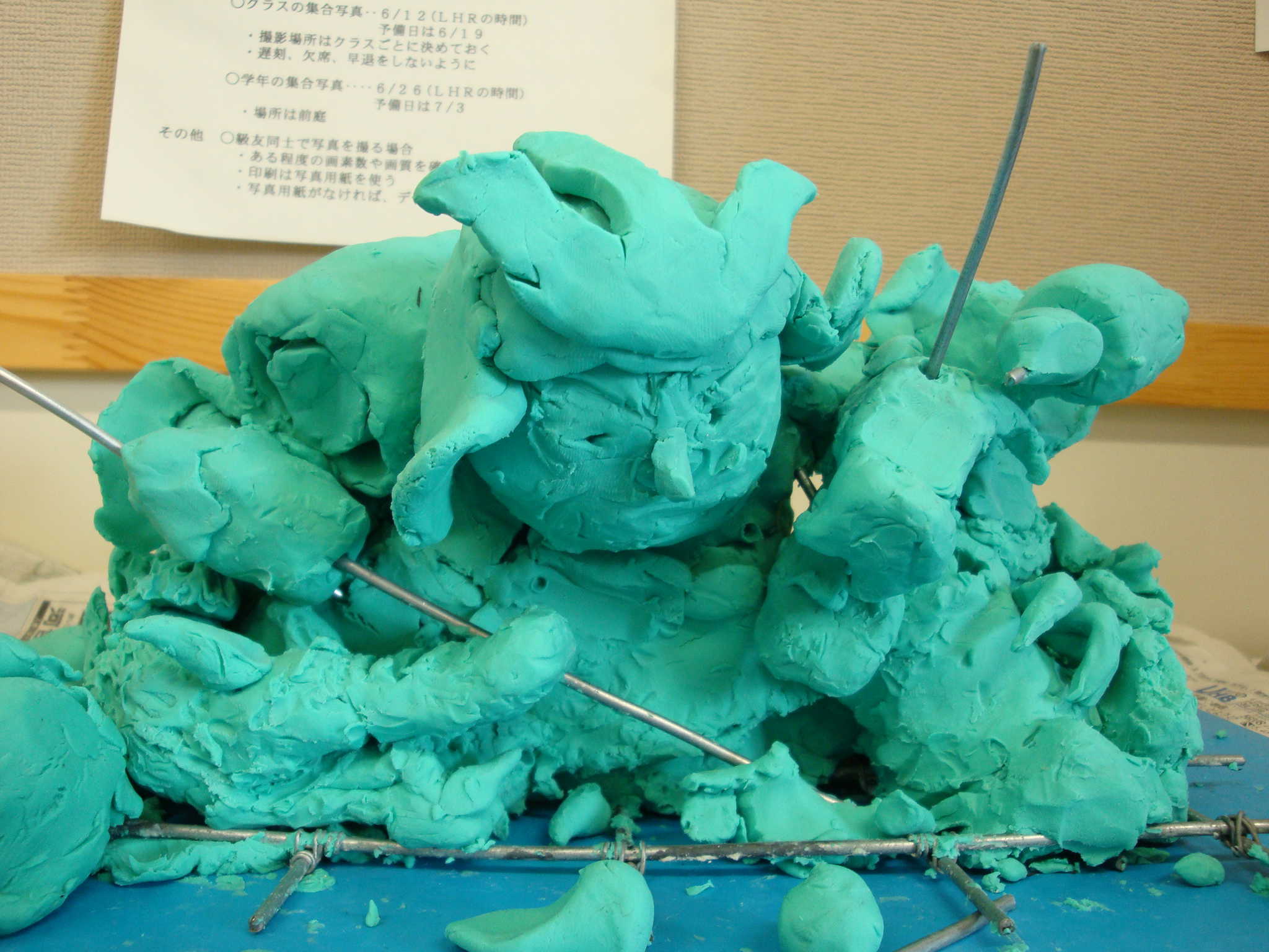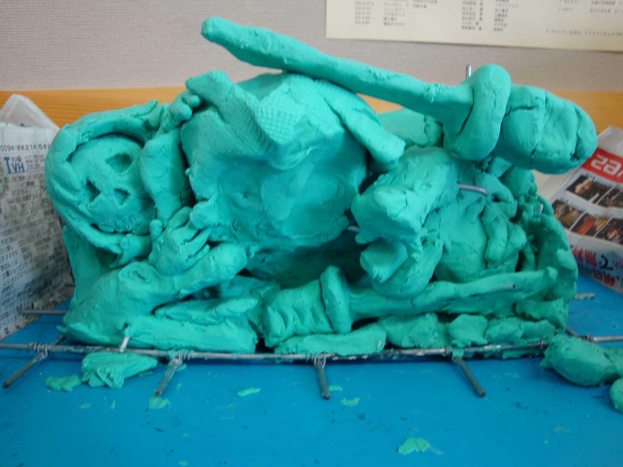 また、粘土なのですがこれもできればちゃんと紙粘土で精密に、かつ色を塗るところまで作っておくと、作業期間中かなり楽になりますし、一体感を保ちやすいと思います。油粘土で大雑把なところを考え、下絵を描き、紙粘土で立体にする、という順番かなと思います。