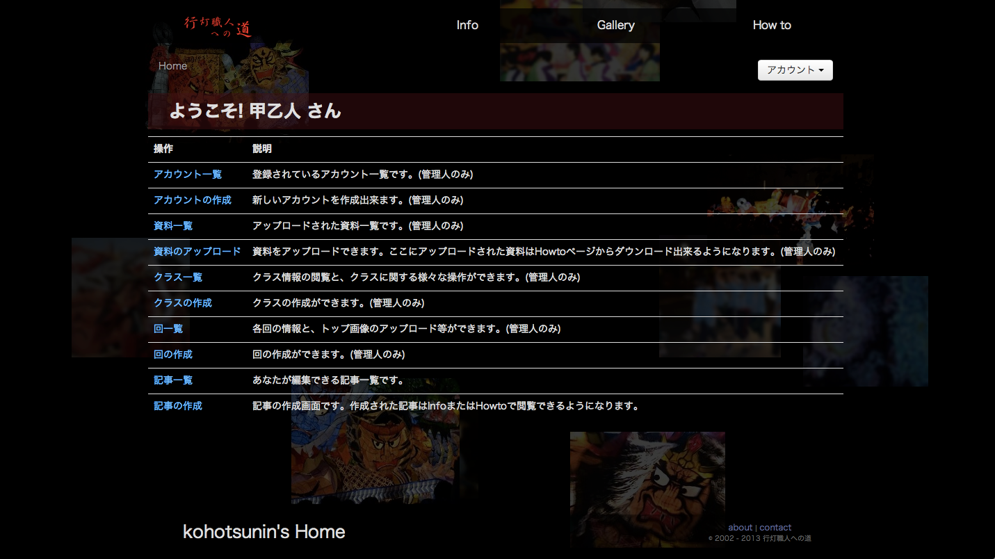 今までの管理はギャラリーの更新など、ものすごく面倒だった(御家人さんのトップトーク過去ログ参照)のですが、僕の最後の仕事(?)として、サイト上で更新作業をものすごく簡単にできるようにしました。