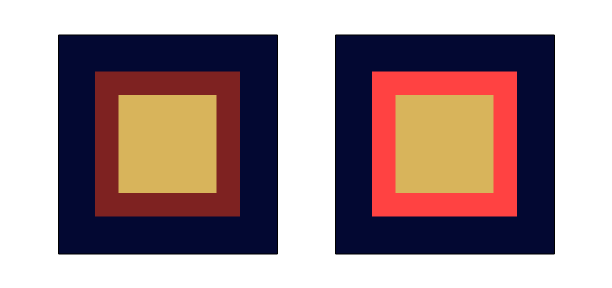 下の画像は行灯の輪郭に明るい色を置いた場合と暗い色を置いた場合の比較画像で、これを見ると、(少なくとも私は) 明るい色の方が大きく見えます。この二つの画像は同じ大きさで、外側の黒、中の肌色は同じ色、間の赤は色合い・彩度は同じで明度だけを変えています。間の色が行灯の輪郭を表しているつもりです。