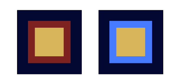 目の錯覚で赤系は膨張し青系は収縮すると言われているので、赤系の暗い色と青系の明るい色も比べてみます。