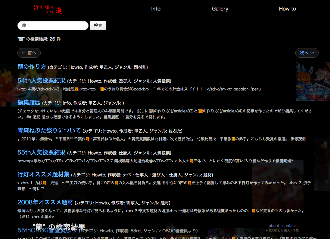 効果的な使い方としては、題材で検索してみるのがおすすめです。例えばあなたが龍を作りたくなったとすると、検索ページで「龍」と検索すると龍に言及しているページがいろいろ出てきます。