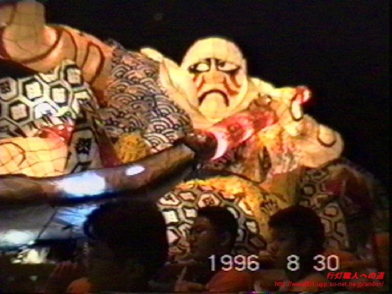 - 弁慶という題材とこの行灯がベストマッチしいている。まさに作戦勝ち。これも群を抜いていて、文句なしの大賞です。この写真だけではよくわかりませんが、構図も針金も電飾も相当上手いと思います。剣の電飾はあれですが、全体的に光ってますし。色に関しては、柄が弁慶の時代を表現していてとても素晴らしいと思います。肌色(美白)もよく透けていて綺麗ですし、腕や顔の墨入れに『赤と黒』を使ってるあたりが凄い。改めて『やはり大賞作品は一味違う』と実感させられました。この行灯の画像を持っている人は是非送っていただきたいです。どうかよろしくお願いしますm(__)m