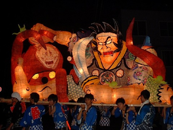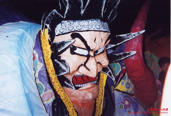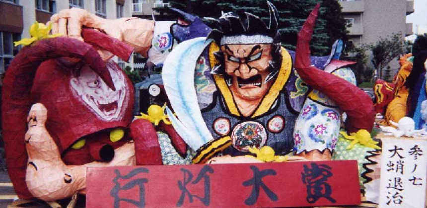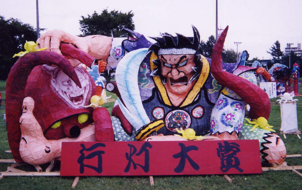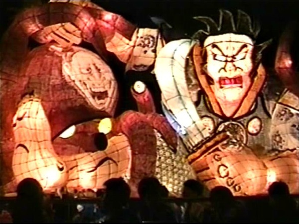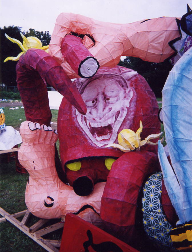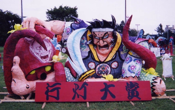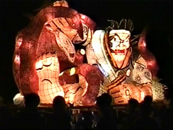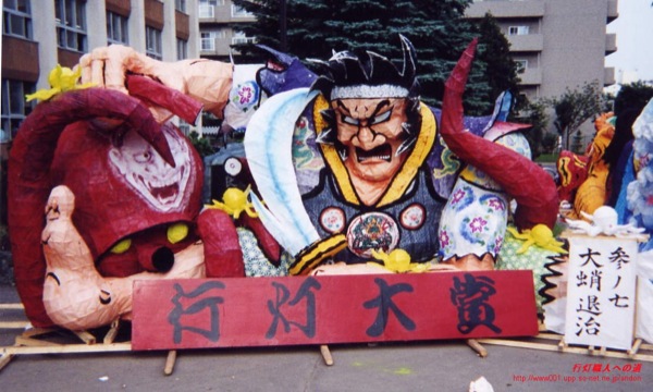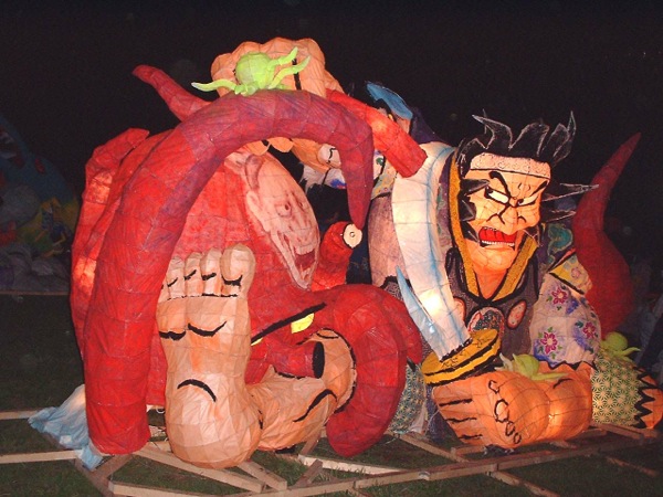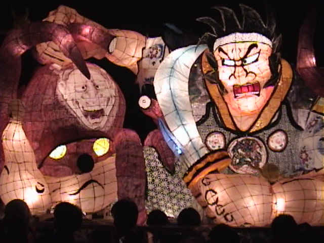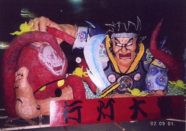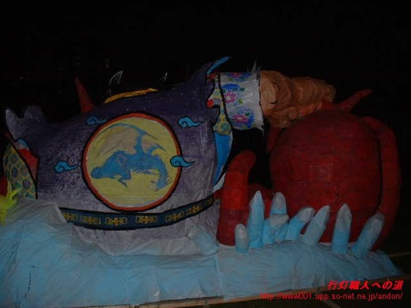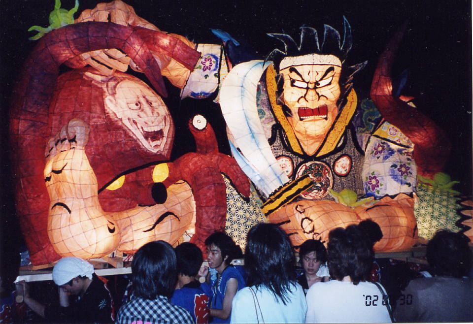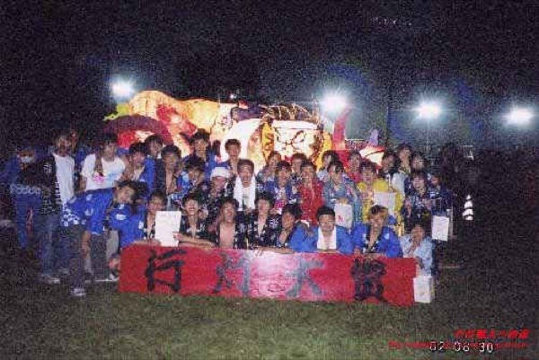 - 勝因は大きく分けて4つある。①H君の電飾、②I君の作った顔、③Nさんの描いた般若、④強烈な『タコ』…本当にこれらがなければ絶対に大賞なんか無理だったと思う。『タコ』と言うと、ユーモア賞を取るリスクが高そうだったり、下手したらウケ狙いの行灯になり兼ねない題材だが、ダイナミックな針金とタコの般若により、少し怖いくらいリアルで迫力のある作品に仕上がっている。ちなみに子蛸は51stの鬼蜘蛛のDNAを受け継いだもの。あと女子の人数分の燈籠も作った。浴衣を着た女子がこれを持って歩くと華やかで品があり、見物客の皆様(特に女性の方々)に好評だったらしい。構図は、空間の使い方や進行方向や遠近法を考えていて非常に趣向を凝らしたものになっている。電飾はバッテリー12個と数は平均的だが、新品でパワフルだったのと、あと電飾職人H君の卓越した電飾技術により、全体的にまんべんなく明るくなっている。配色は原色などの濃い色は使用していなく、肌色は美白系であるため、光がかなり透けやすく、その効果が抜群に現れている。しかし、配色の美しさ・柄の美しさなどの面ではかなり劣っている感が否めない。実はクラスに紙塗り職人の層が薄く、この点で教室では非常に苦労していたらしい。でもその短所を、光ったときの事を考慮した配色や明るい電飾や迫力のある針金などでカバーできたからこそ、行灯大賞を受賞できたのであろう。こんなふざけた題材が大賞を取ってしまったせいかどうかは分からないが、54th行灯行列は行灯史上でも稀に見る、いい意味で奇抜な題材だらけの年となる…(苦笑)。
