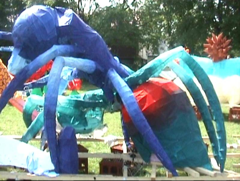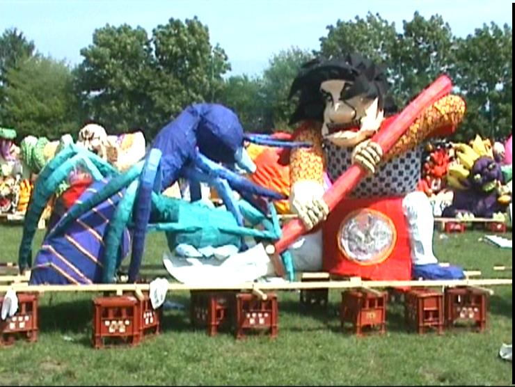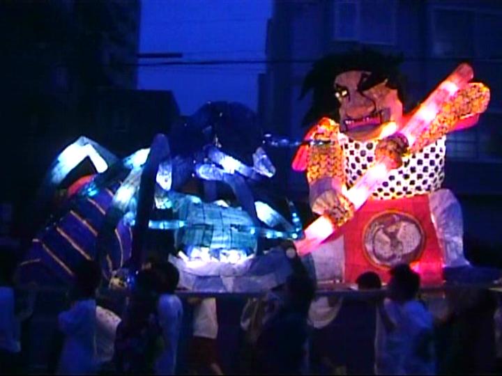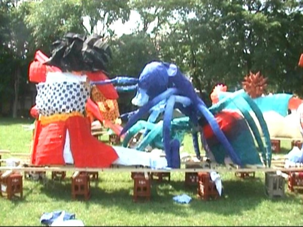 蟻という奇抜な題材。普通なら蟻に見えるように作るだけでも超困難だが、この作品はいとも簡単に『蟻』を成功させている。誰が見ても蟻だと分かるほどの完成度。冷静に考えてみるとそれはかなり凄い事だ。蟻の針金・色は素晴らしかったが、電飾で全体が光っていなく、とても勿体無かった。蟻全体が光ったところを見たかった。人の針金と紙貼りは他のクラスに比べてやや雑な感じもするが、人の電飾と配色・柄はとても素晴らしかった。来年も期待しています。