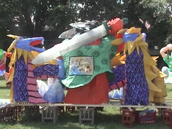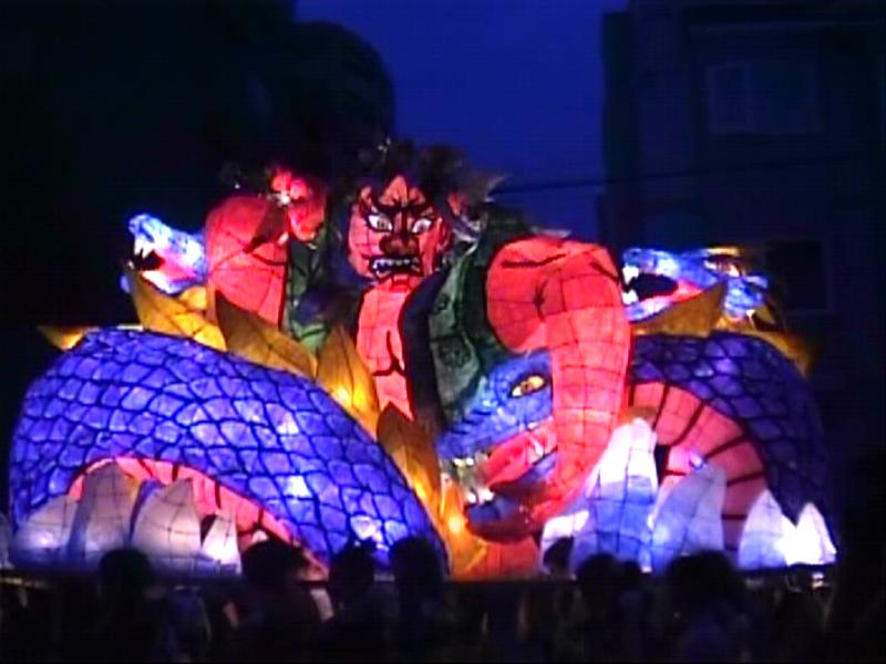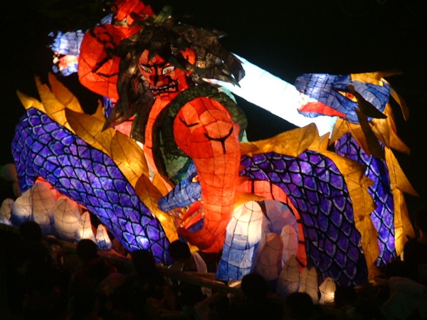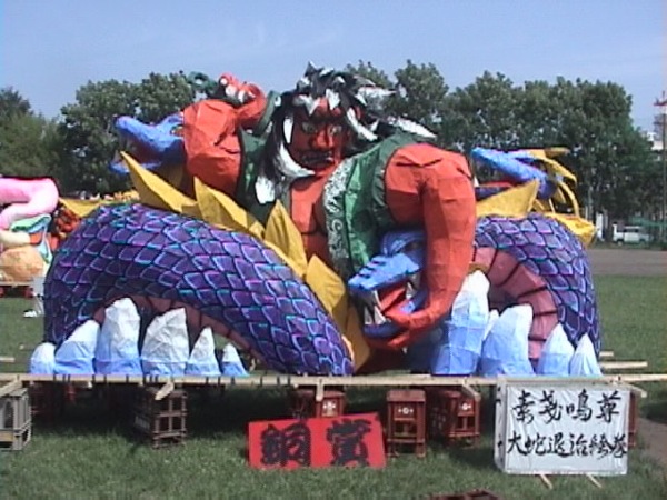 二年生で龍三匹を作るという姿勢が素晴らしいだけでなく、針金の技術も二年生とは思えないほど素晴らしかった。構図も迫力があった。龍の色も光が透けた時とても綺麗だった。表側は人と龍が凄く絡んでいて良いのですが、欲を言えば、裏側も龍の体と人をもう少し絡めた方が面白かったかもしれません。例えば52nd三年金賞の裏側のような感じで。針金・電飾・配色・構図とどれを取っても高得点で、とても完成度の高い行灯でした。来年も期待してます。