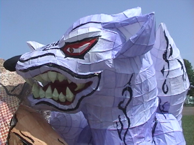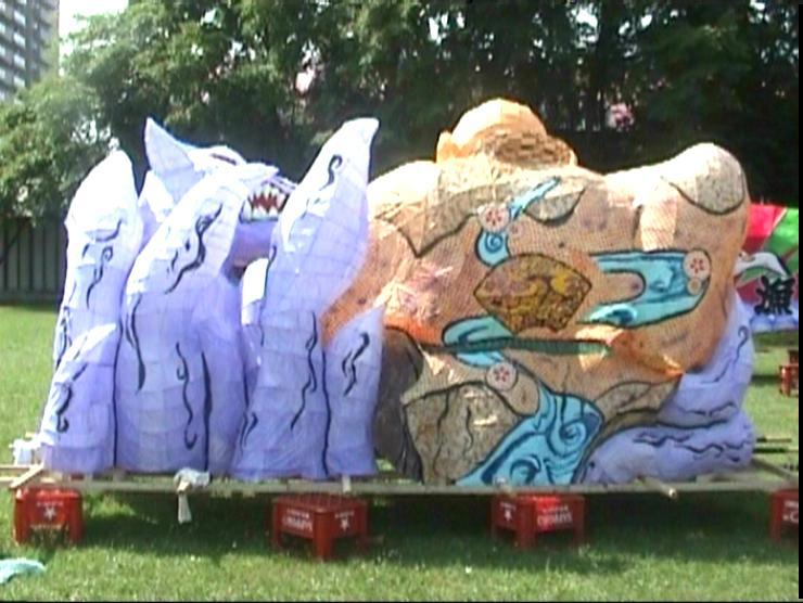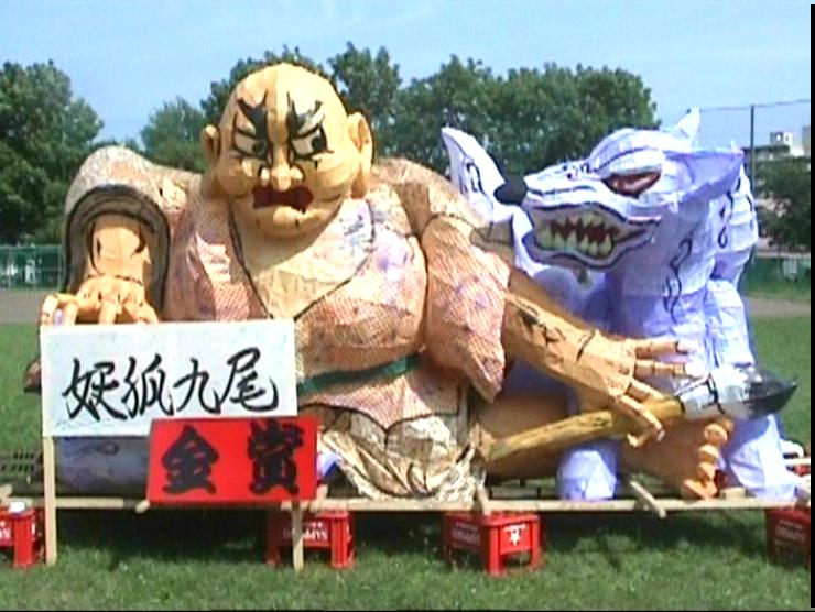 - まずこの行灯を見て目が釘付けになったのが妖狐の迫力と美しさ。妖狐の顔の針金がとても精密でなおかつ迫力があった。紙貼り・墨入れも非常に素晴らしかった。ちなみに、この針金を作っていたのは女の子らしいです。やはり近年、女子の針金職人のレベルは飛躍的に伸びていると思います(1-8の顔も女の子が作ったらしいですし)。この妖狐の薄紫色という絶妙なカラーが、夜光ったときに幻想的で魅力的な世界観を生んでいる。人の針金は上手いが、手(指)があまりにも細くて小さいために、やや電飾で苦戦していたのではと思われます。筆を持つという発想は今までになく、斬新だった。人の服の柄は美しいのだが、肌色と色が類似していたために夜光ったときにやや同化してしまっていたのが勿体無かった。この辺は盲点だったかもしれない。来年も期待しています。