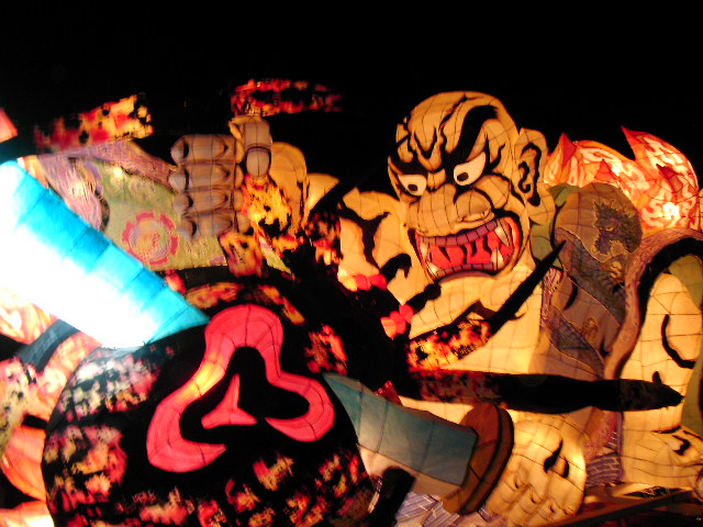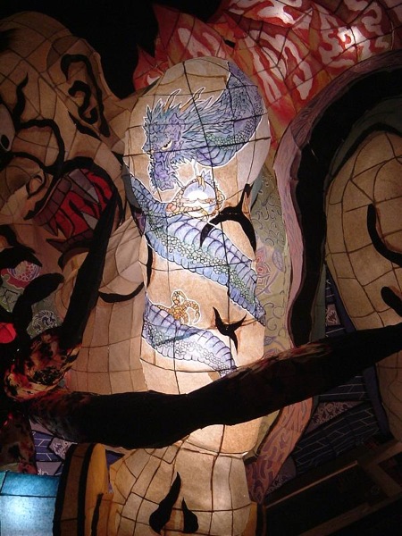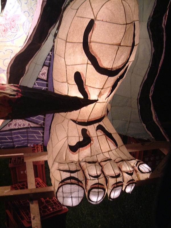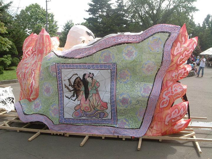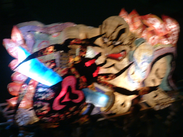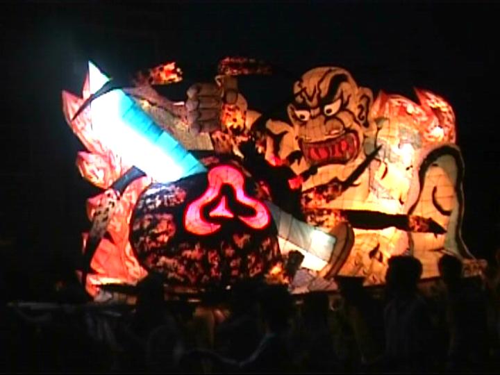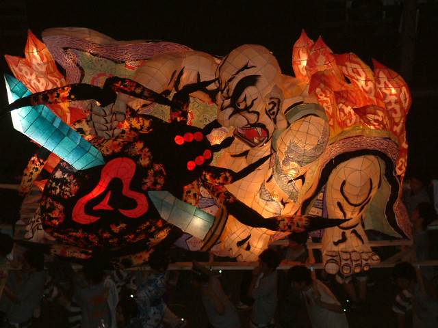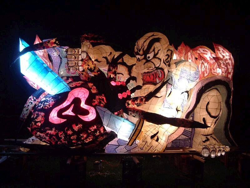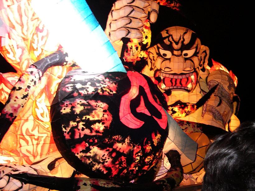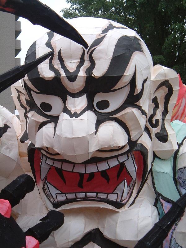 - 『完成度の高さ』・『色の美しさ』・『針金の正確さ』・『紙貼りの丁寧さ』において、今年の行灯の中で最も優れていました。そういう意味で文句なしの行灯大賞だったと僕は思います(三年生は本当にレベルが高く僅差でしたが…)。針金は全体的に丁寧かつ正確。特に手・足・顔は今年の中で最も正確で丁寧なつくりだった。これほど丁寧なつくりの手足顔は過去にも見たことがない。墨入れも完璧だった。電飾は全体的にしっかり光っていた。蜘蛛は色・電飾があまりにも難しい。ところがこのクラスは、黒とオリジナリティあふれる奇抜な柄のおかげで大成功だったと思う。夜光ってもメリハリがあって素晴らしかった。作戦勝ちとはまさにこのこと。だが、人の肌色の明るさが物足りなかった気がしてしまった(この行灯を見る前に1組の有り得ないほど明るい電飾を見せ付けられていただけに…)。紙塗りは歴代最高レベルと言って過言ではないでしょう。一般的に使う紙とは違う高級紙を使ったらしいが、言うまでもなく、それを凌駕するだけの高い塗りの技術も備わっていたからこそ成功できたのだと思う。特にロウの使い方が神業で、裏の絵・腕の龍・炎のグラデーション・服赤と黒の柄etcで使っている。ロウを塗った部分と、普通に色を塗った部分の光の透け具合に微妙な差が出て、これが何ともいえない絶妙な光のコントラストを奏でている。それがどれほど美しいものであるかは裏側の絵を見れば一目瞭然であろう。まさに神業。この写真を見て『くっそー裏が光ったところもぜひ生で見ておけばよかった…』と本気で悔やむ人も多いのではないだろうか(ま、審査の都合上、表しか見れなかった僕のことですが(泣))。とにかく本当にこのクラスの紙塗りの女子には脱帽でした。 ただ、以上で述べた部分があまりに優れていて素晴らしい出来だっただけに、行灯評論家としてついつい要求したくなる部分も出てしまいました(あくまでも個人的な意見ですので読み流してください)。まず蜘蛛を貫いた剣。発想は素晴らしいんですが、例えば蜘蛛の体液・血を剣に付着させる等のもう少しリアリスティックな生々しさが欲しかった(もちろん優秀な職人である彼らならその辺については十分検討したと思うけど)。実際に蜘蛛を剣で貫いたらべっとりと生々しい血や体液が付着するはずなので、僕個人としてはどうもイマイチ蜘蛛が剣で刺されている感じがしなくてそこが残念でならなかった(しかもタイトルが『土蜘蛛死ス』なだけに…)。あともう一つ、右手の蜘蛛の足を掴むという発想も素晴らしいのですが、この右手がどの方向に動いているのか分からなく、手前に引いているのか?、押しているのか?、それとも蜘蛛の足を引きちぎろうとしているのか?…この辺がいまいち伝わりませんでした(これもかなり個人的な意見ですが)。