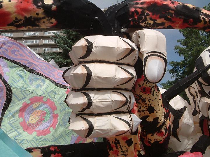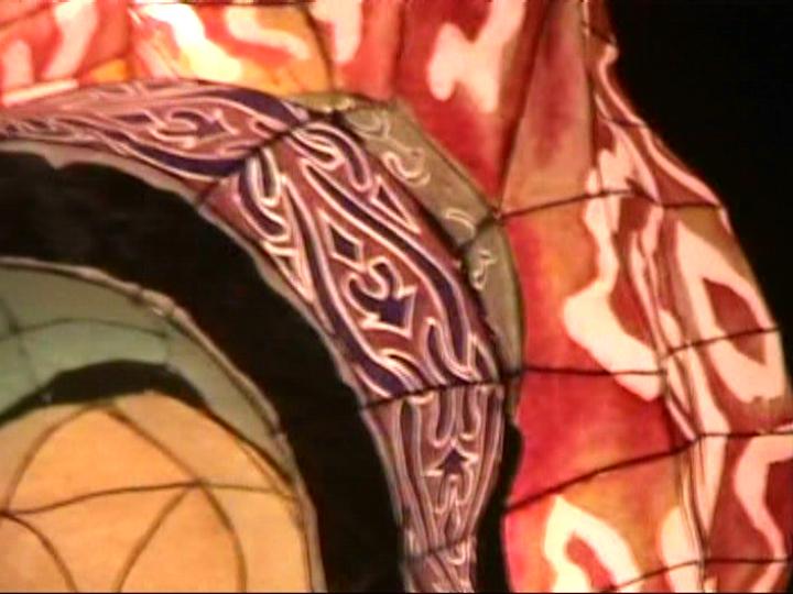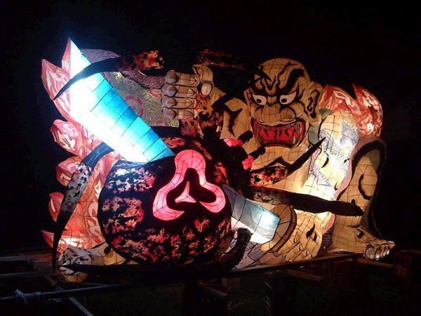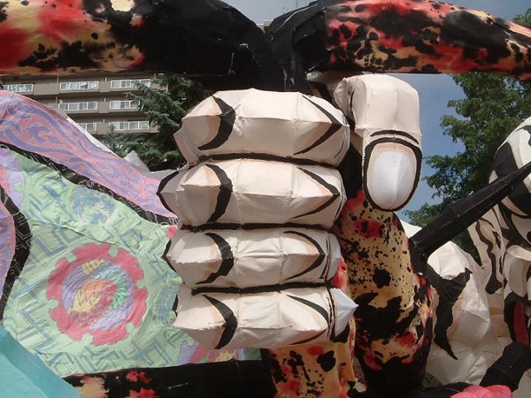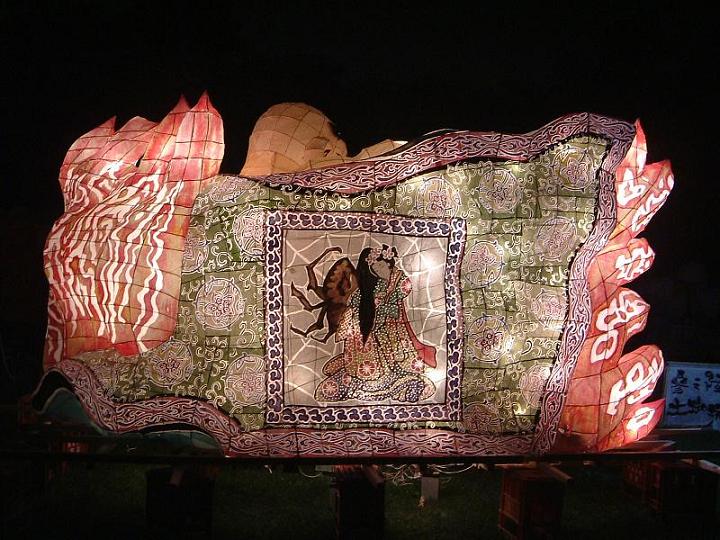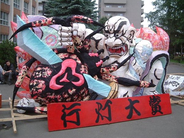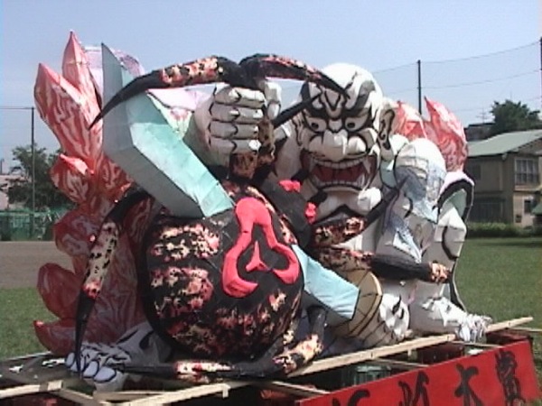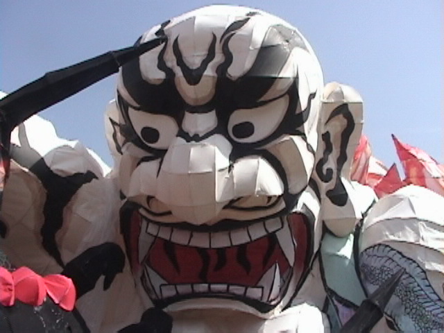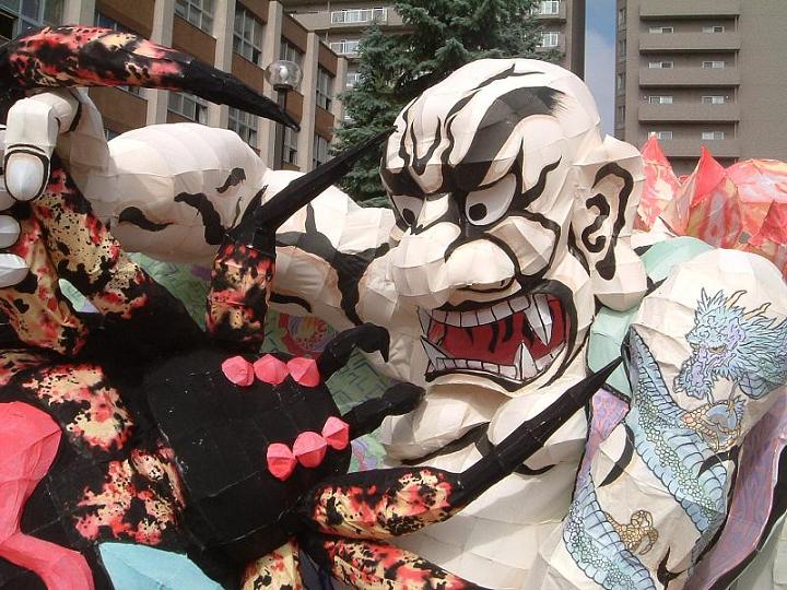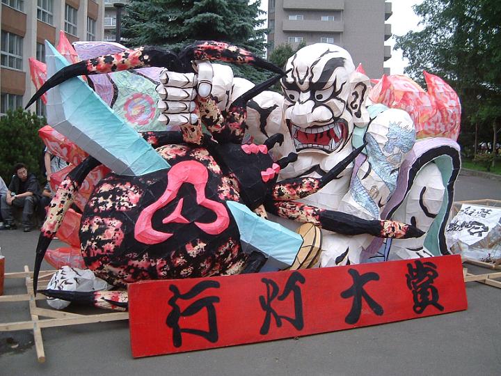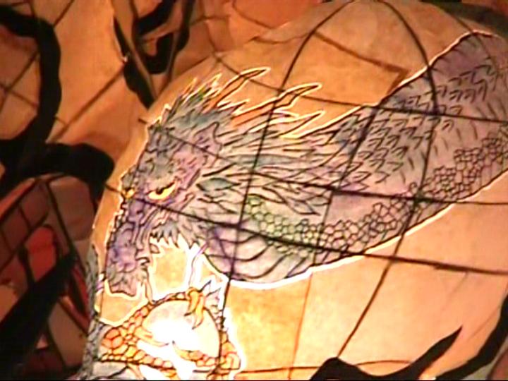 - 『完成度の高さ』・『色の美しさ』・『針金の正確さ』・『紙貼りの丁寧さ』において、今年の行灯の中で最も優れていました。そういう意味で文句なしの行灯大賞だったと僕は思います(三年生は本当にレベルが高く僅差でしたが…)。針金は全体的に丁寧かつ正確。特に手・足・顔は今年の中で最も正確で丁寧なつくりだった。これほど丁寧なつくりの手足顔は過去にも見たことがない。墨入れも完璧だった。電飾は全体的にしっかり光っていた。蜘蛛は色・電飾があまりにも難しい。ところがこのクラスは、黒とオリジナリティあふれる奇抜な柄のおかげで大成功だったと思う。夜光ってもメリハリがあって素晴らしかった。作戦勝ちとはまさにこのこと。だが、人の肌色の明るさが物足りなかった気がしてしまった(この行灯を見る前に1組の有り得ないほど明るい電飾を見せ付けられていただけに…)。紙塗りは歴代最高レベルと言って過言ではないでしょう。一般的に使う紙とは違う高級紙を使ったらしいが、言うまでもなく、それを凌駕するだけの高い塗りの技術も備わっていたからこそ成功できたのだと思う。特にロウの使い方が神業で、裏の絵・腕の龍・炎のグラデーション・服赤と黒の柄etcで使っている。ロウを塗った部分と、普通に色を塗った部分の光の透け具合に微妙な差が出て、これが何ともいえない絶妙な光のコントラストを奏でている。それがどれほど美しいものであるかは裏側の絵を見れば一目瞭然であろう。まさに神業。この写真を見て『くっそー裏が光ったところもぜひ生で見ておけばよかった…』と本気で悔やむ人も多いのではないだろうか(ま、審査の都合上、表しか見れなかった僕のことですが(泣))。とにかく本当にこのクラスの紙塗りの女子には脱帽でした。 ただ、以上で述べた部分があまりに優れていて素晴らしい出来だっただけに、行灯評論家としてついつい要求したくなる部分も出てしまいました(あくまでも個人的な意見ですので読み流してください)。まず蜘蛛を貫いた剣。発想は素晴らしいんですが、例えば蜘蛛の体液・血を剣に付着させる等のもう少しリアリスティックな生々しさが欲しかった(もちろん優秀な職人である彼らならその辺については十分検討したと思うけど)。実際に蜘蛛を剣で貫いたらべっとりと生々しい血や体液が付着するはずなので、僕個人としてはどうもイマイチ蜘蛛が剣で刺されている感じがしなくてそこが残念でならなかった(しかもタイトルが『土蜘蛛死ス』なだけに…)。あともう一つ、右手の蜘蛛の足を掴むという発想も素晴らしいのですが、この右手がどの方向に動いているのか分からなく、手前に引いているのか?、押しているのか?、それとも蜘蛛の足を引きちぎろうとしているのか?…この辺がいまいち伝わりませんでした(これもかなり個人的な意見ですが)。