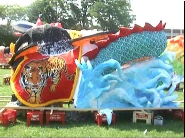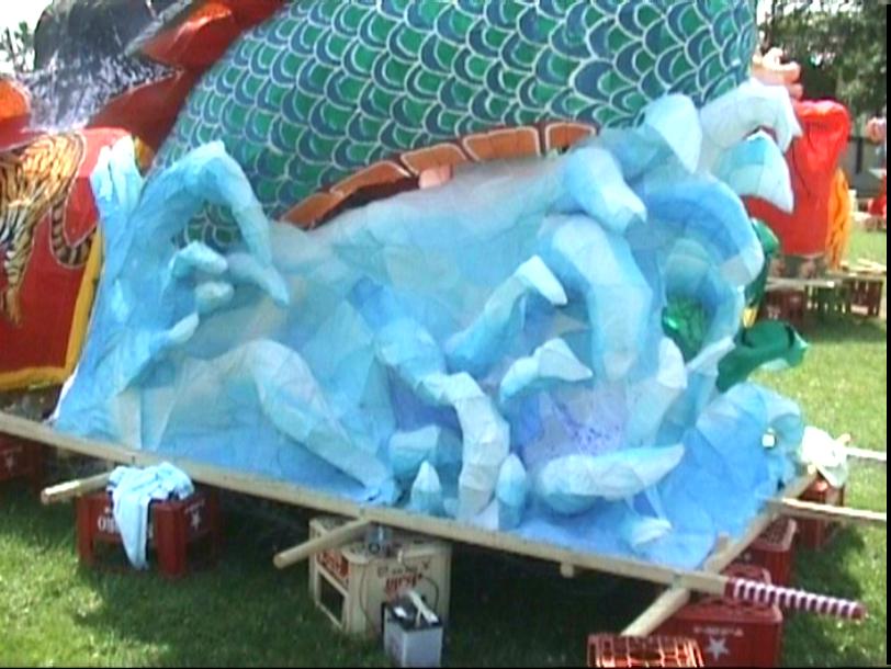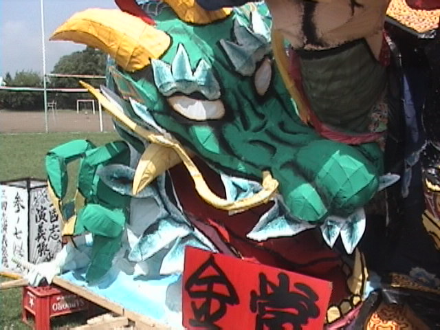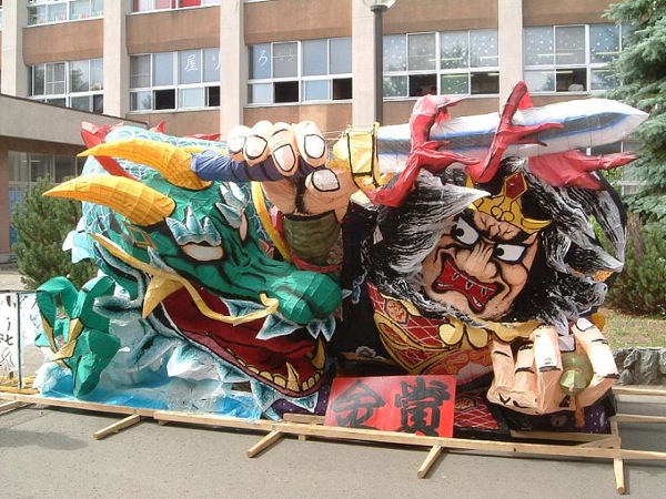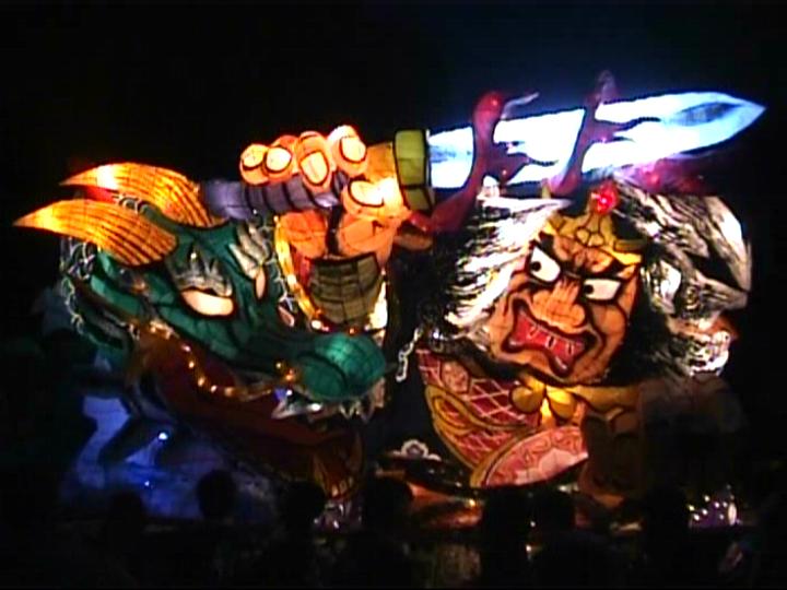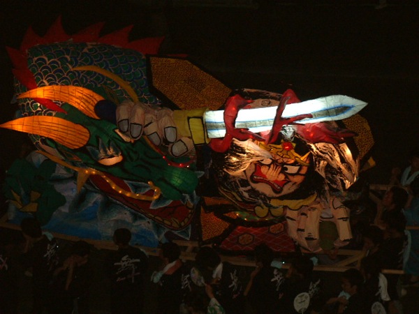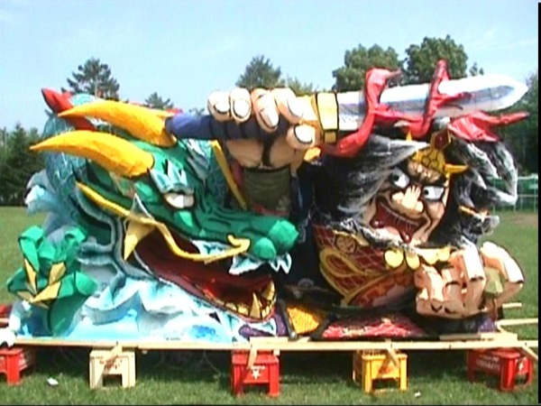 - 審査員によっては大賞でもおかしくなかった。もしこの作品が違う時代に生まれていたら間違いなく大賞だったと思う。それくらい素晴らしかった。具体的には、『顔の針金・墨入れ』・『龍の針金の迫力・正確さ』・『髪の墨入れ』・『人と龍の流れるような自然な勢いと迫力』・『青い波の美しいさ』が特に素晴らしかったと思う。特にこの顔に関しては『最も強いと書いて最強』だった。本気でねぶた大賞をあげたかった。この顔の迫力は間違いなくねぶたの領域に達してます。むしろ超越しています。波も非常に難しいのですが、見事に成功しています。ナタク(51st大賞)と少し似ている気がする(?)が、構図的にはこちらの方が優っていると僕は思う。この『人と龍の流れるような自然な勢いと迫力』には感動した。ただ残念ながら龍・左手の電飾がやや暗かった。今年は電飾のレベルが高かっただけにそこが少し減点せざるを得ませんでした。でもあの龍の『濃い配色』・『細かくて複雑な構造』にも関わらず、これだけ光らせるだけでも素晴らしいですし、至難の技だとは思うのですが。