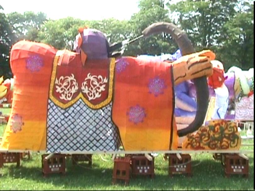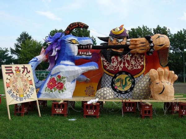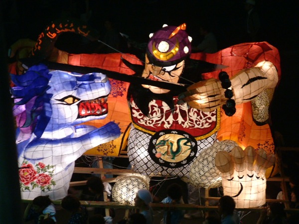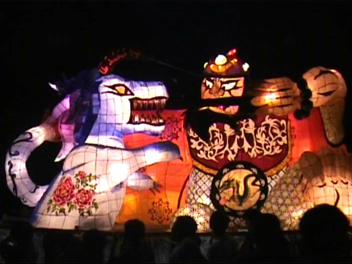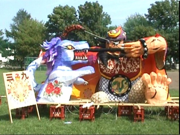 - もしこの作品が違う時代に生まれていたら間違いなく何らかの賞を獲得していたでしょう。それくらい素晴らしかった。事前審査で見たときは服の色が全体的にやや濃い感じだったので、夜光ったきに透けるかどうか心配だったが、予想以上に光がよく透けていて非常に綺麗だった。紙も塗り方に全くムラがなく、さすがは紙塗りの女子が多い文系クラスだと感動した。特にこの『茶色』がここまで美しくムラなく塗られた作品は過去においても珍しく、かなり腕の優れた紙塗り職人の女子が居たのだと思う。間違いない。『胸の茶色と白の模様』・『腹部の龍の絵』・『波斯の薔薇の絵』も芸術的で素晴らしかった。特にあの薔薇は絵とは思えないほど美しく、まるで本物の薔薇が浮かび上がっているのではないかと錯覚するほどリアルで美しい出来栄えだった。弓矢を引っ張るという発想も素晴らしかったが、前からでは少し分かりにくかった(裏側を見れば分かりやすかったが)。このクラスも特に目立った失敗がなく、針金・電飾・色塗り・構図と、総合的完成度が非常に高かった。