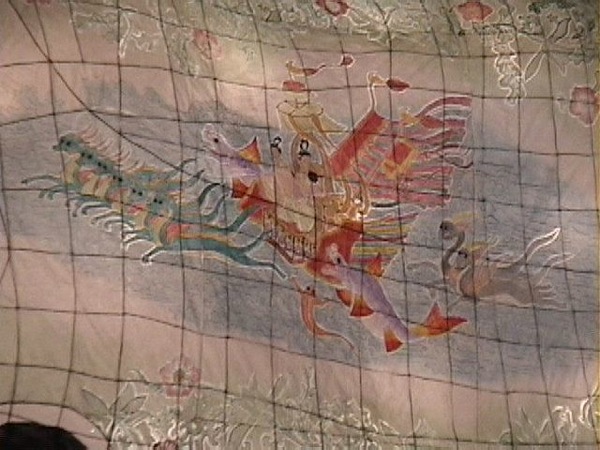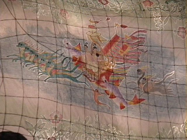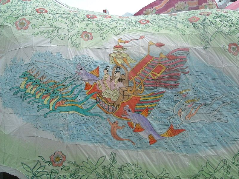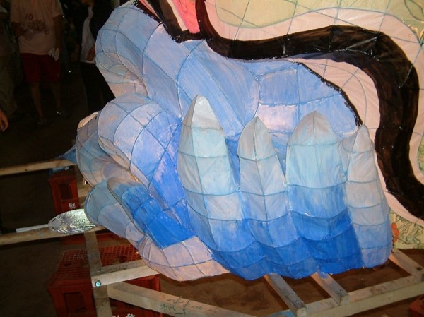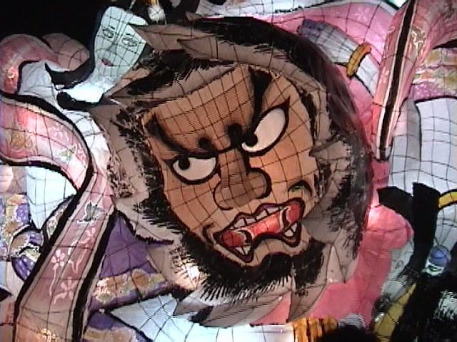 紫・桃色・水色・肌色が美しく、模様もとても綺麗だった。後ろの絵と、服の模様が56thの行灯の中でもダントツの出来映えだった。服の羽衣のふわふわした感じがとても柔らかかった。51stのナタクの羽衣を彷彿させた。 近年行灯に増加傾向にある「漢字の柄」と「ロウの柄」も素晴らしかった。薄い色の系統で上手くまとめたのは大成功だったと思う。また、色彩豊かなだけでなく、墨入れも上手いので全体的に力強い作品として引き締まっている。もしこれで墨入れが失敗していたら、全体がふにゃふにゃぼやけてしまい、ただ派手な行灯で終わってしまっていたかもしれない。 ただ、髪の毛の墨入れが失敗している(針金は上手いのだが…)。少しだけ墨を染み込ませた筆で、もう少し黒色のかすれた感じが出せたらなお良かった。黒のグラデーションがイマイチ出て無くて残念。白と黒がはっきり別れていてやや不自然。あと、ひげの部分の墨入れで、細かい黒線を一本ずつ書いてるように見えて、そこが残念(ただし、ひげや髪の毛は好みが別れるところだとは思うが)。時間が無かったのかもしれないが、ここの詰めがちょっと甘かったと思う。でも実際に行灯行列を見た時は、他の部分が素晴らしすぎて全く気にならなかった。