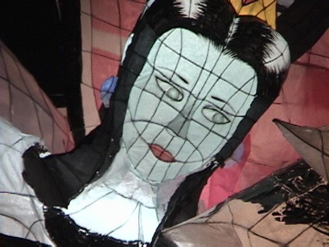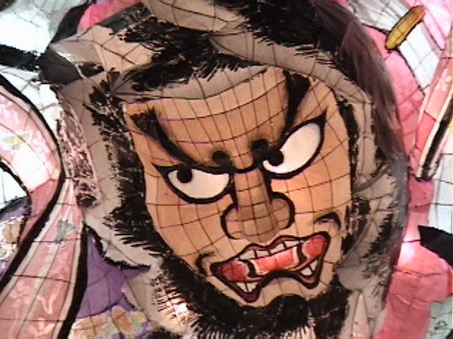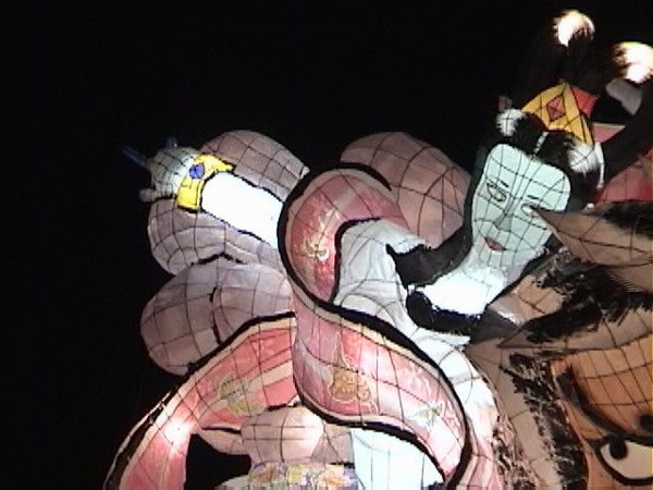 ただ、行灯行列の小さいサイズで人が中心に居るとどうしても窮屈になってしまう。本作では見事に成功させていてるが、よく見ると人の左右の腕が窮屈に見えなくもない。基本的にはねぶたのようなスケール向きの構図だと思う。 過去の作品を見ると左右に2体という構図が多く、この作品のように人の顔が中心にあるのは珍しく、とても新鮮だった。今後、後輩諸君がこういった人の顔が中心にくる行灯を作ろうとするときの貴重な資料になると思う。