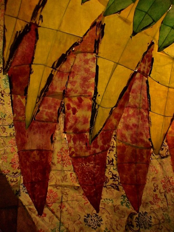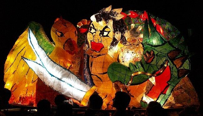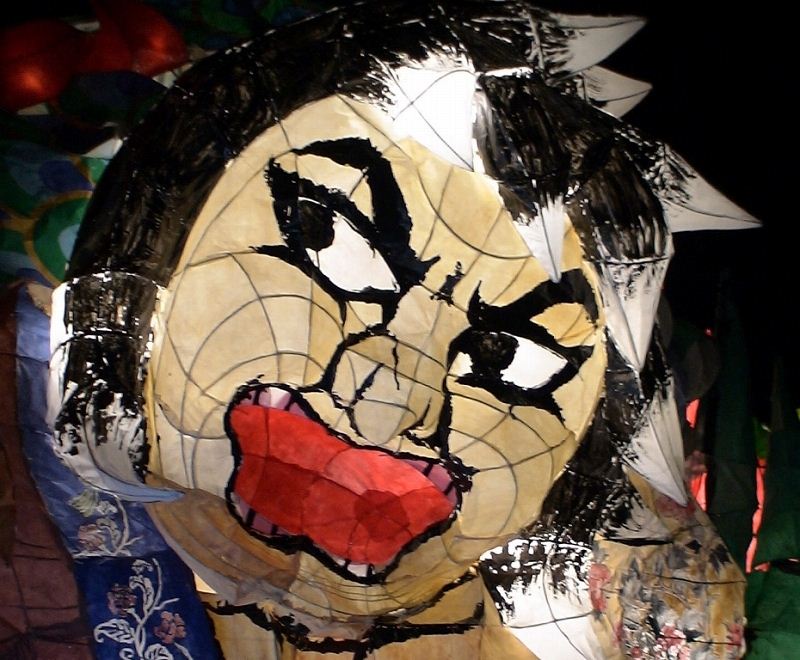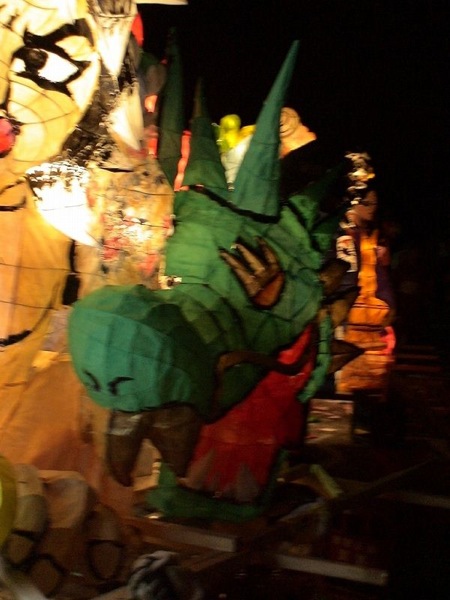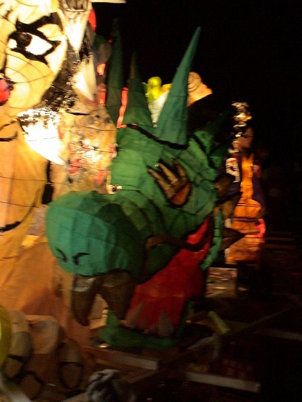 目立ったミスは、「鳥の顔の暗さ」「龍の胴体の一部の暗さ」の2点くらい。 鳥の顔は色塗りと電飾、どっちがミスをしたのかちょっとわからんかったけど(むしろどっちも?) 目も水色にしてたりしてるので、がっちり光ってほしかった。 ただ、それを補って余りある迫力をしめしたのが龍の顔。 これは相当レベルが高い。(MとHさん(←会った事無い)、ご苦労。) ナタクにはちょっと負けてるかなー、といった感じ。 色もなかなか良かった。緑に何混ぜてるんやろか? 顔、胸、左肩、そして龍の顔。ここらへんの針金を見る限りは相当。 それに比べ、剣が貧弱。 鳥を隠してるだけになってしまっている。 針金、塗りともに工夫が必要だろう。 鳥の羽を片方隠す(裏側に持っていく)というアイディアは新しい。 配色的には、色数が足りない印象があるので(黄、緑、肌色がほとんど。綺麗だけど。)、どこかに紫とか入れればすごく綺麗だったんじゃないかと思う。(鳥のグラデを紫→黄にするとか。変か?) グラデーションの赤の面積をもう少し増やすという手もあったかもしれない。