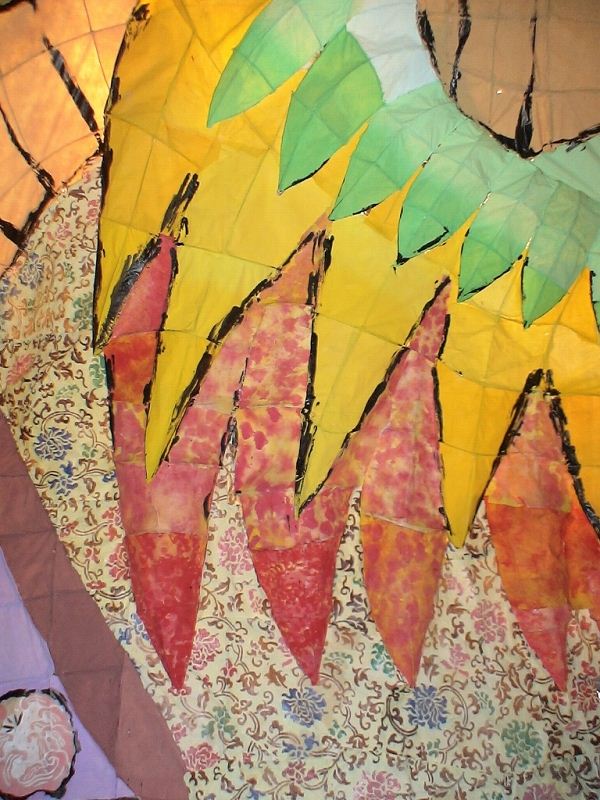・電飾は鳥の頭、龍の胴体の一部を除き、ちゃんと光っていた ・龍の顔がいい。龍は塗りといい、いい感じ ・鳥の羽を半分隠す(裏側に持っていく)という構想は非常にアリだと思う ・鳥の羽の塗りをもっと豪華にすべき。これでは黄色と肌色(意外と似たような色だったりする)の面積が多すぎる。黄色肌色緑の三色以外の色をもっと入れるべき。(龍はこのままで十分だと思うが) ・後輩諸君に見ておいて欲しい針金は、人の胸と左腕(というか肩)。顔も含めたこの三角形は地味だけど、大事。この肩の目立ち具合は好きだ