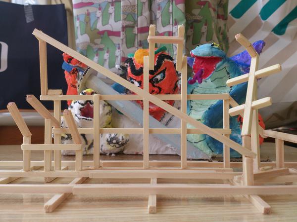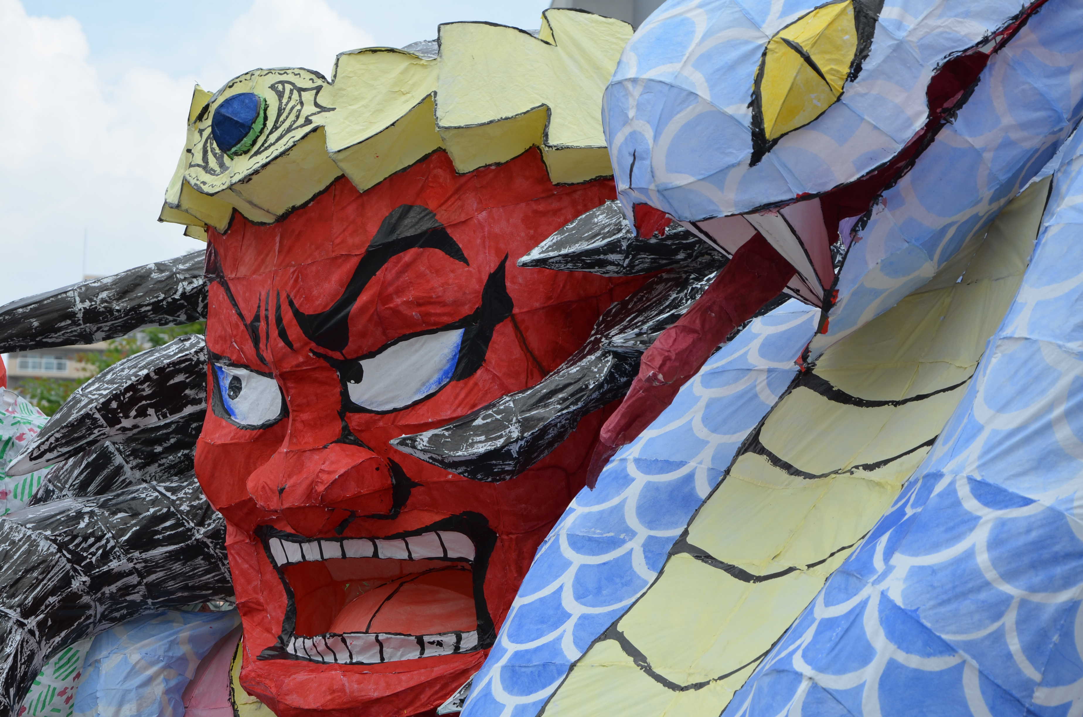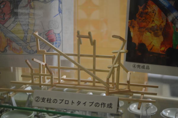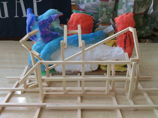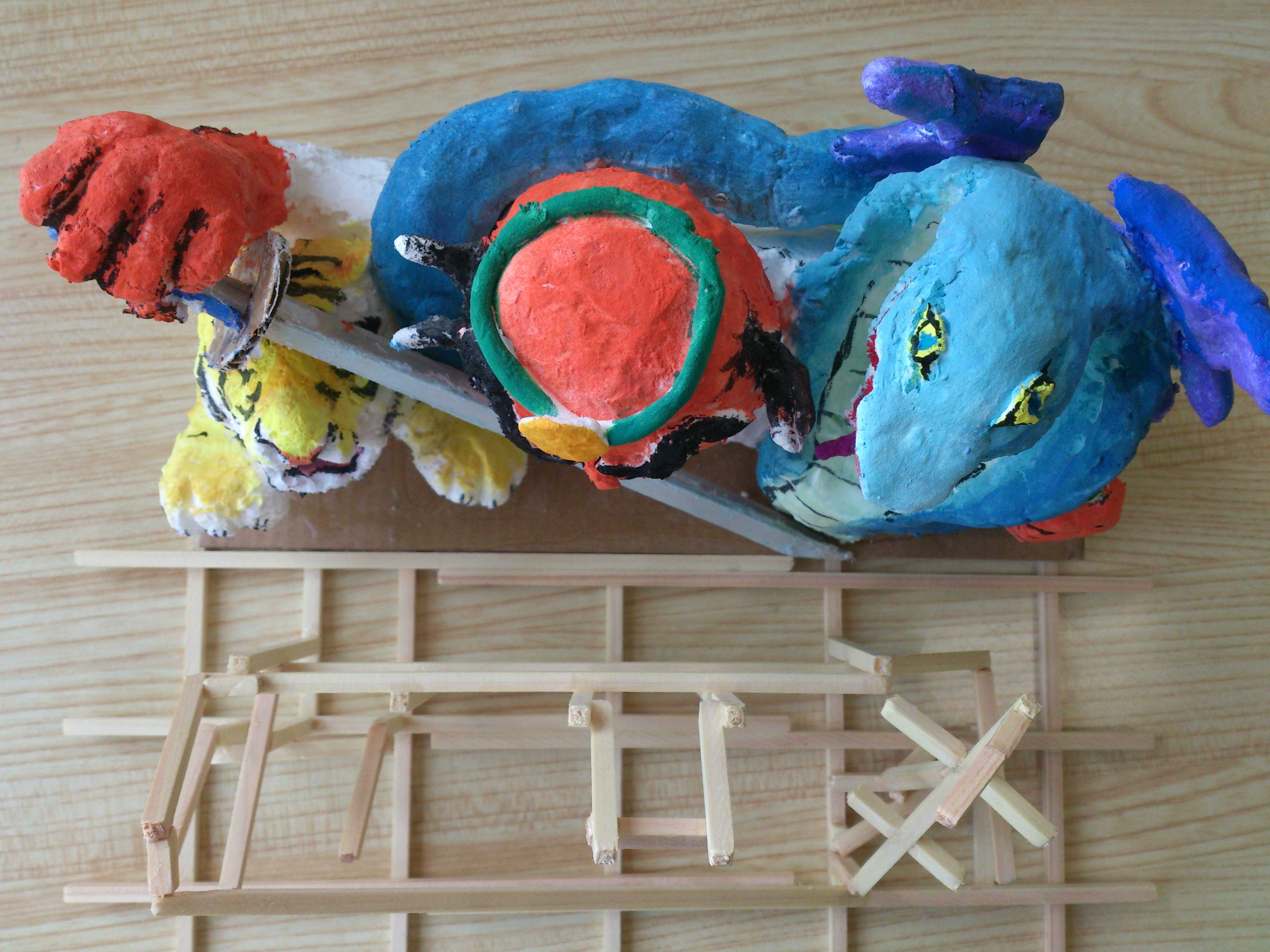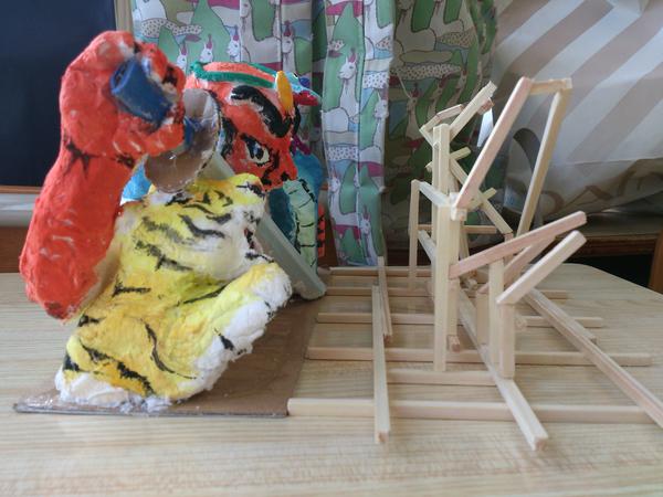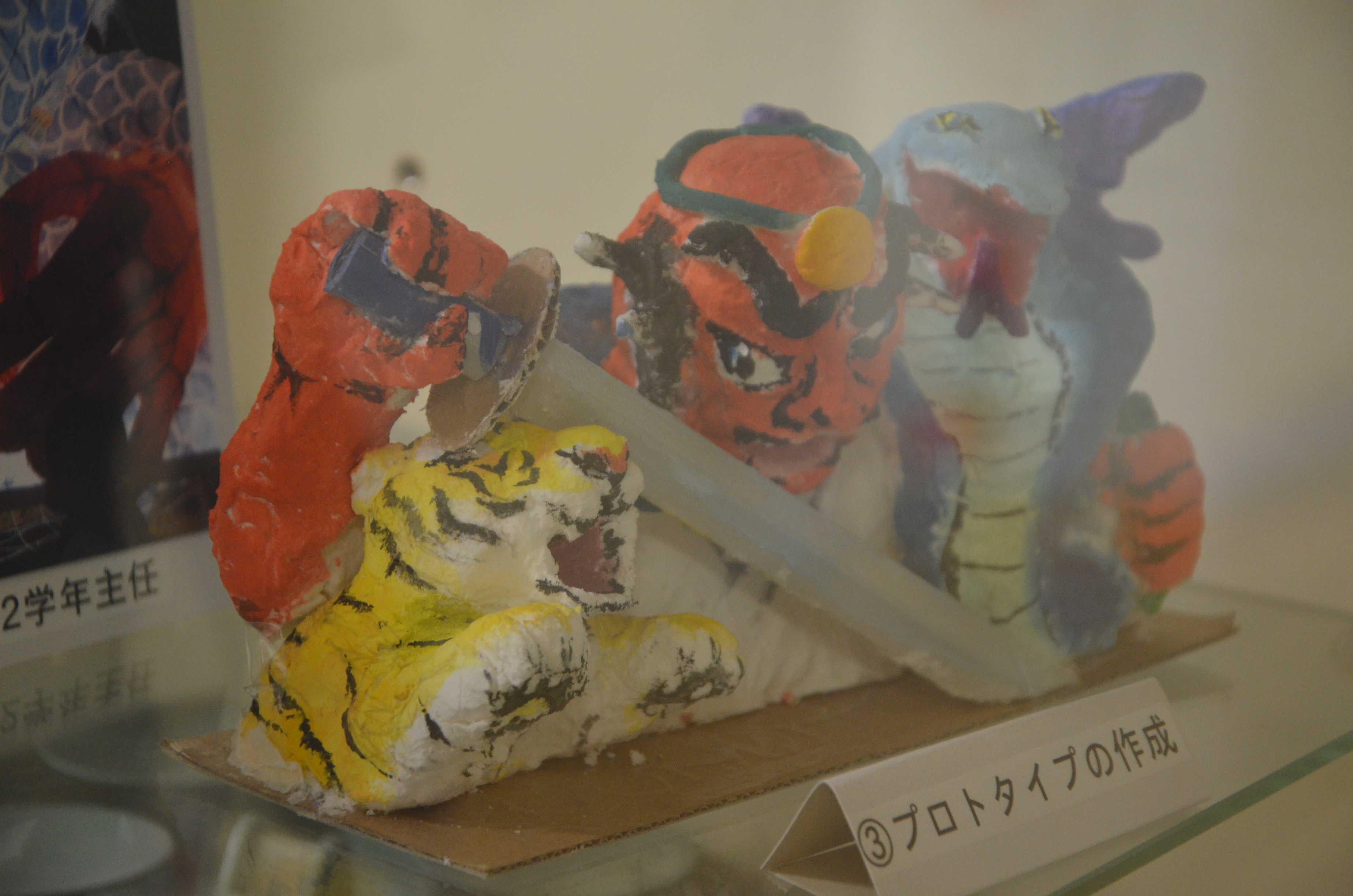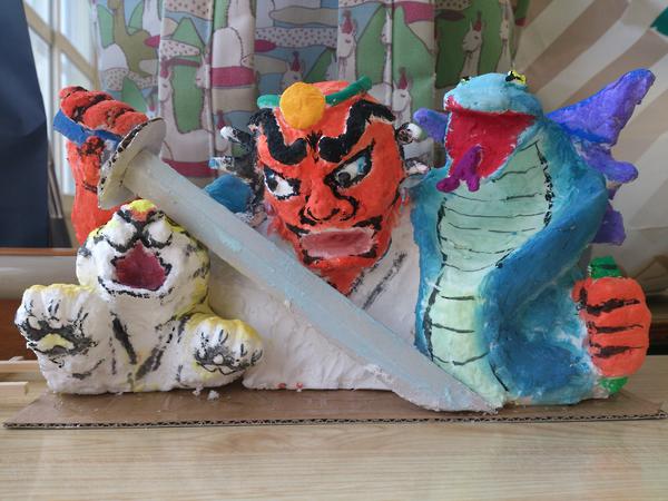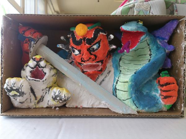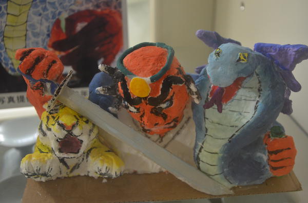 - よく光を通していて、色がとてもきれいでした。全体の配色のバランスもとれており、2年生のなかで1番華やかだと思います。また、虎の針金や後塗り、蛇の羽などの難しいところも成功していると思います。