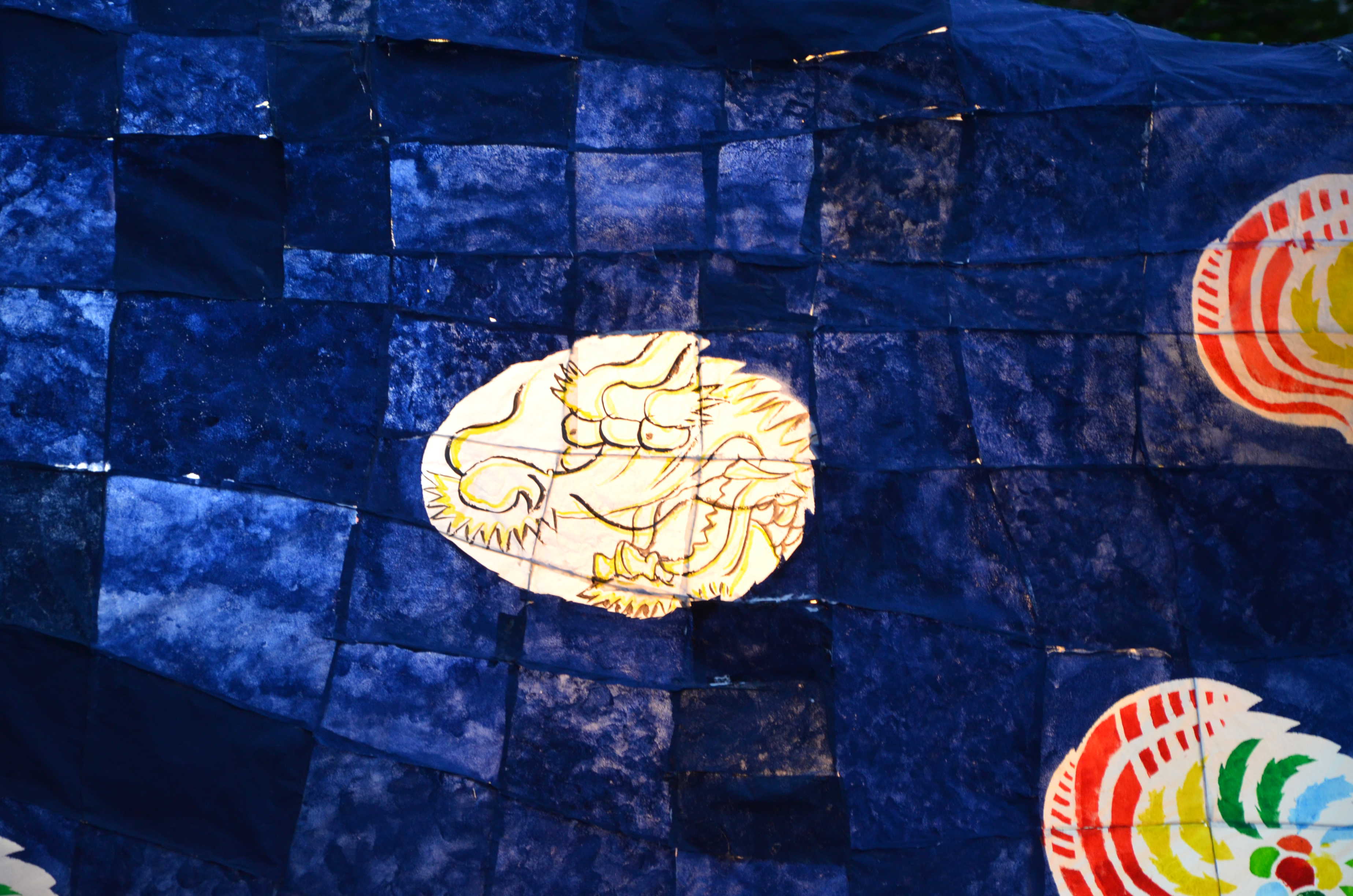 - 全体の赤がとても力強く、迫力のある行灯だと思います。特に1つ目の鬼にインパクトがあり印象に残りました。白澤という今までにないモチーフも、白・青・金の3色が映えていていると思います。また、それぞれの顔が整っており、腕などの肉付きがいいのも良いところだと思います。