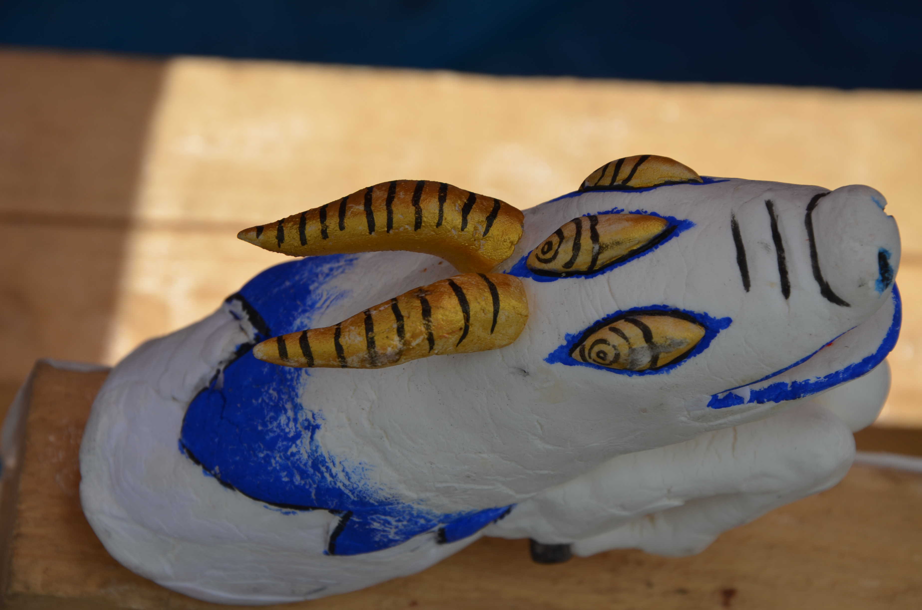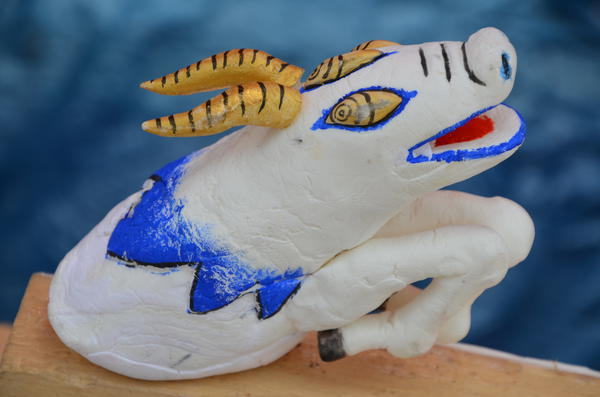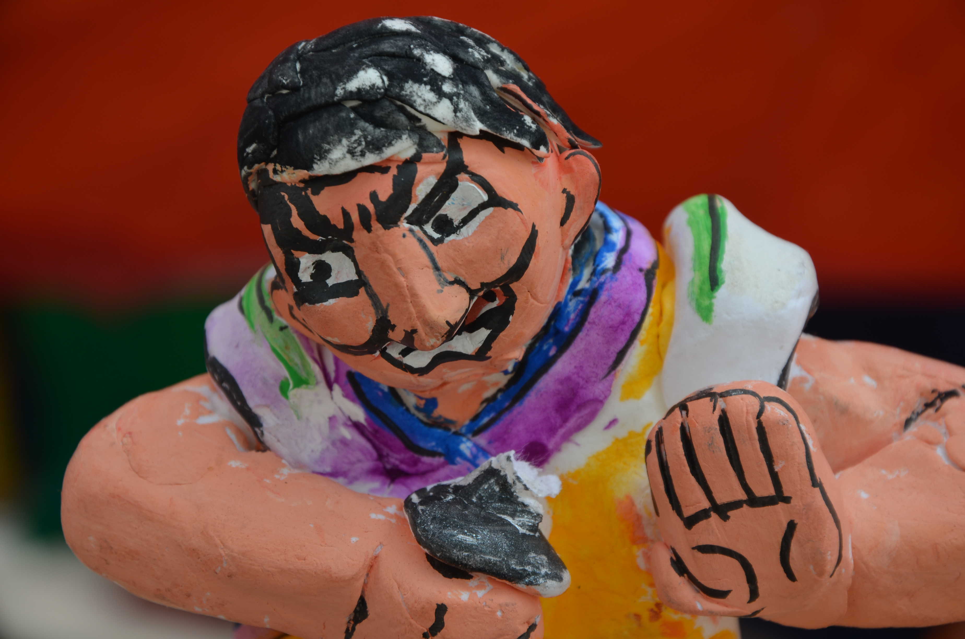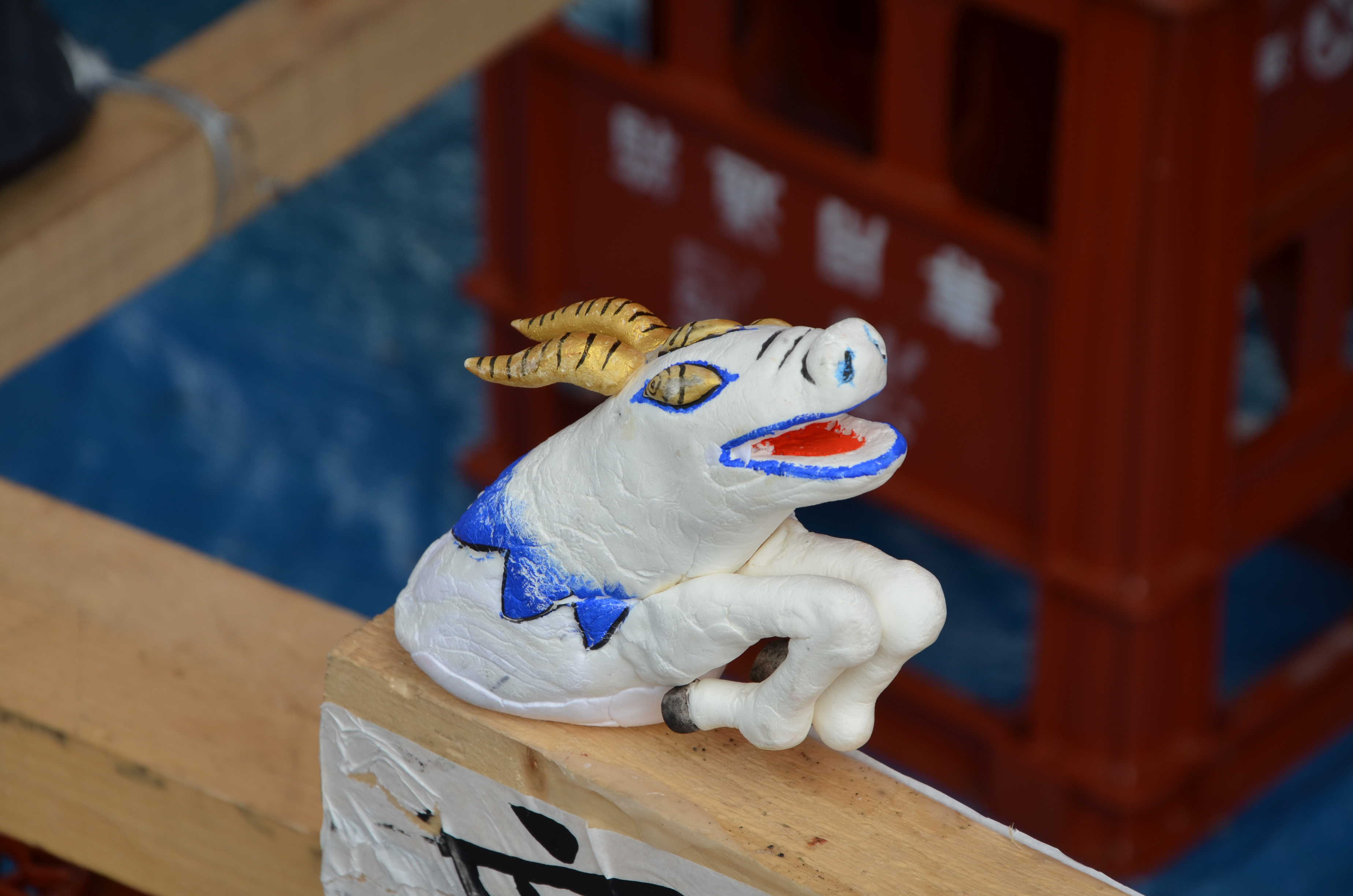 一つ目鬼について、顔がかなり上手かったです。ちゃんと下を意識しており、迫力がありました。特に口の形が良かったですね。鬼の「ニタリ」という感じが出ています。鬼が赤いので口の中の赤と同化してしまう可能性があったのですが、ろうを塗っていることでうまく口の輪郭を強調させることに成功しています。素晴らしいです。髪の感じもかなり好きでした。 顔の前のスペースが空いていたので、もう少し上半身を前に傾けると良かったかなと思います。