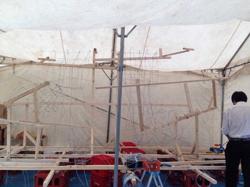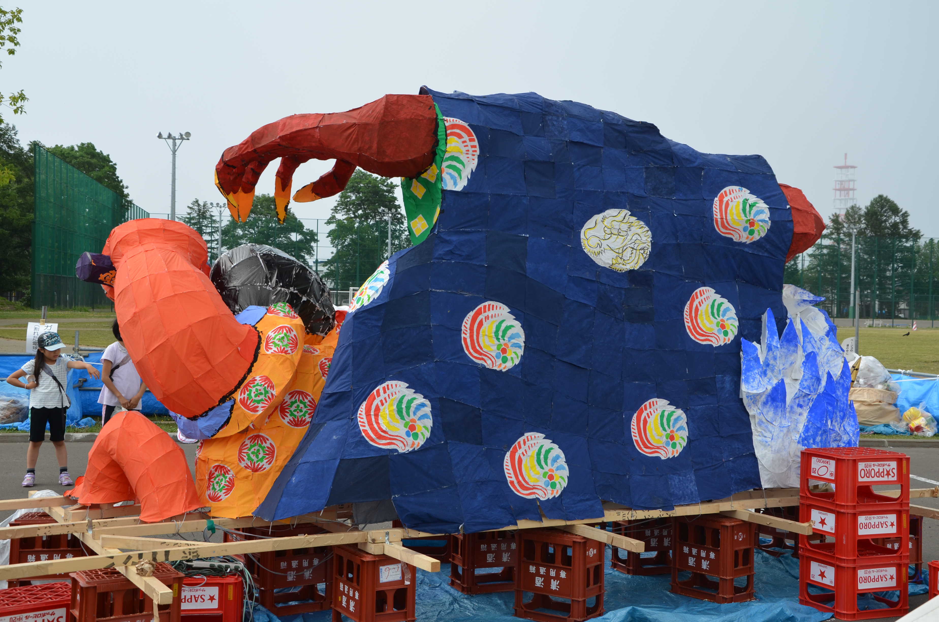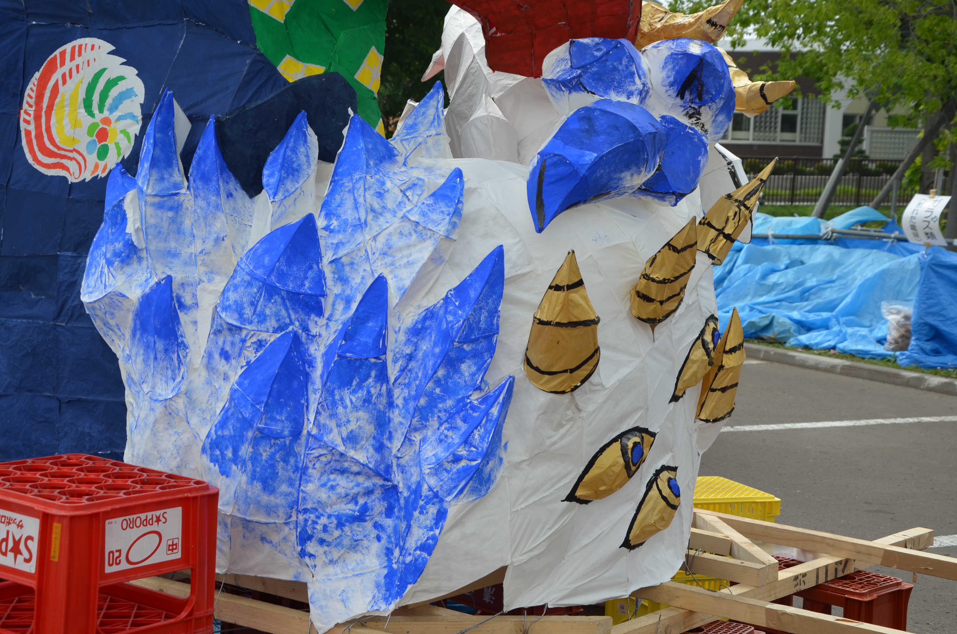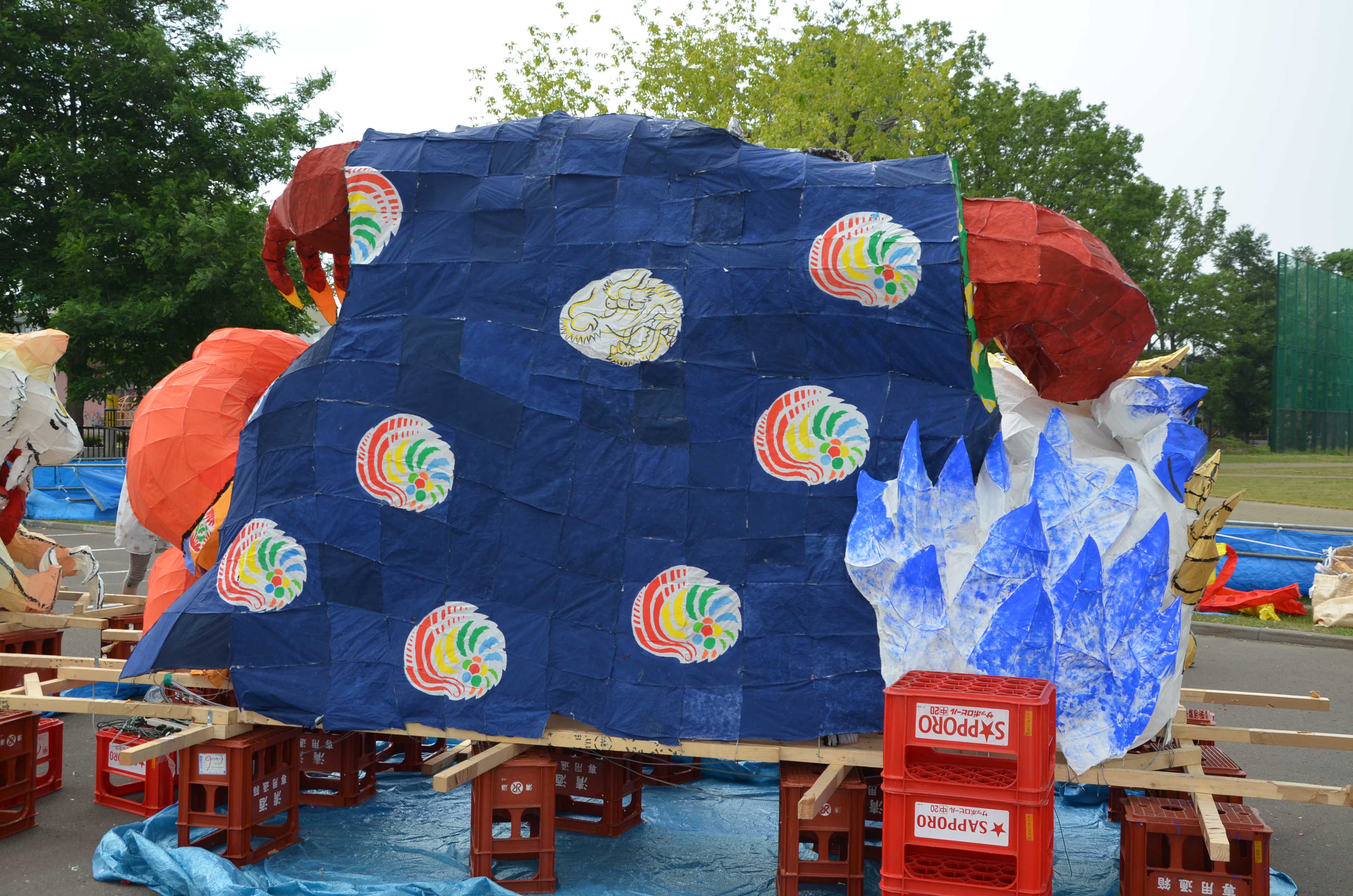 配色について、こちらは2-3とは対照的に、全体的に濃い色で勝負していました。 濃い色は、ムラができやすくかつ夜に形がわからなくなるなど難しいのですが、特に大きな失敗がなかったように思います。ただちょっと赤が多かったかなと思います。人の服の色を別の色にしても良かったかもしれません。 白澤は青白金ですごく綺麗でした。