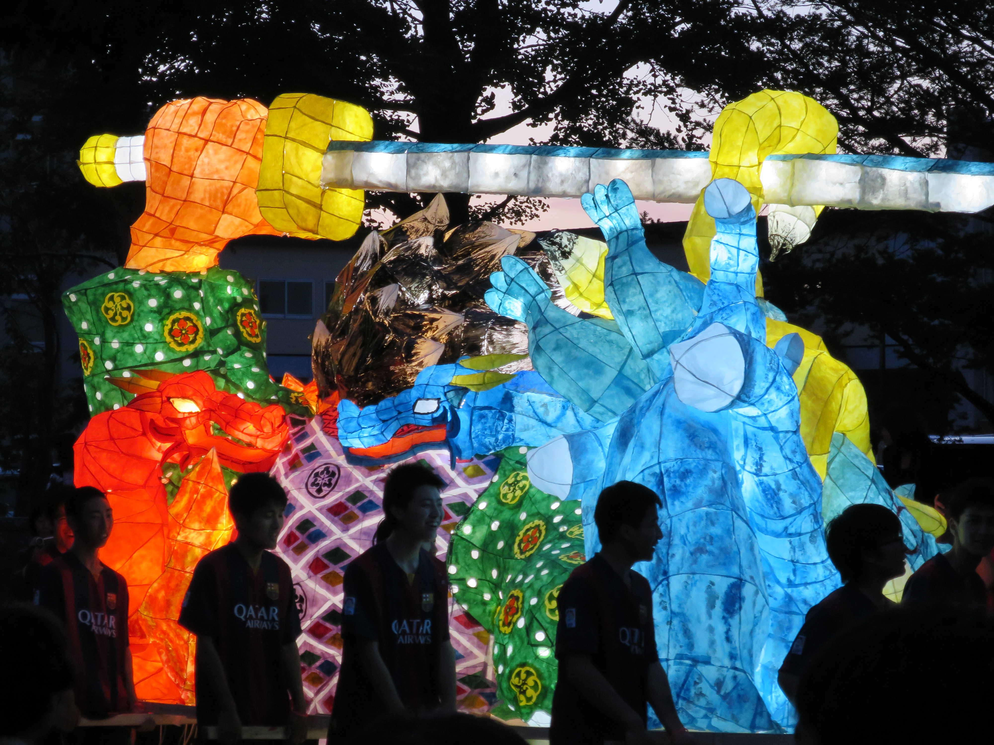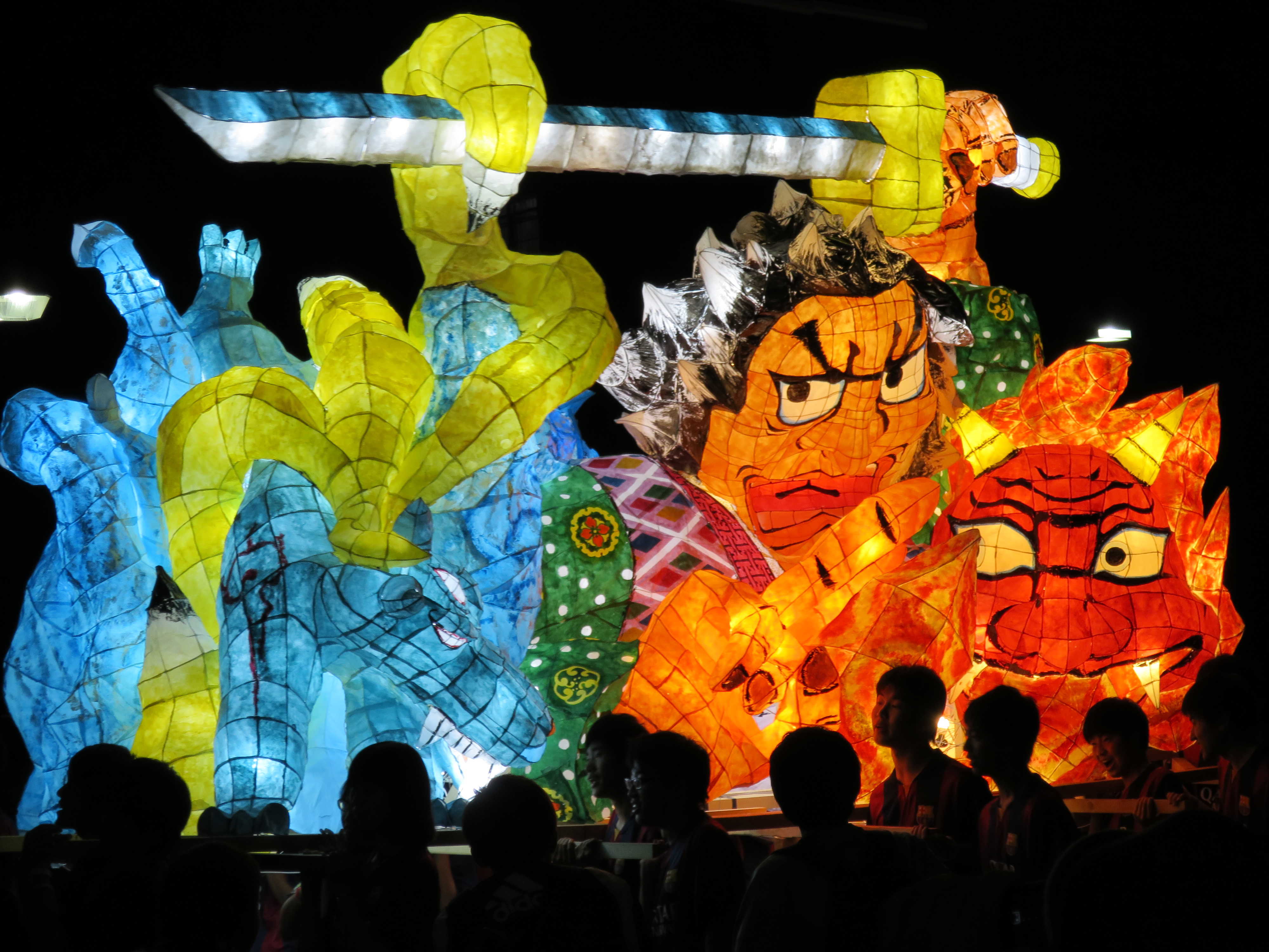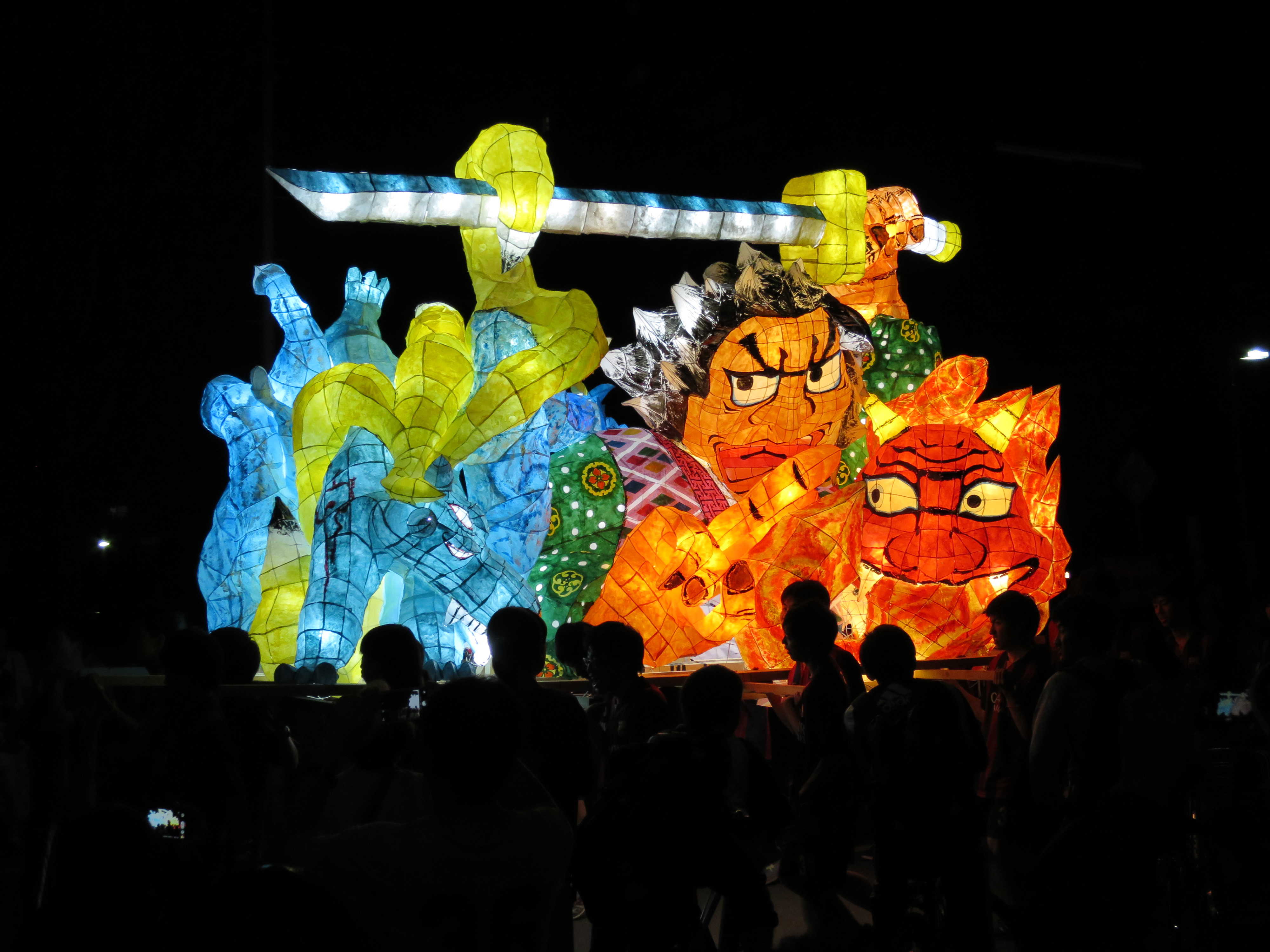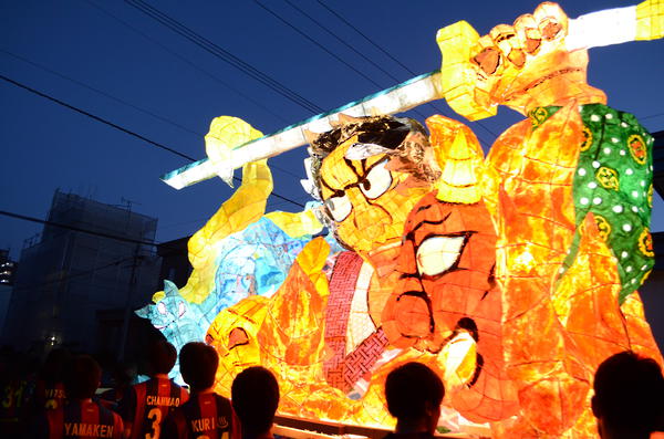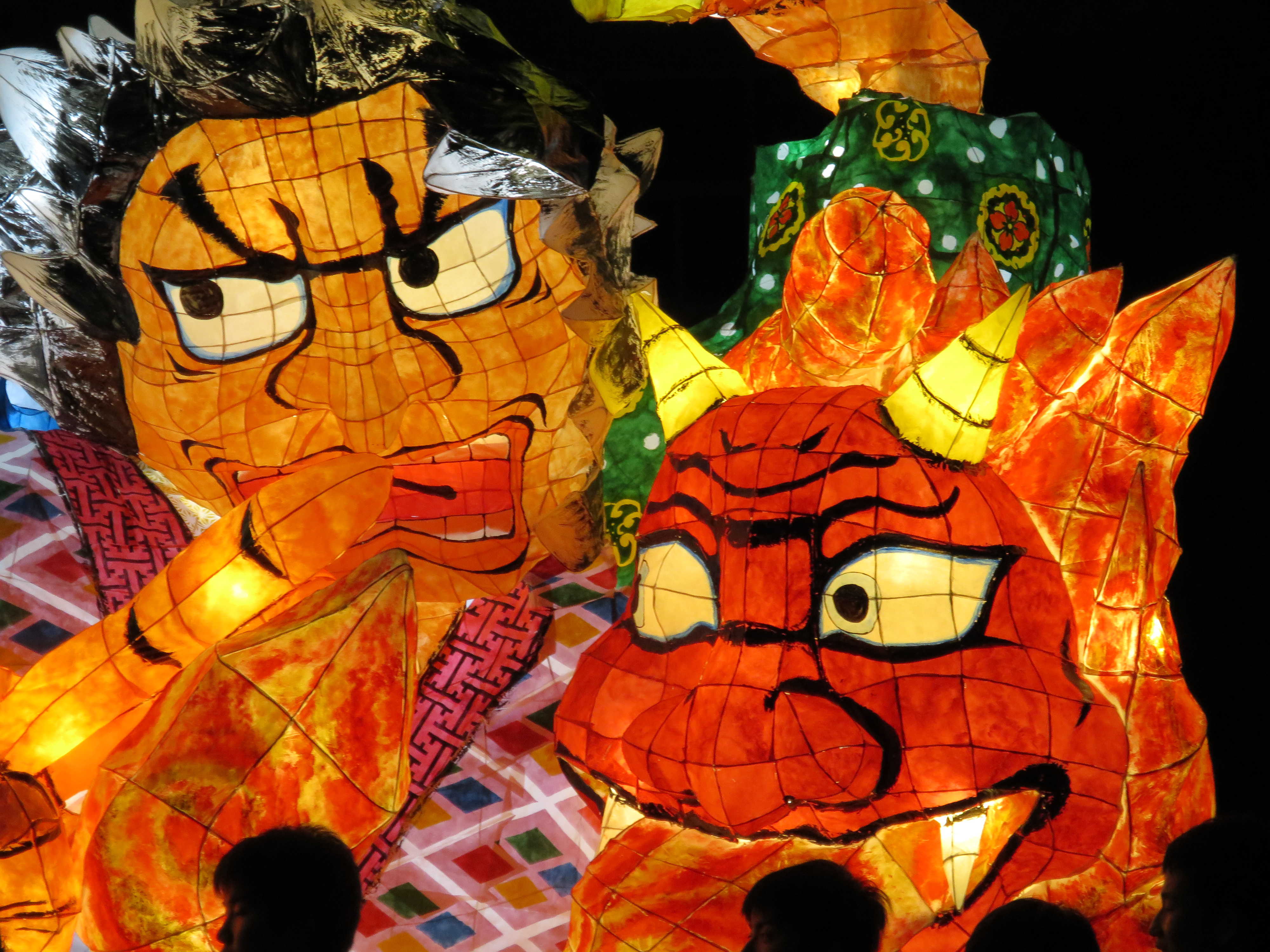 3つの尾、光り輝く隻眼を持つ妖怪「讙」、妖術で鬼を招き、火遁の術で対抗する武者。両者がくり広げる業火、業水の『妖』の合戦を再現しました。華やかな赤と青の対比、鬼気迫る表情、神秘的な讙の姿、そして妖の合戦をぜひご覧ください。