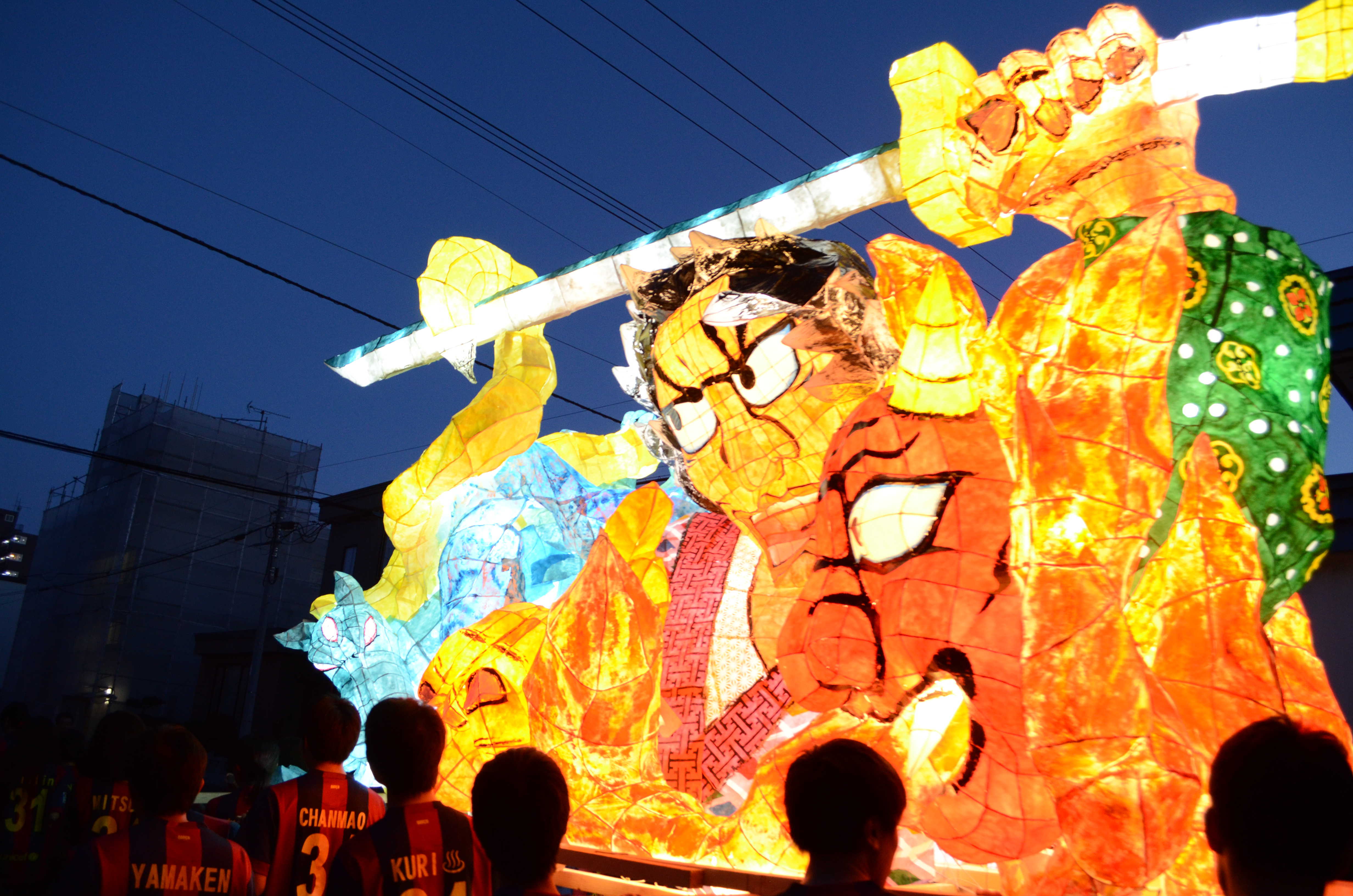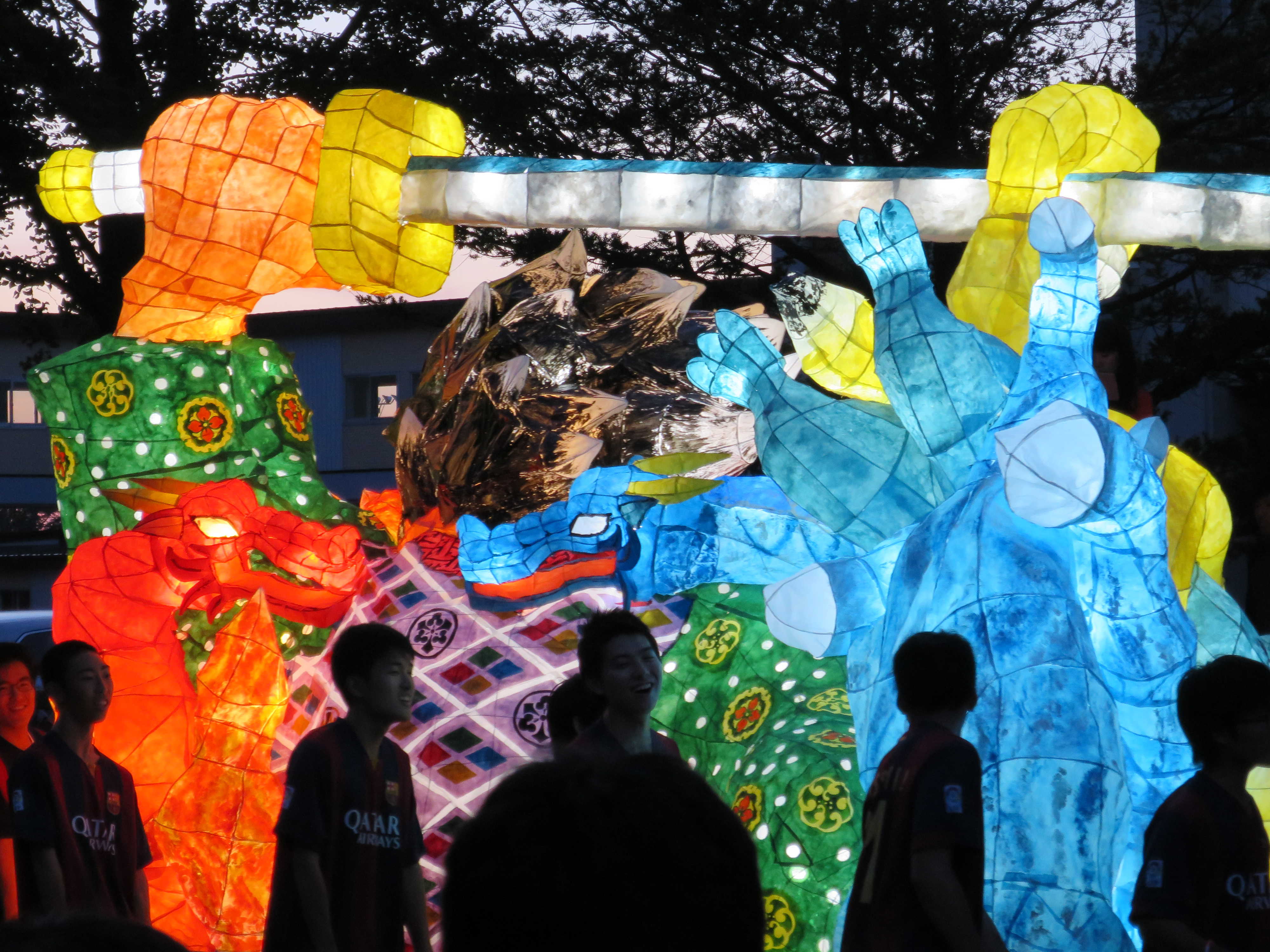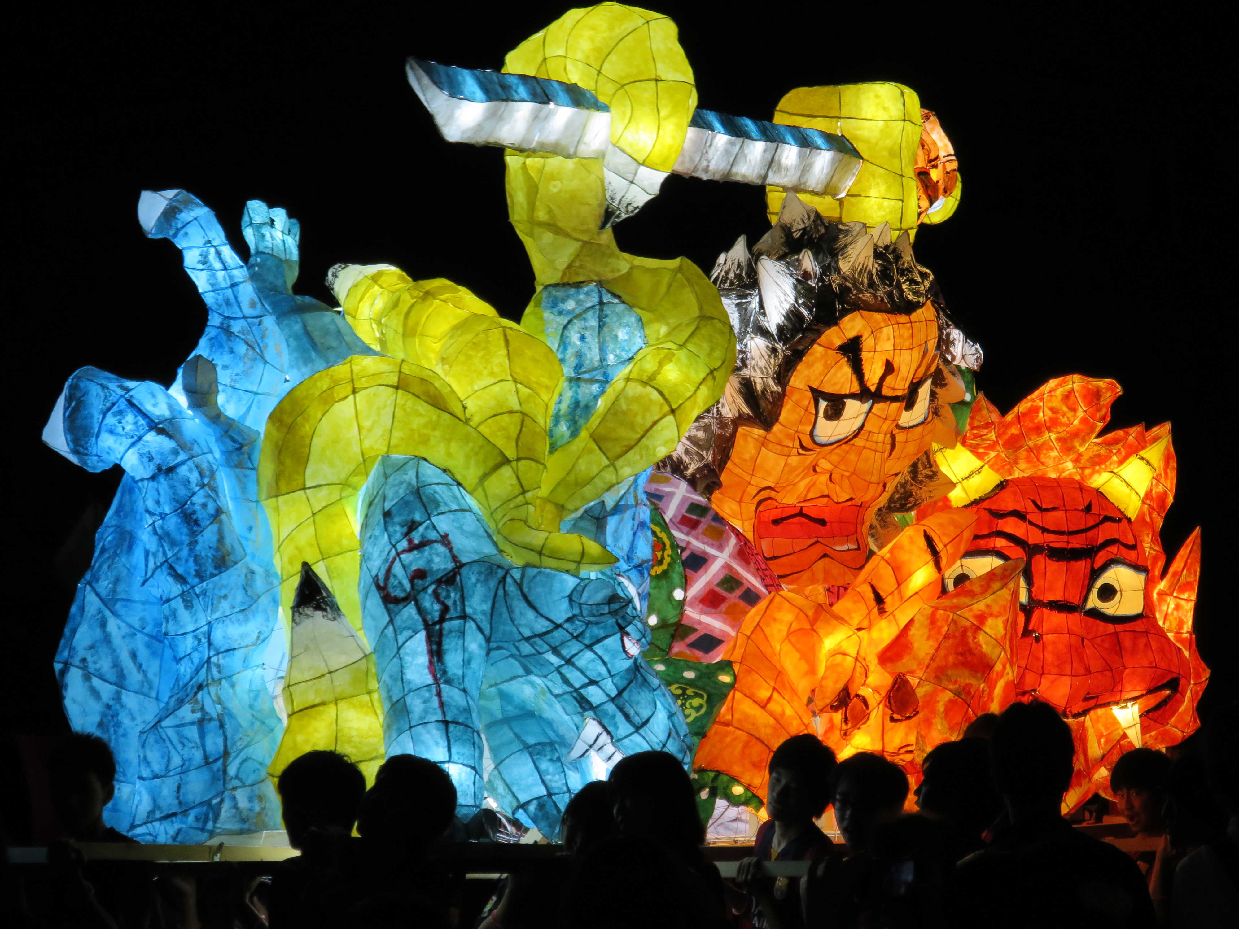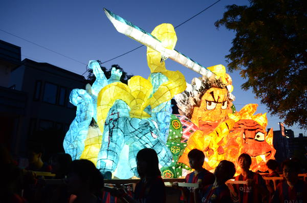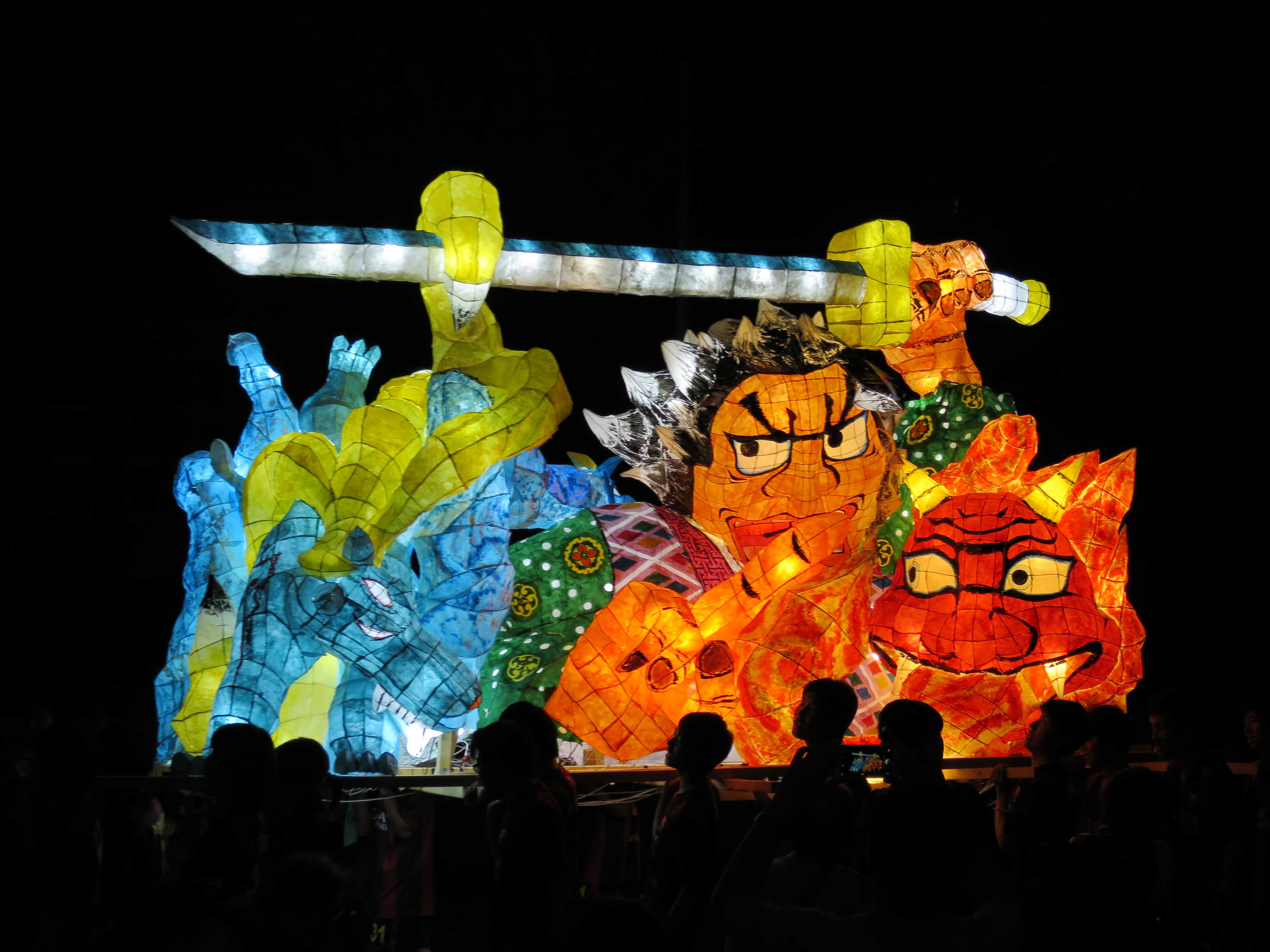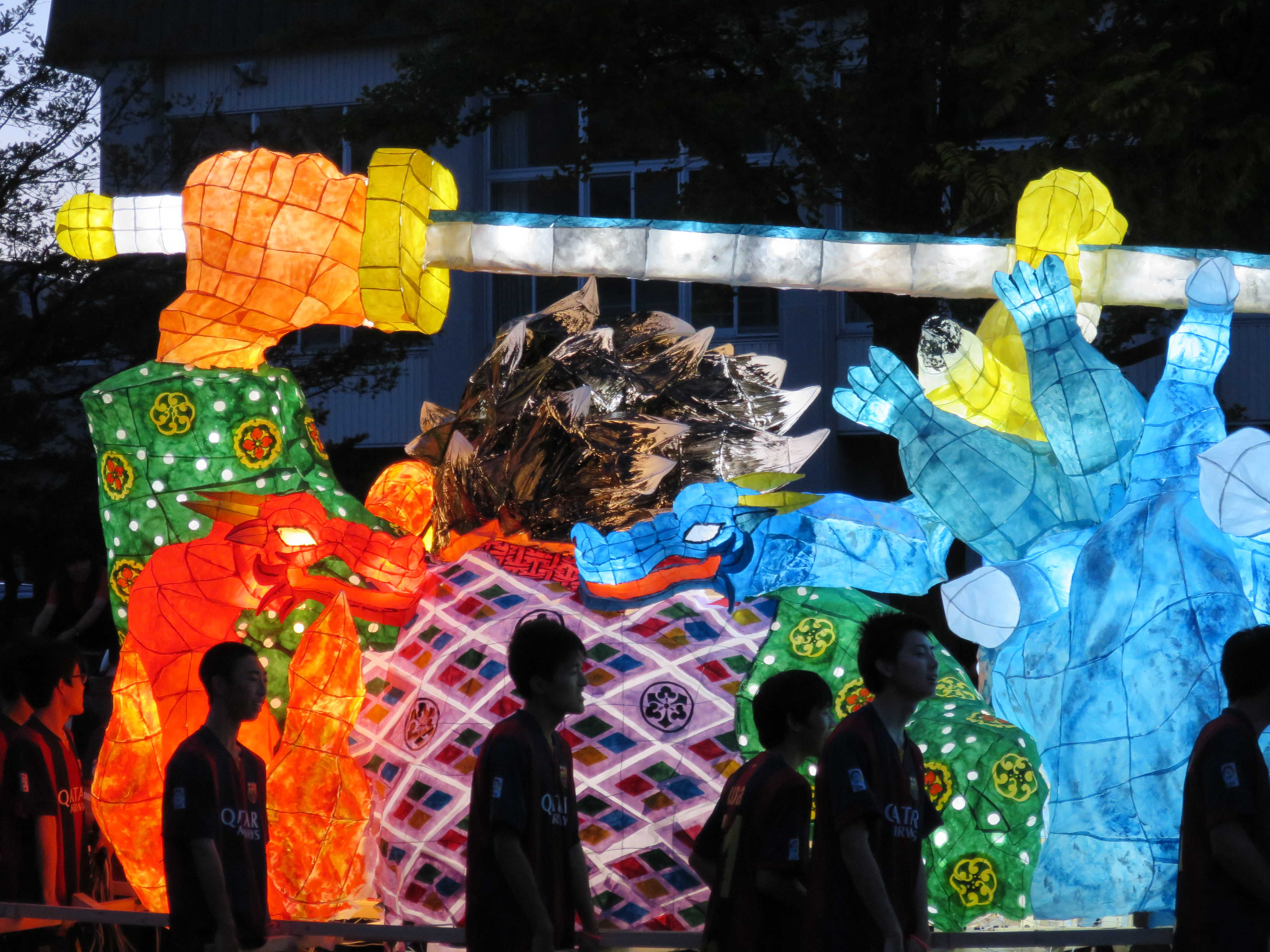 3つの尾、光り輝く隻眼を持つ妖怪「讙」、妖術で鬼を招き、火遁の術で対抗する武者。両者がくり広げる業火、業水の『妖』の合戦を再現しました。華やかな赤と青の対比、鬼気迫る表情、神秘的な讙の姿、そして妖の合戦をぜひご覧ください。