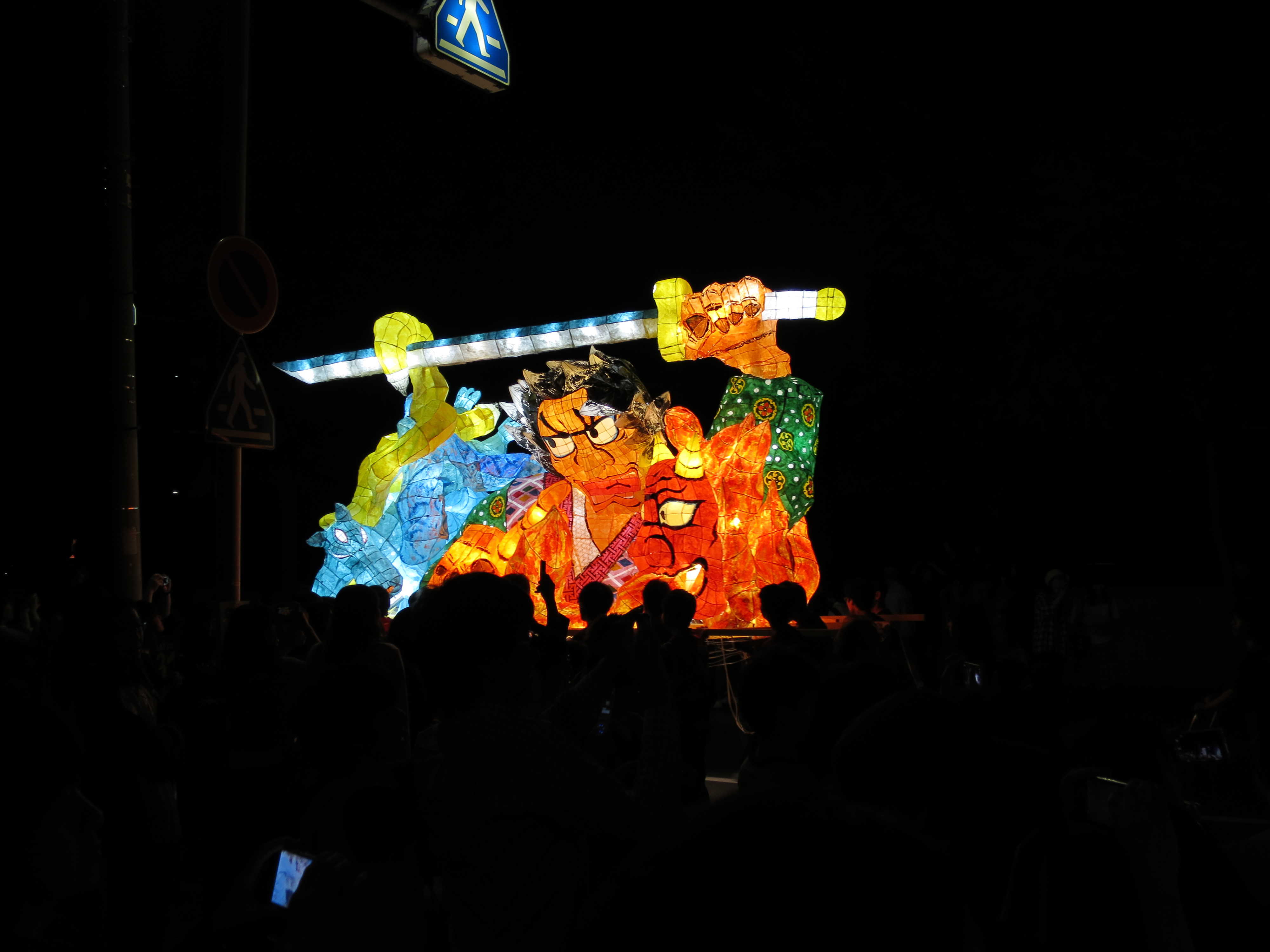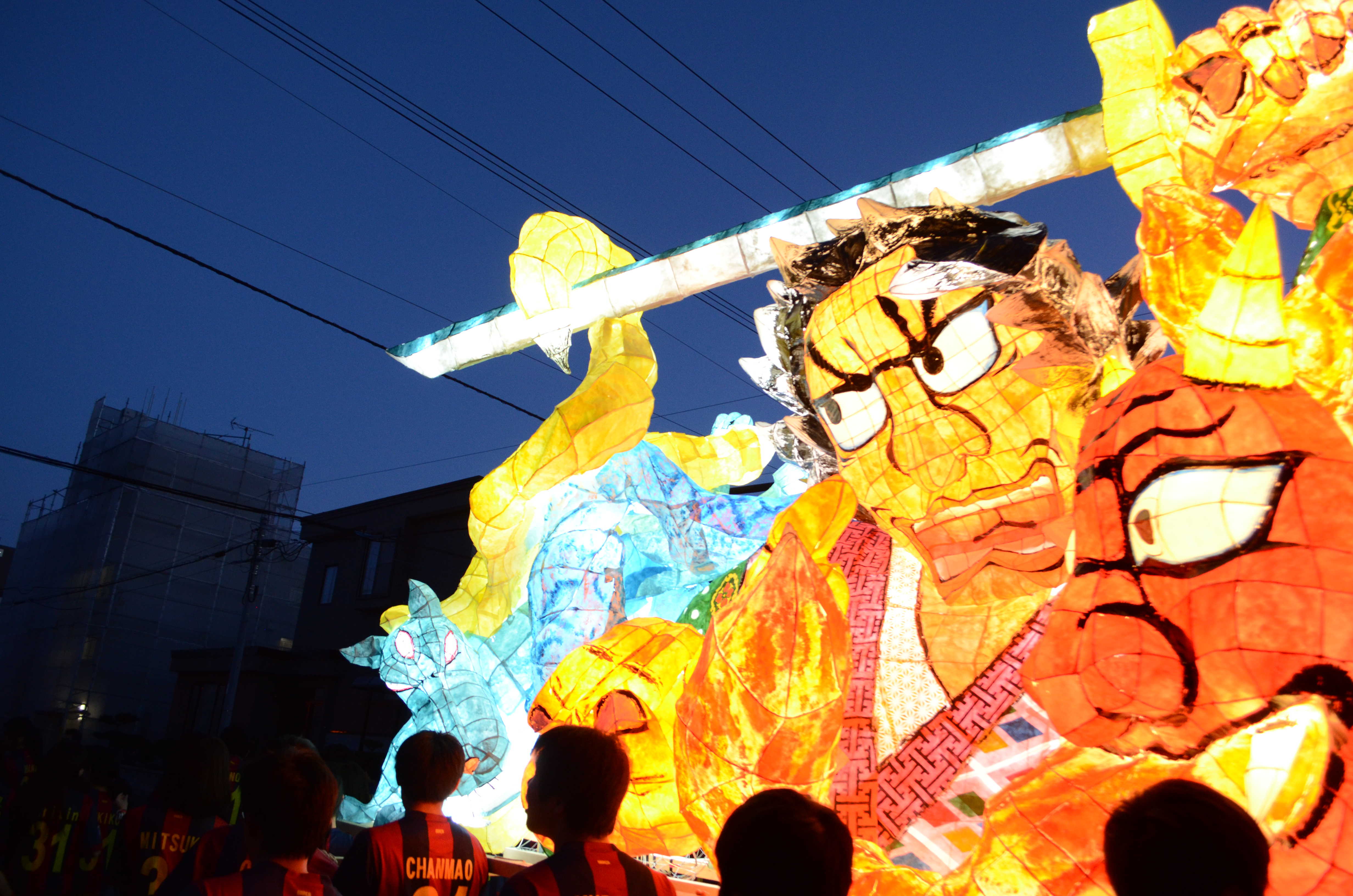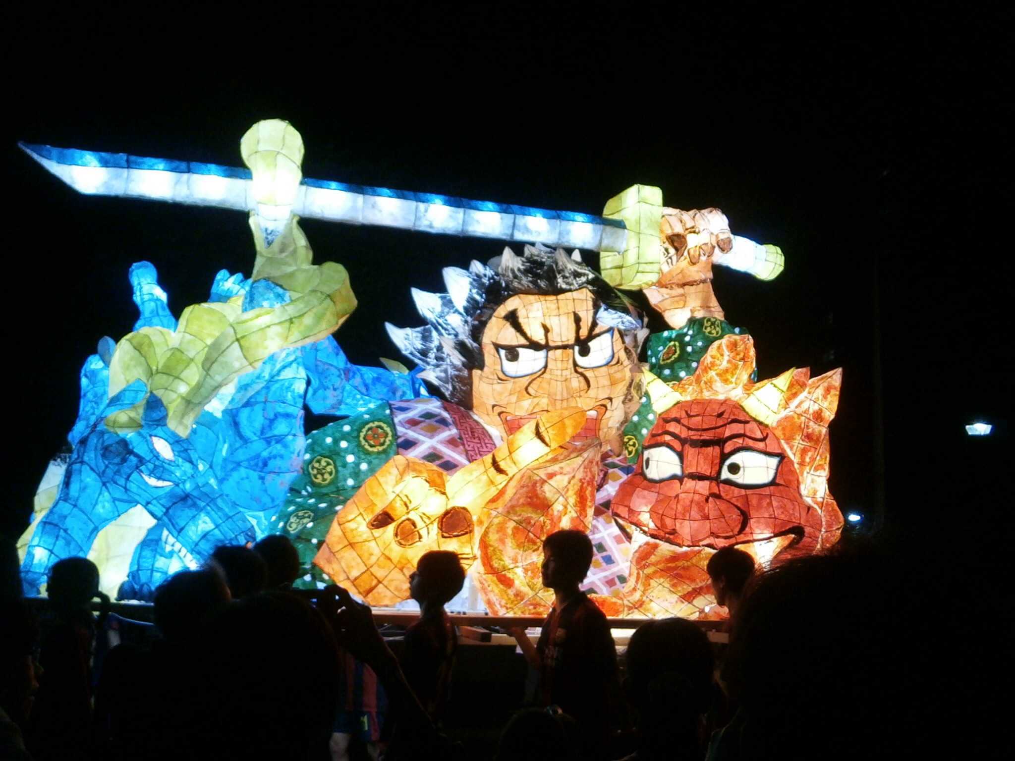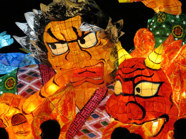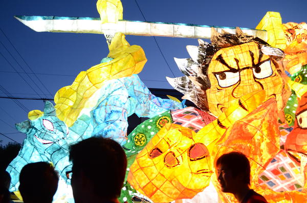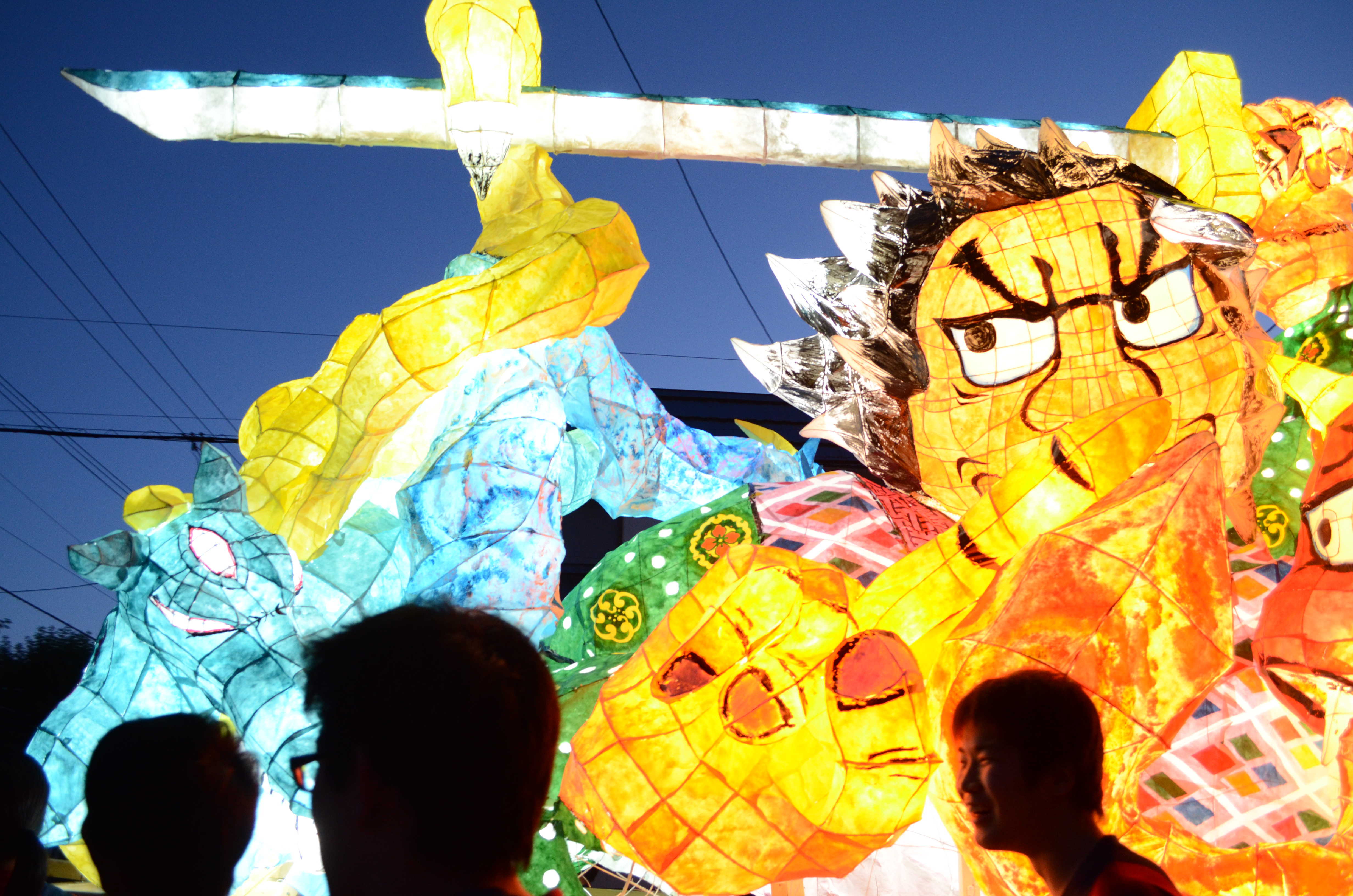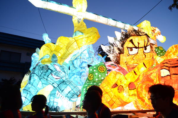 3つの尾、光り輝く隻眼を持つ妖怪「讙」、妖術で鬼を招き、火遁の術で対抗する武者。両者がくり広げる業火、業水の『妖』の合戦を再現しました。華やかな赤と青の対比、鬼気迫る表情、神秘的な讙の姿、そして妖の合戦をぜひご覧ください。