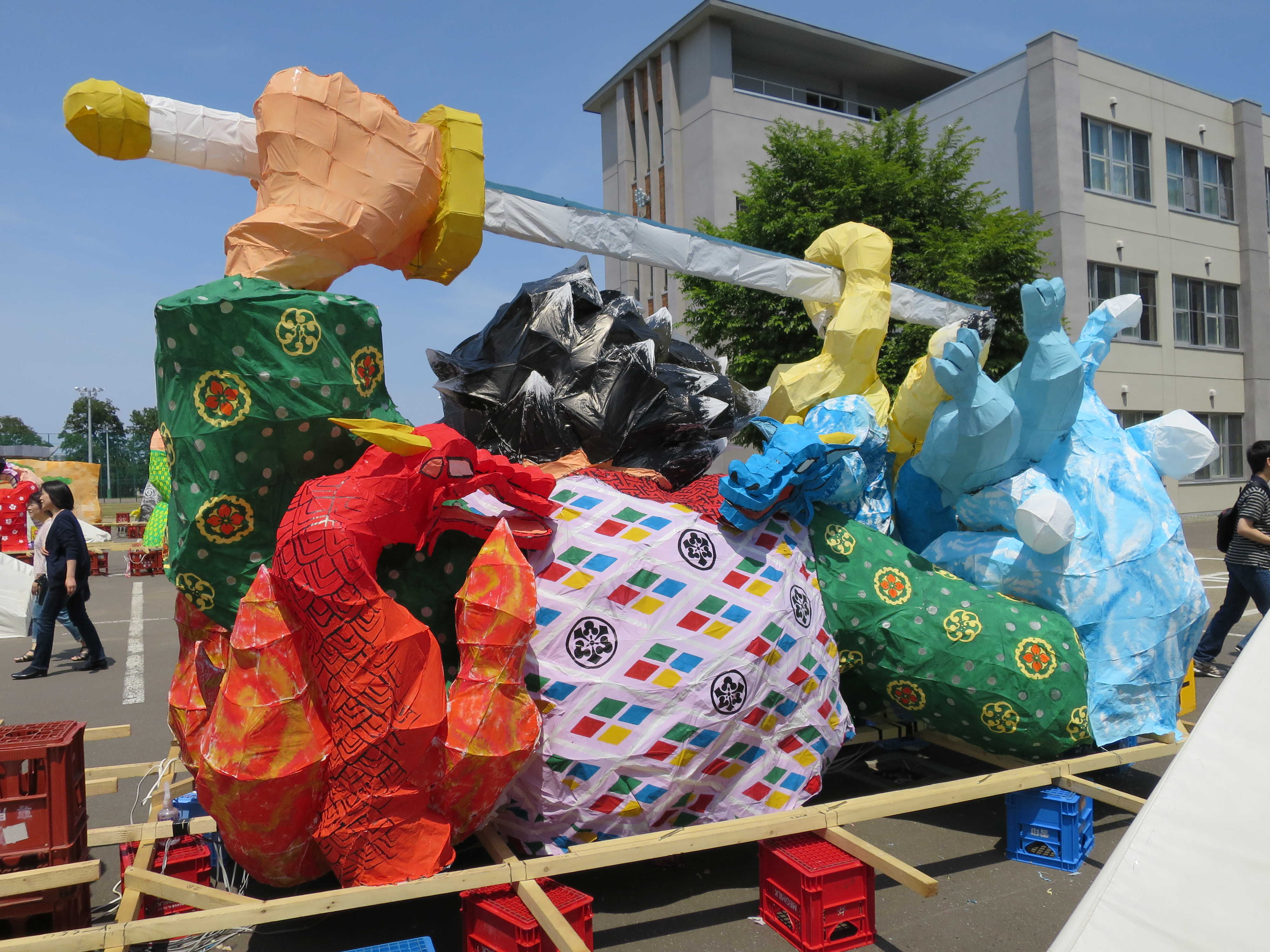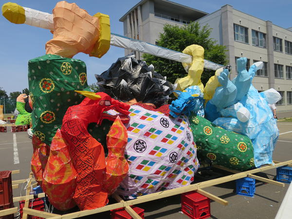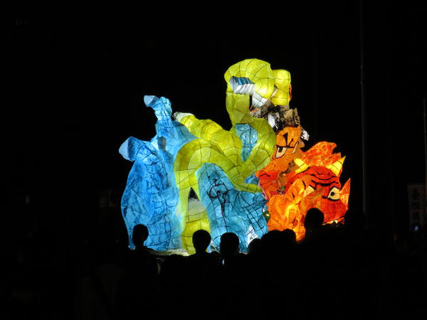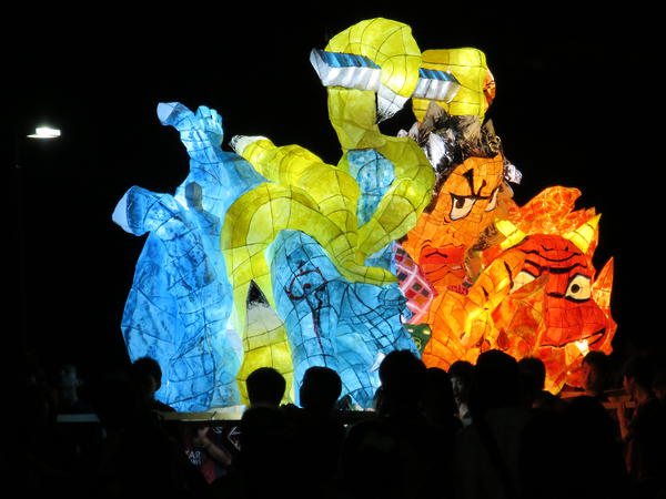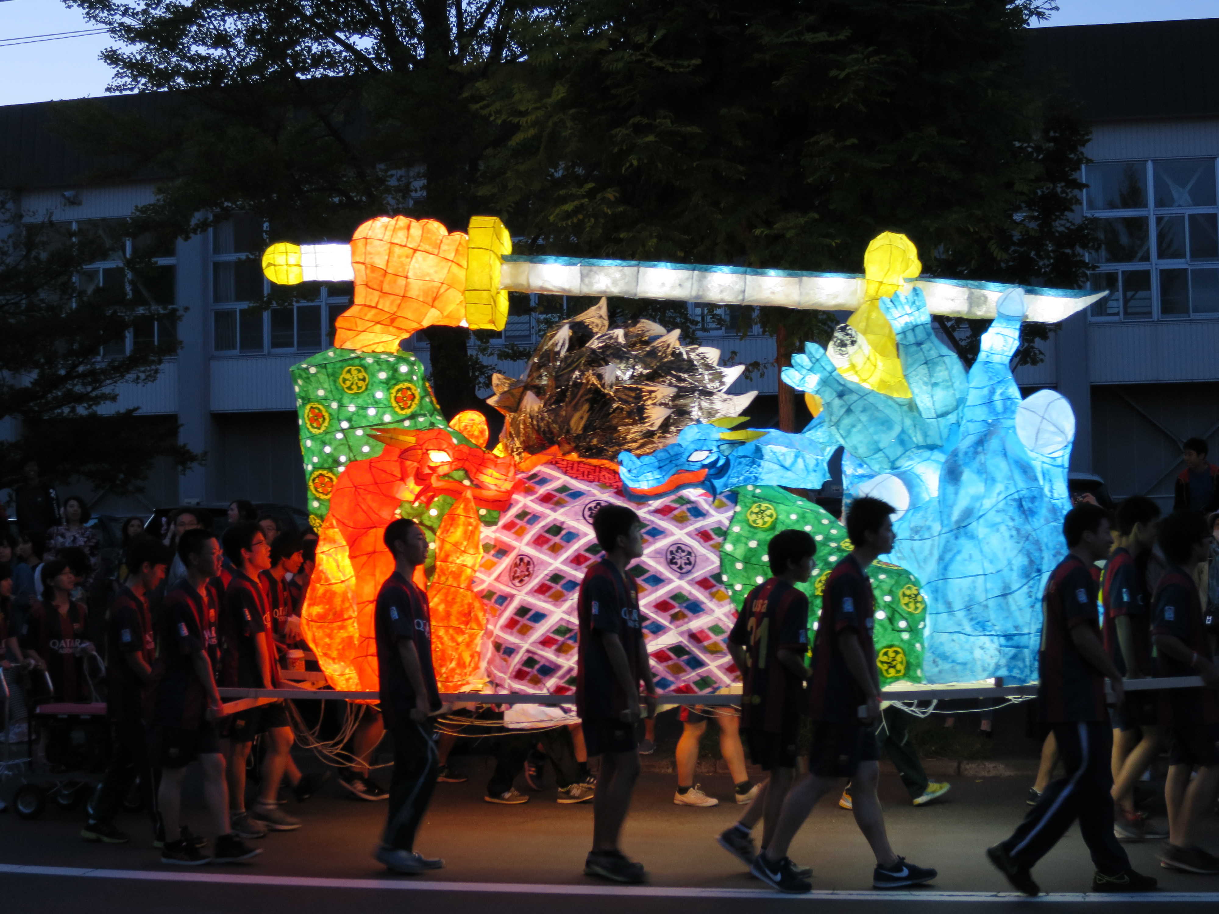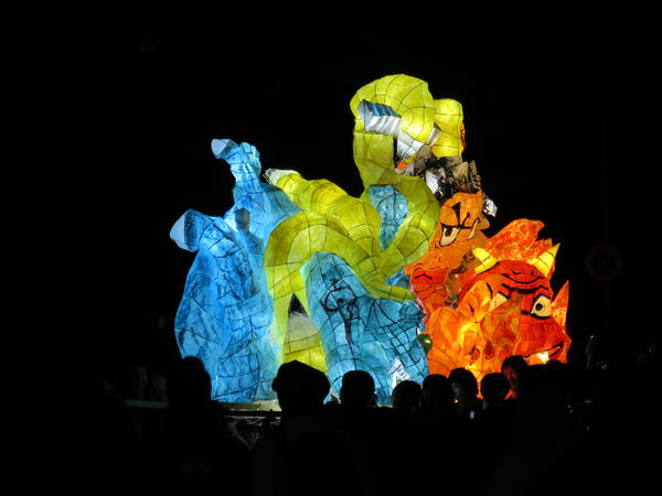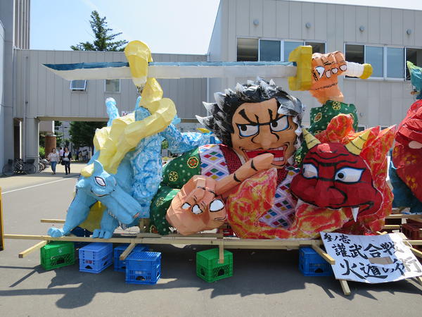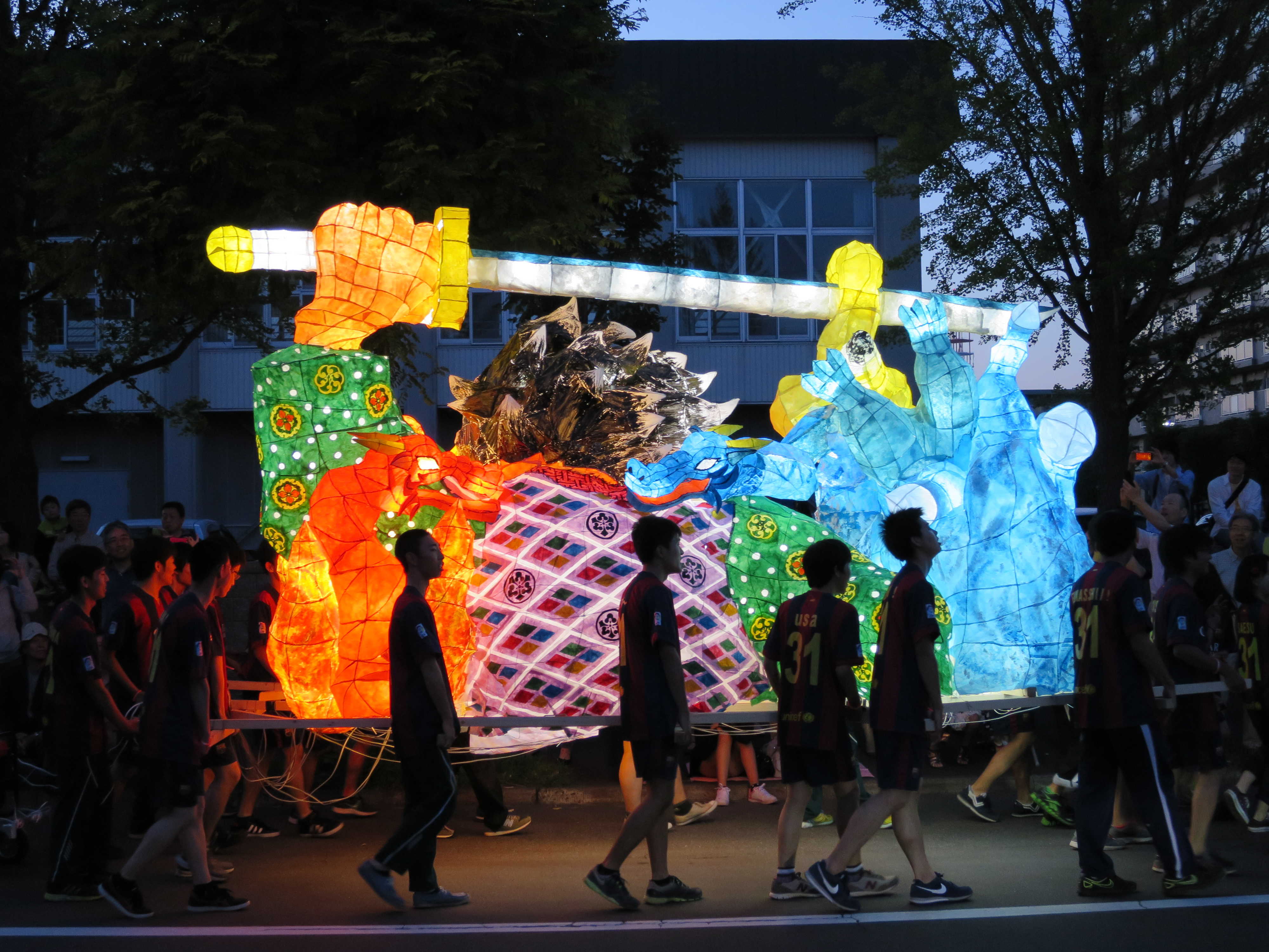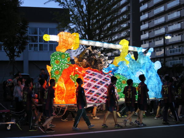 3つの尾、光り輝く隻眼を持つ妖怪「讙」、妖術で鬼を招き、火遁の術で対抗する武者。両者がくり広げる業火、業水の『妖』の合戦を再現しました。華やかな赤と青の対比、鬼気迫る表情、神秘的な讙の姿、そして妖の合戦をぜひご覧ください。