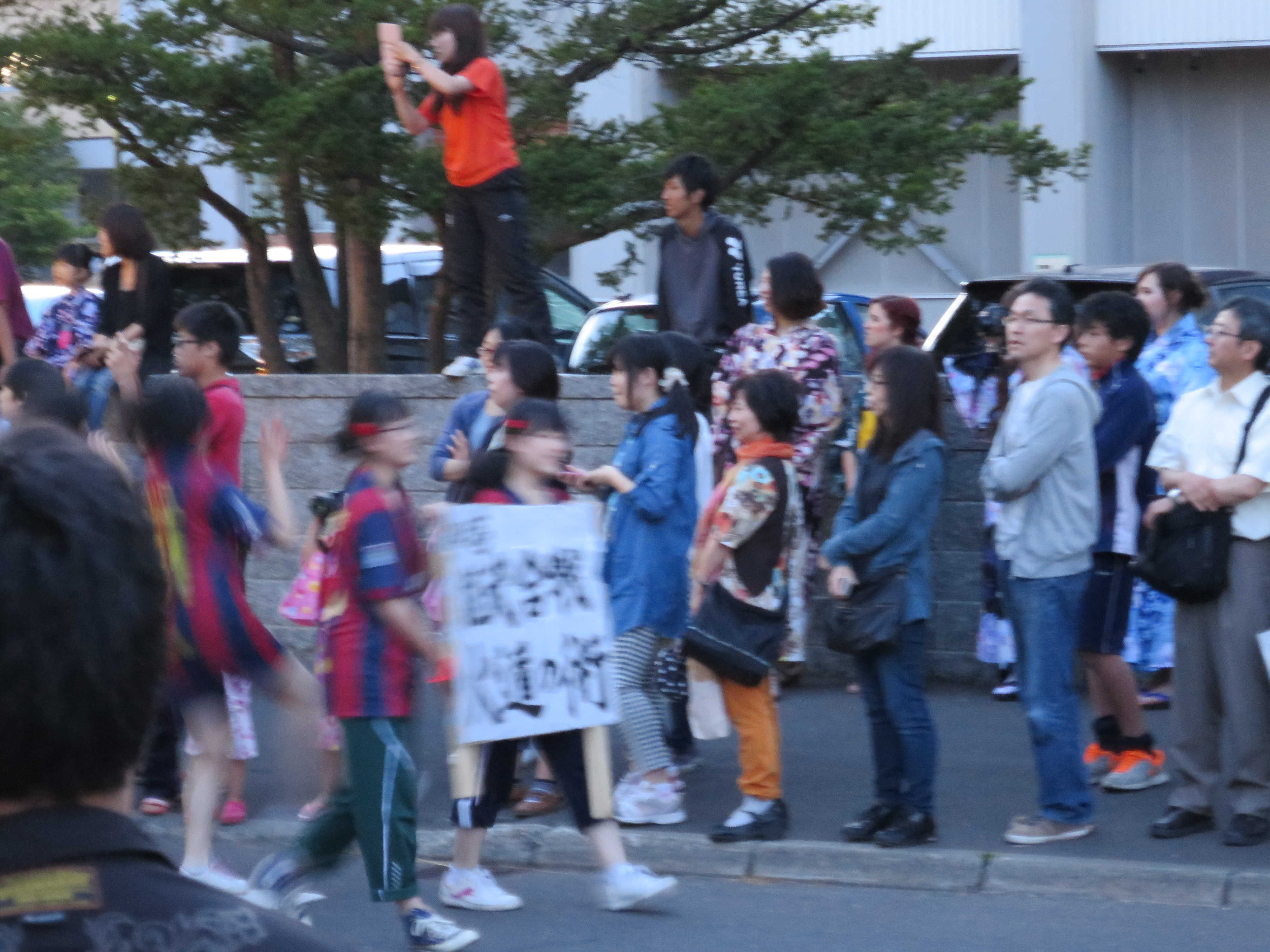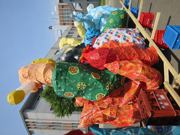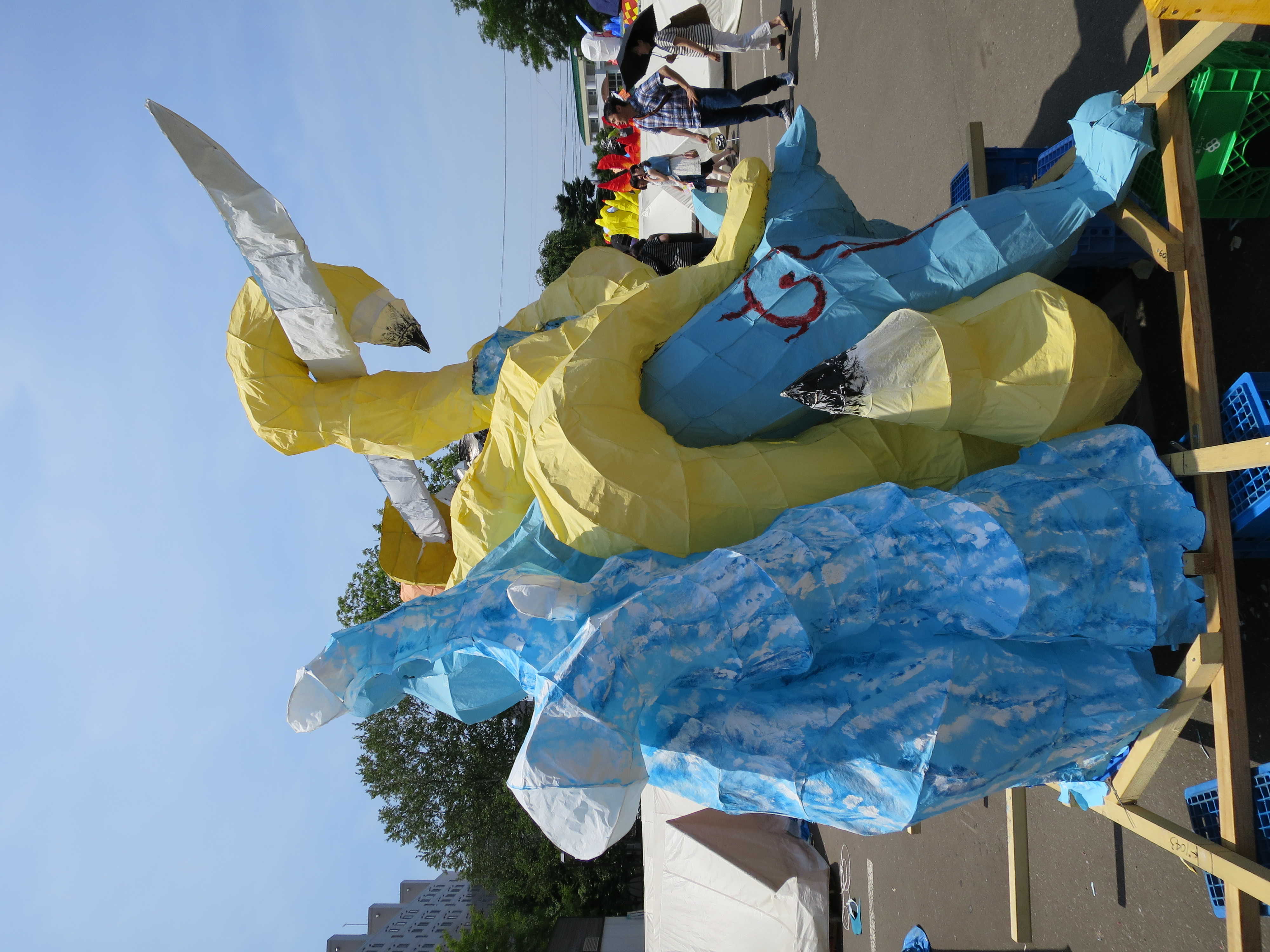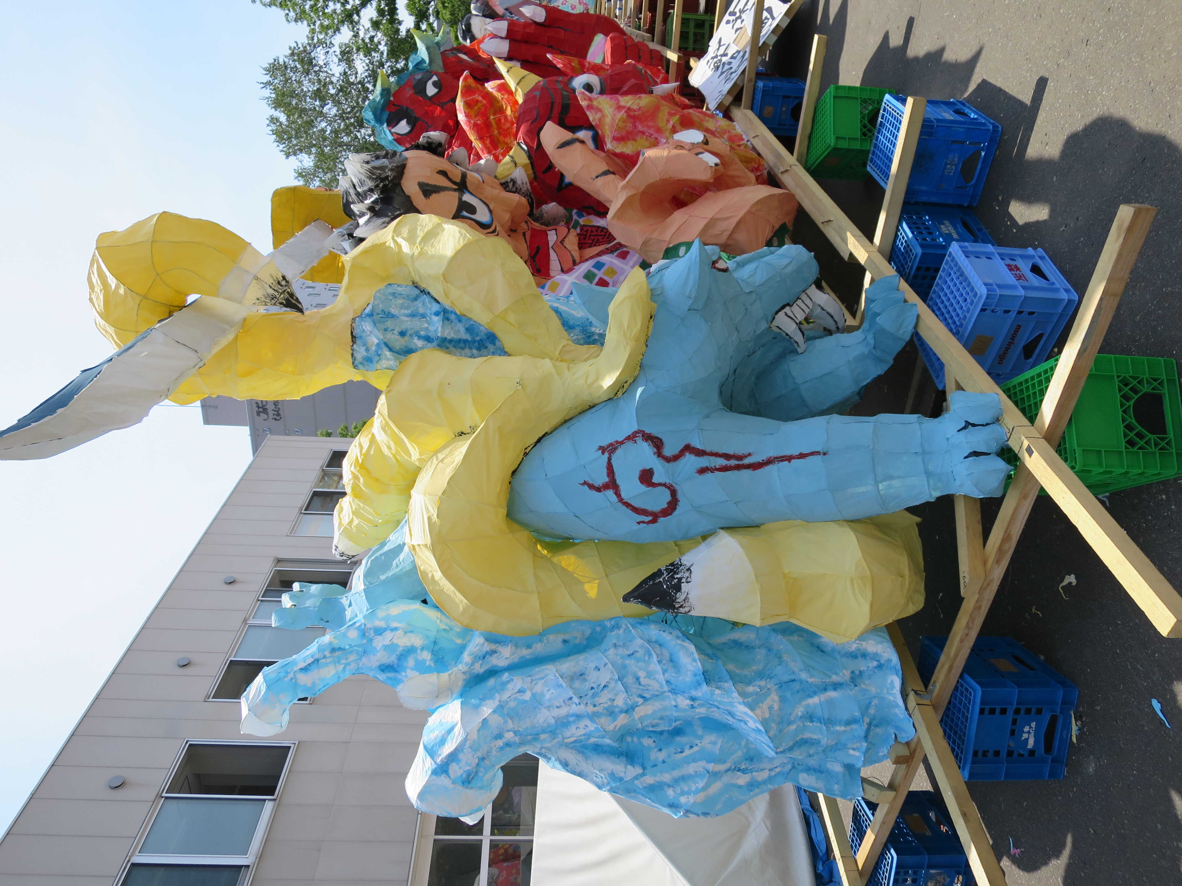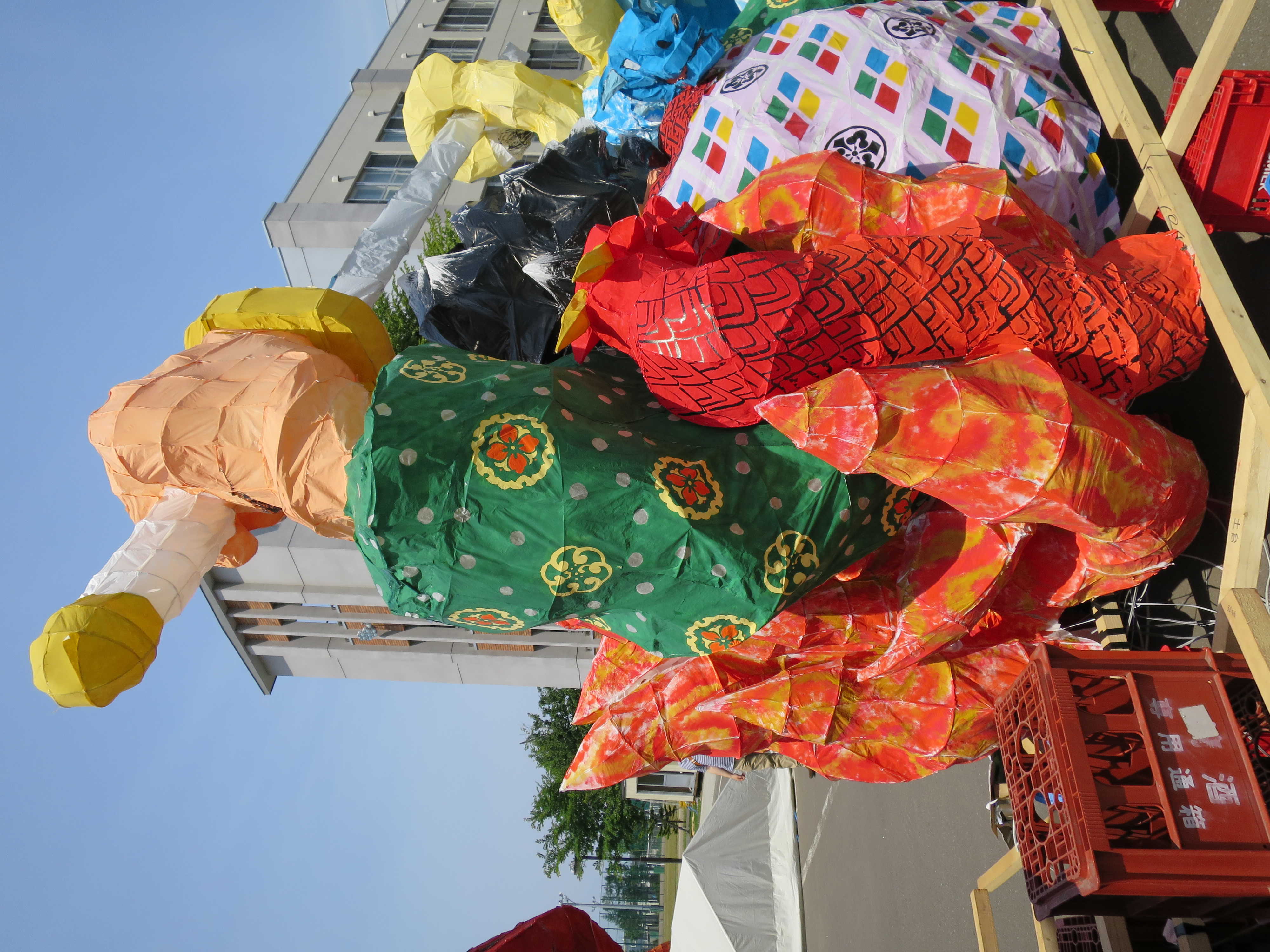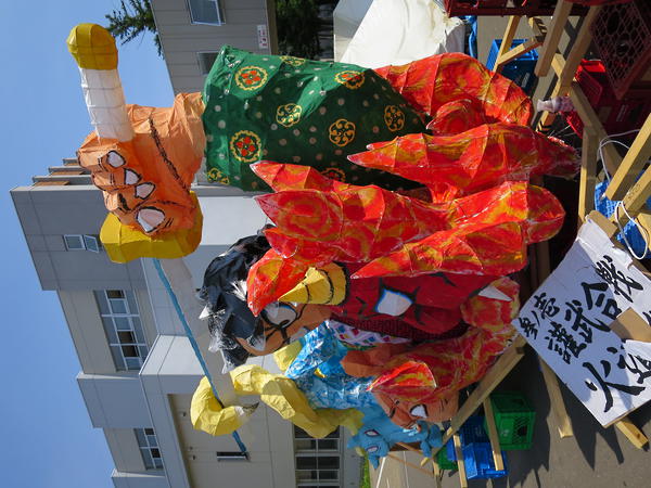 3つの尾、光り輝く隻眼を持つ妖怪「讙」、妖術で鬼を招き、火遁の術で対抗する武者。両者がくり広げる業火、業水の『妖』の合戦を再現しました。華やかな赤と青の対比、鬼気迫る表情、神秘的な讙の姿、そして妖の合戦をぜひご覧ください。