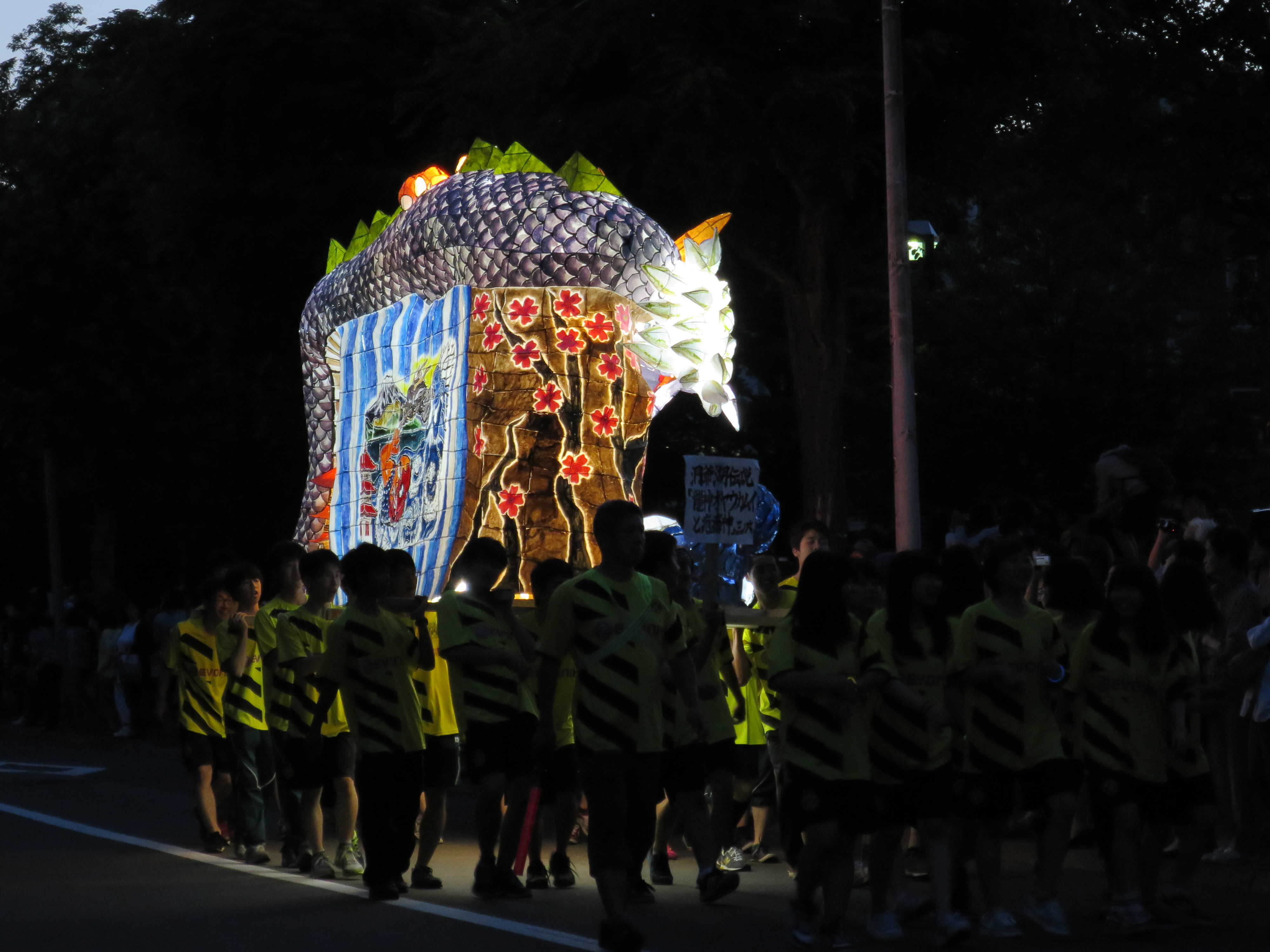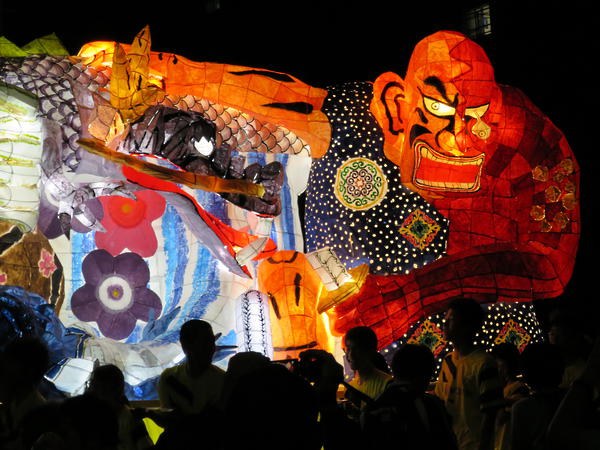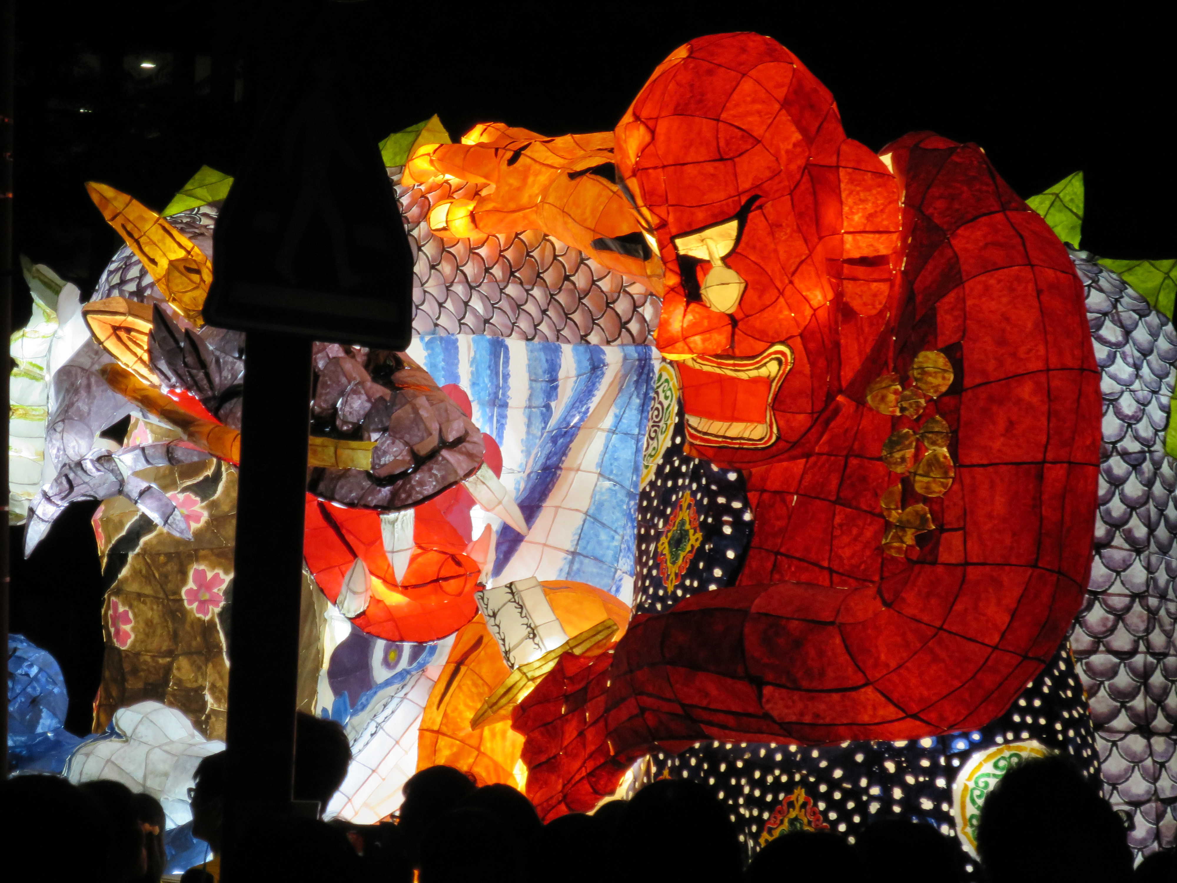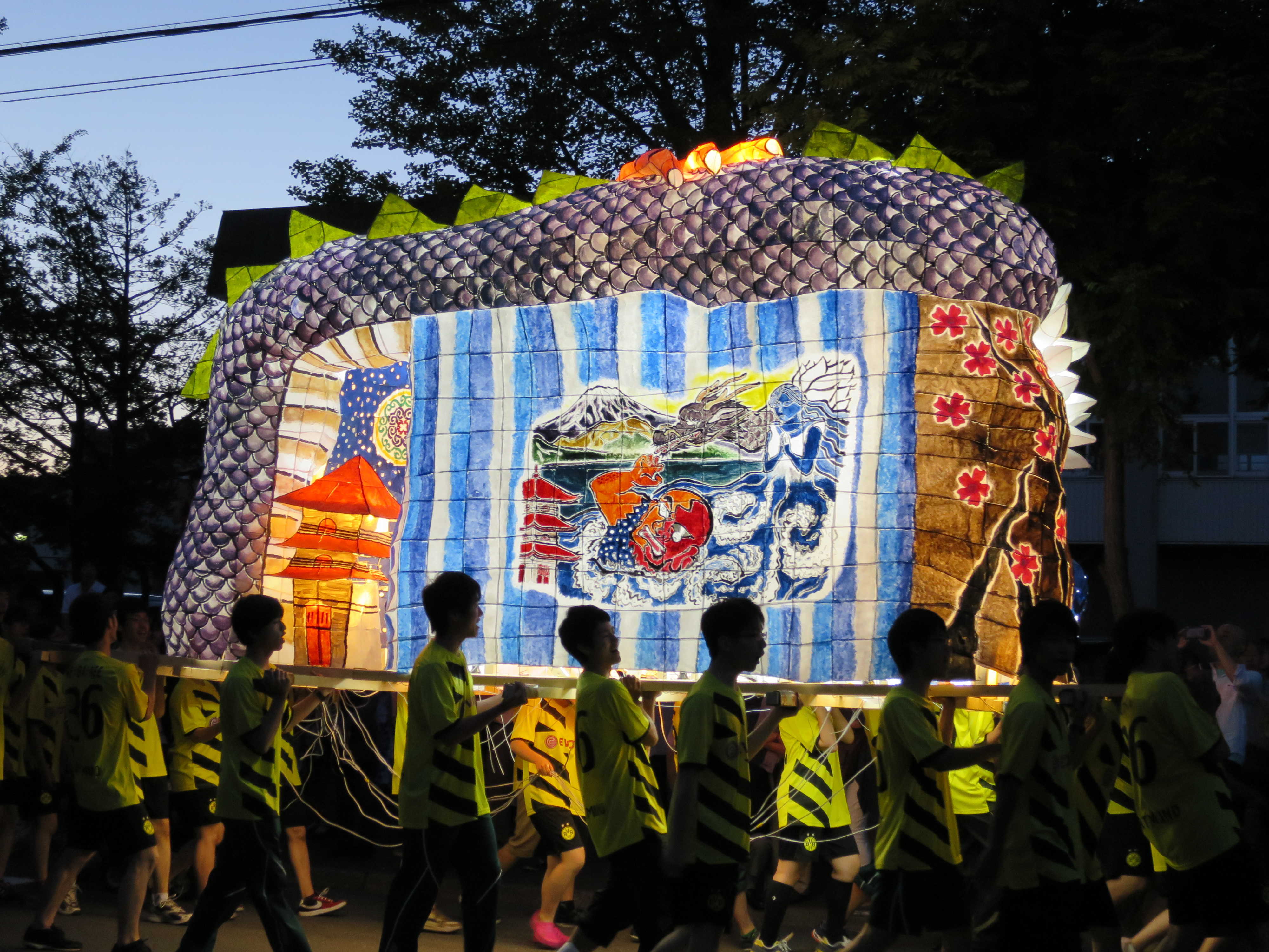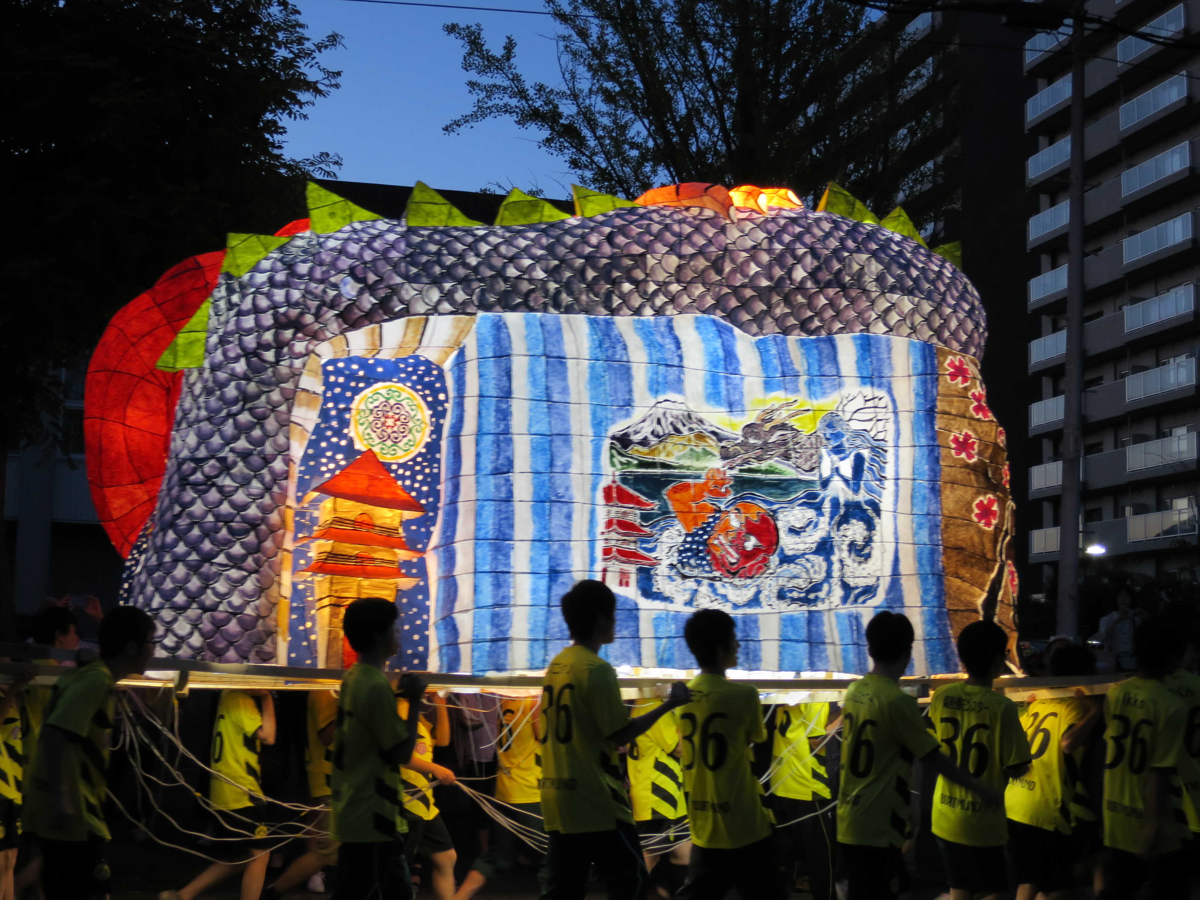 アイヌの伝説によると、洞爺湖に疱瘡を蔓延させて人々を苦しめた疱瘡神を、湖の守り神であり近寄ったものは焼け爛れるという龍神オヤウカムイが追い払ったという。迫力ある戦いの中にも自然の優美さがあり、表裏で時の経過を表現したこの行灯を是非ご覧あれ。