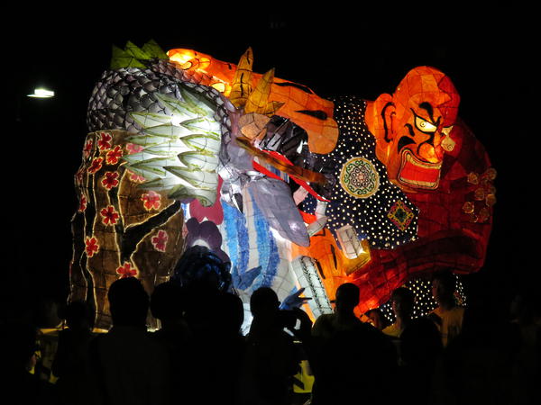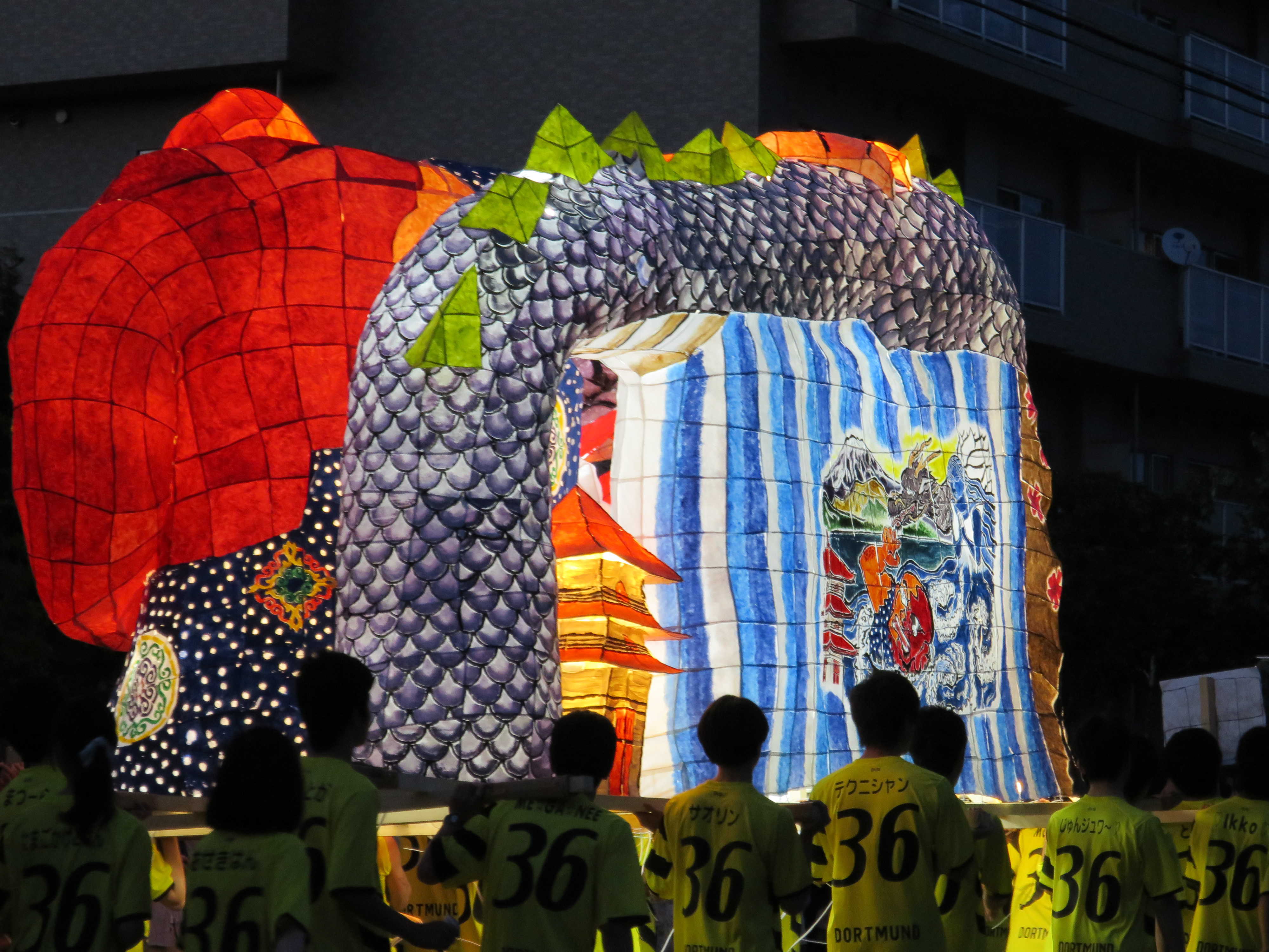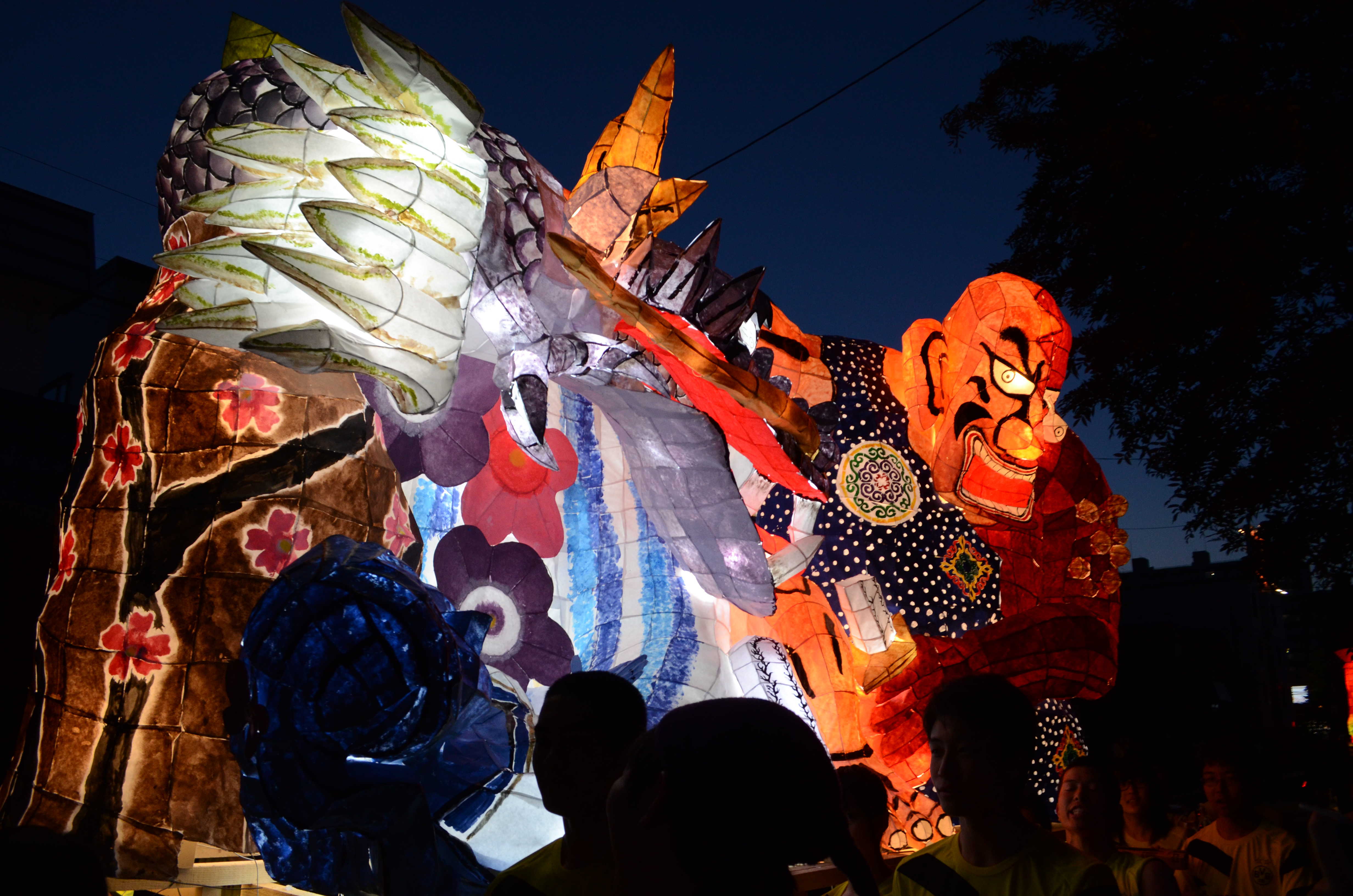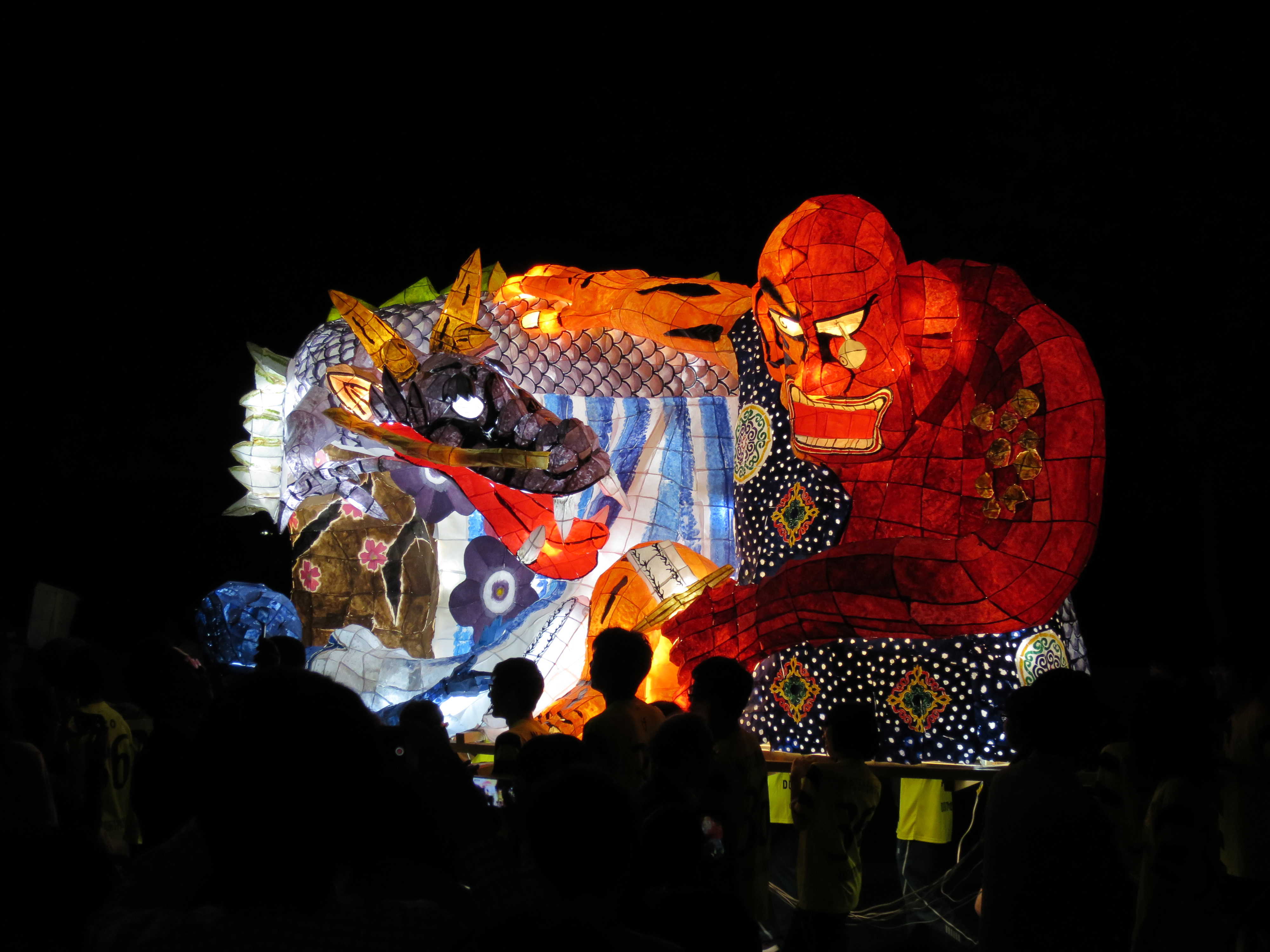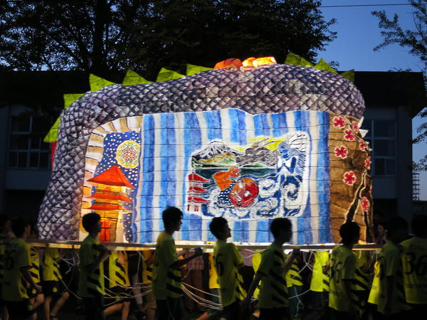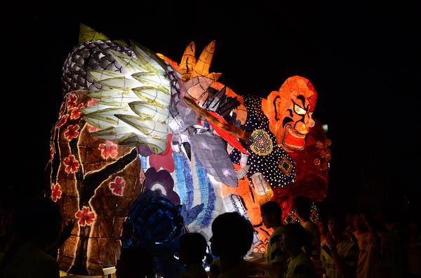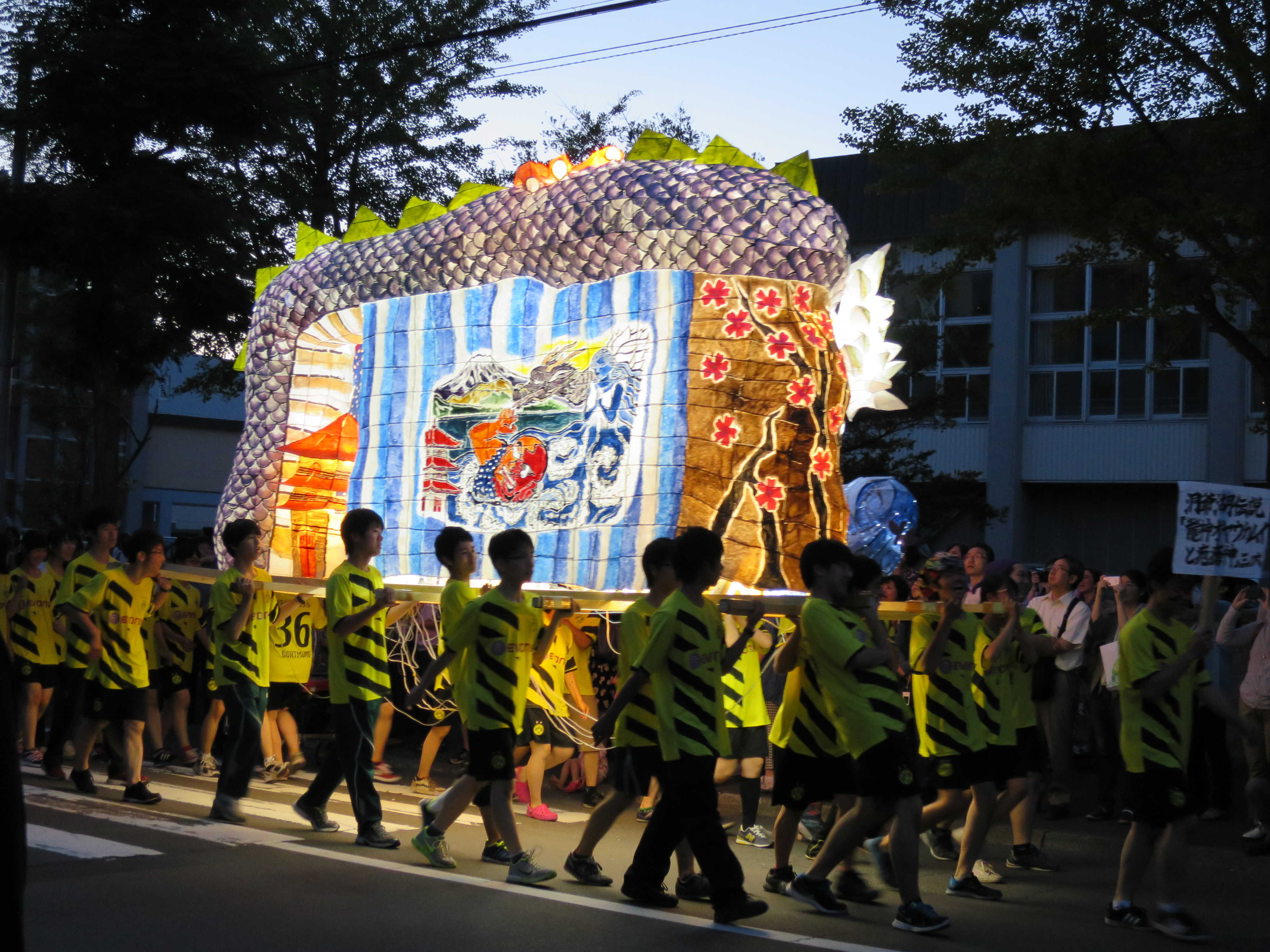 アイヌの伝説によると、洞爺湖に疱瘡を蔓延させて人々を苦しめた疱瘡神を、湖の守り神であり近寄ったものは焼け爛れるという龍神オヤウカムイが追い払ったという。迫力ある戦いの中にも自然の優美さがあり、表裏で時の経過を表現したこの行灯を是非ご覧あれ。
