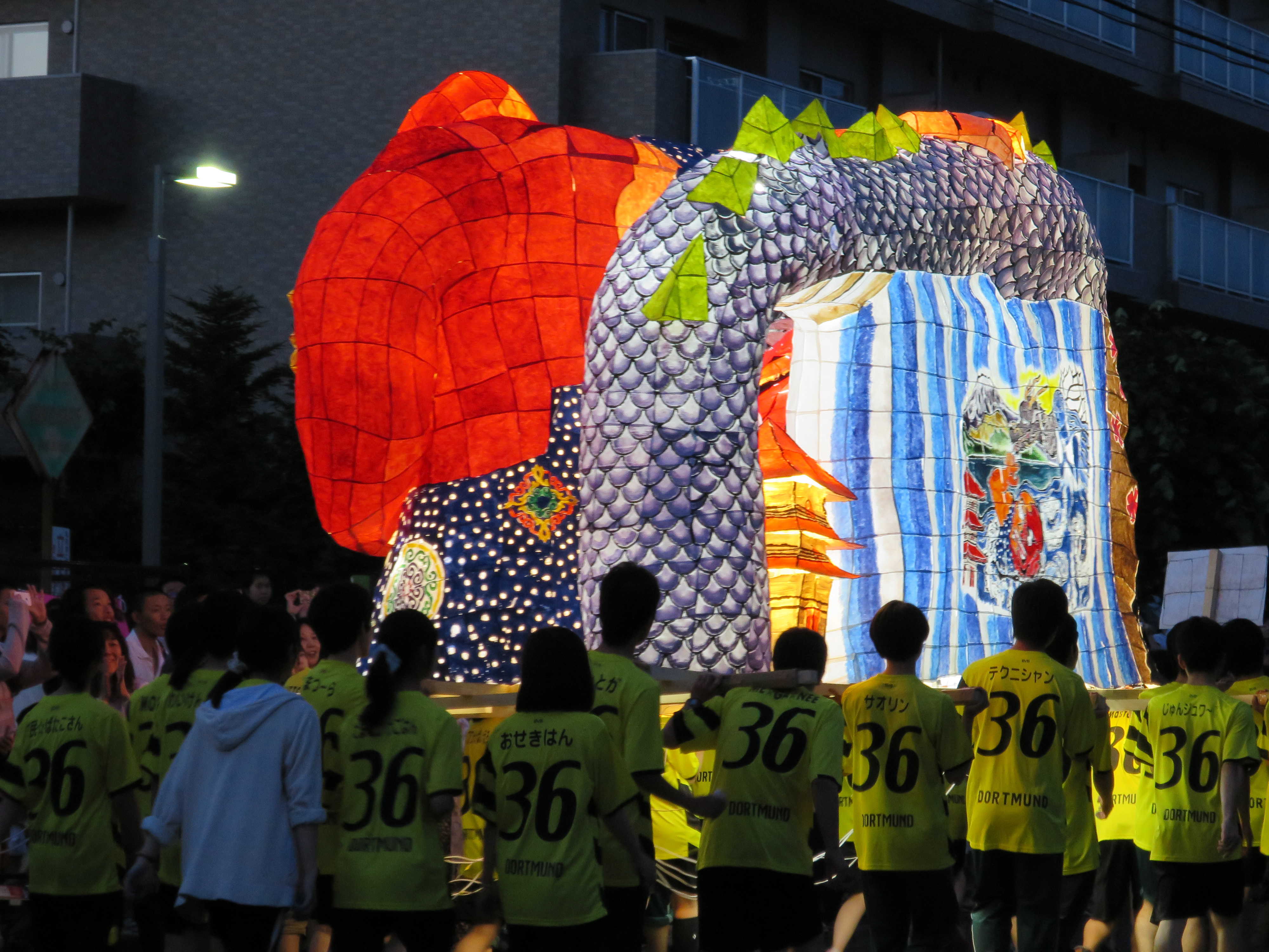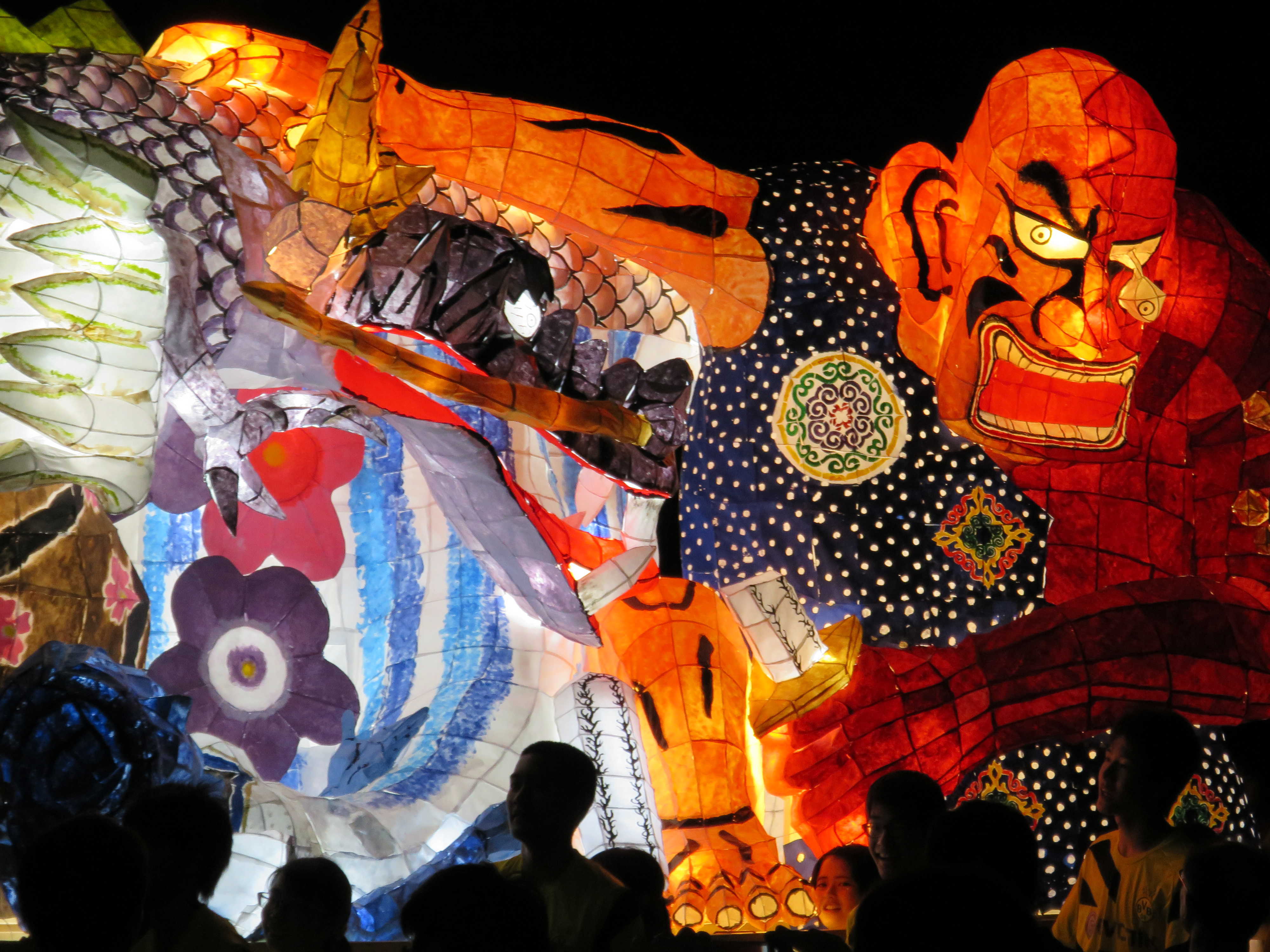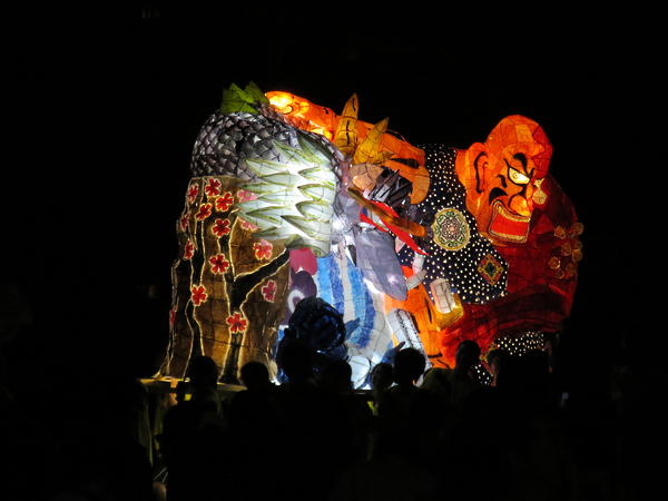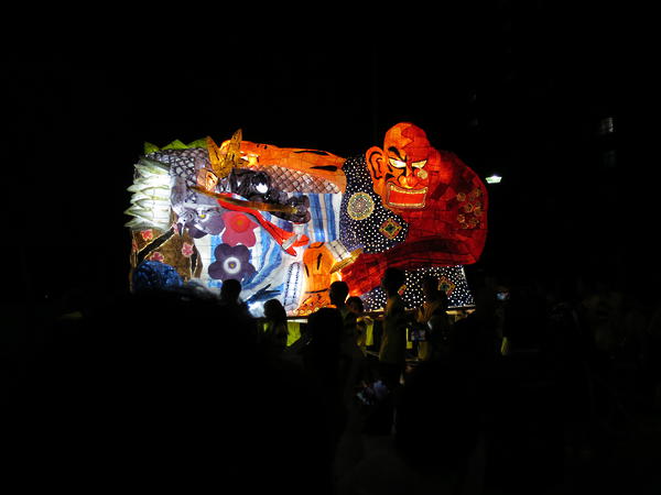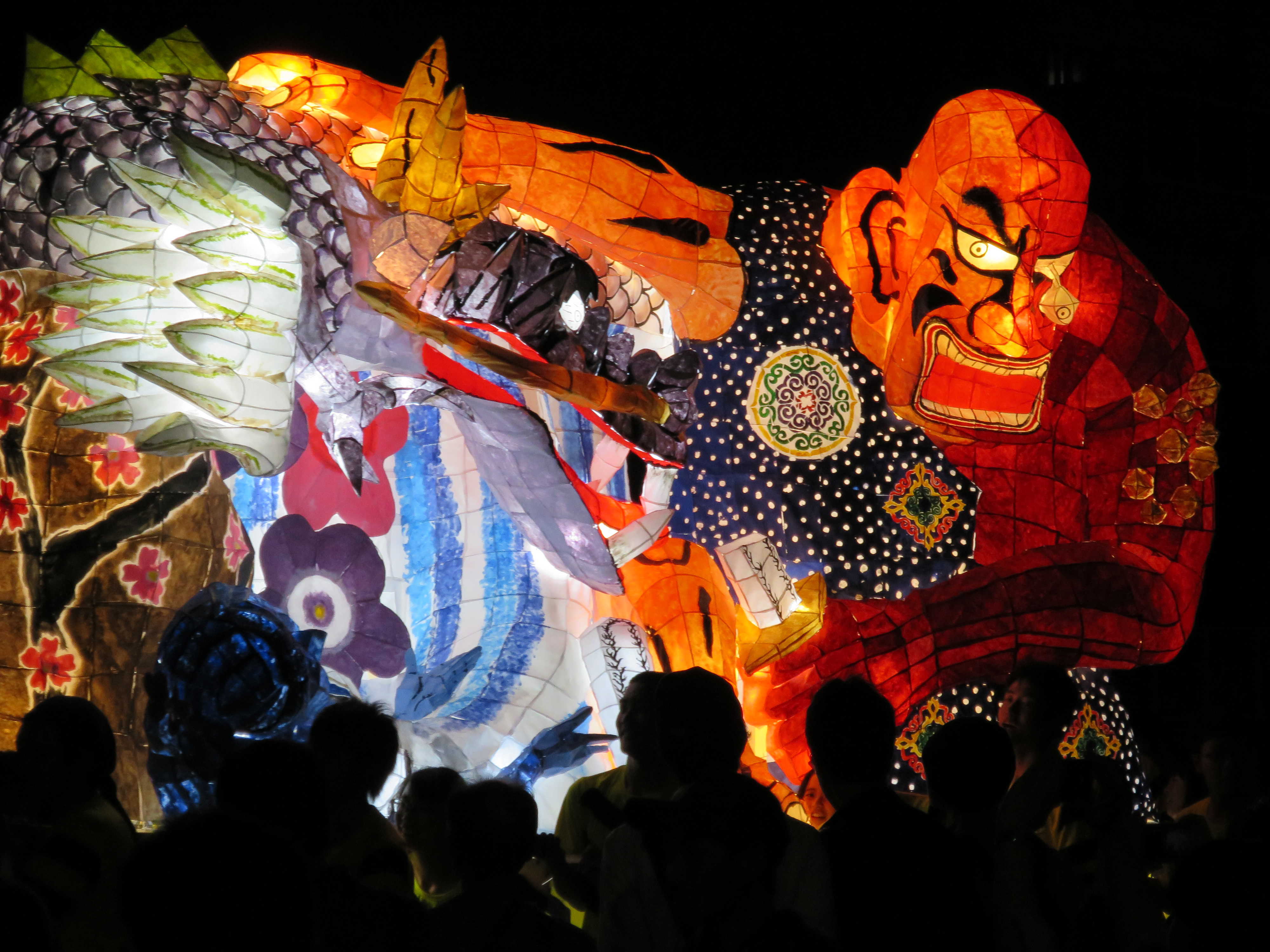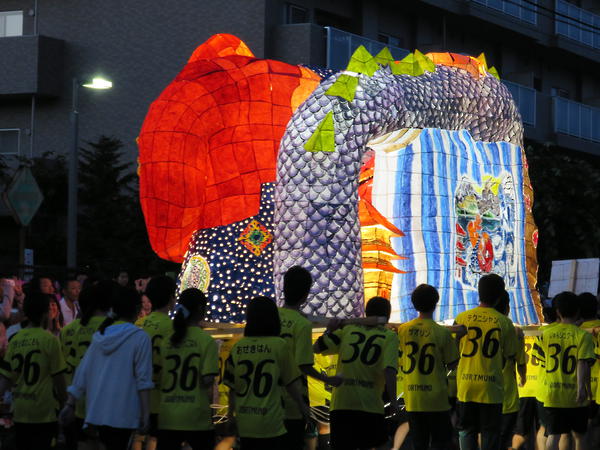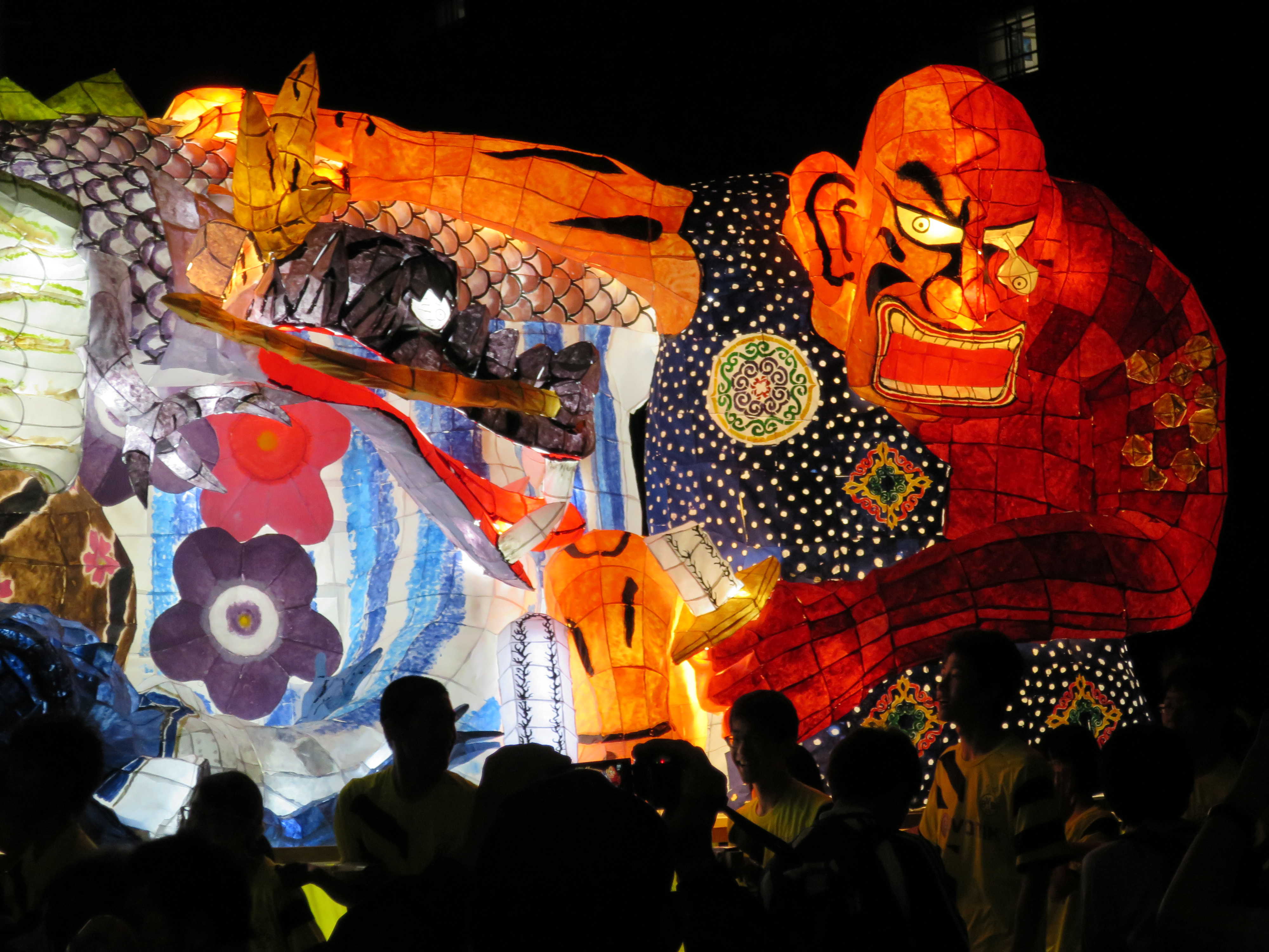 アイヌの伝説によると、洞爺湖に疱瘡を蔓延させて人々を苦しめた疱瘡神を、湖の守り神であり近寄ったものは焼け爛れるという龍神オヤウカムイが追い払ったという。迫力ある戦いの中にも自然の優美さがあり、表裏で時の経過を表現したこの行灯を是非ご覧あれ。