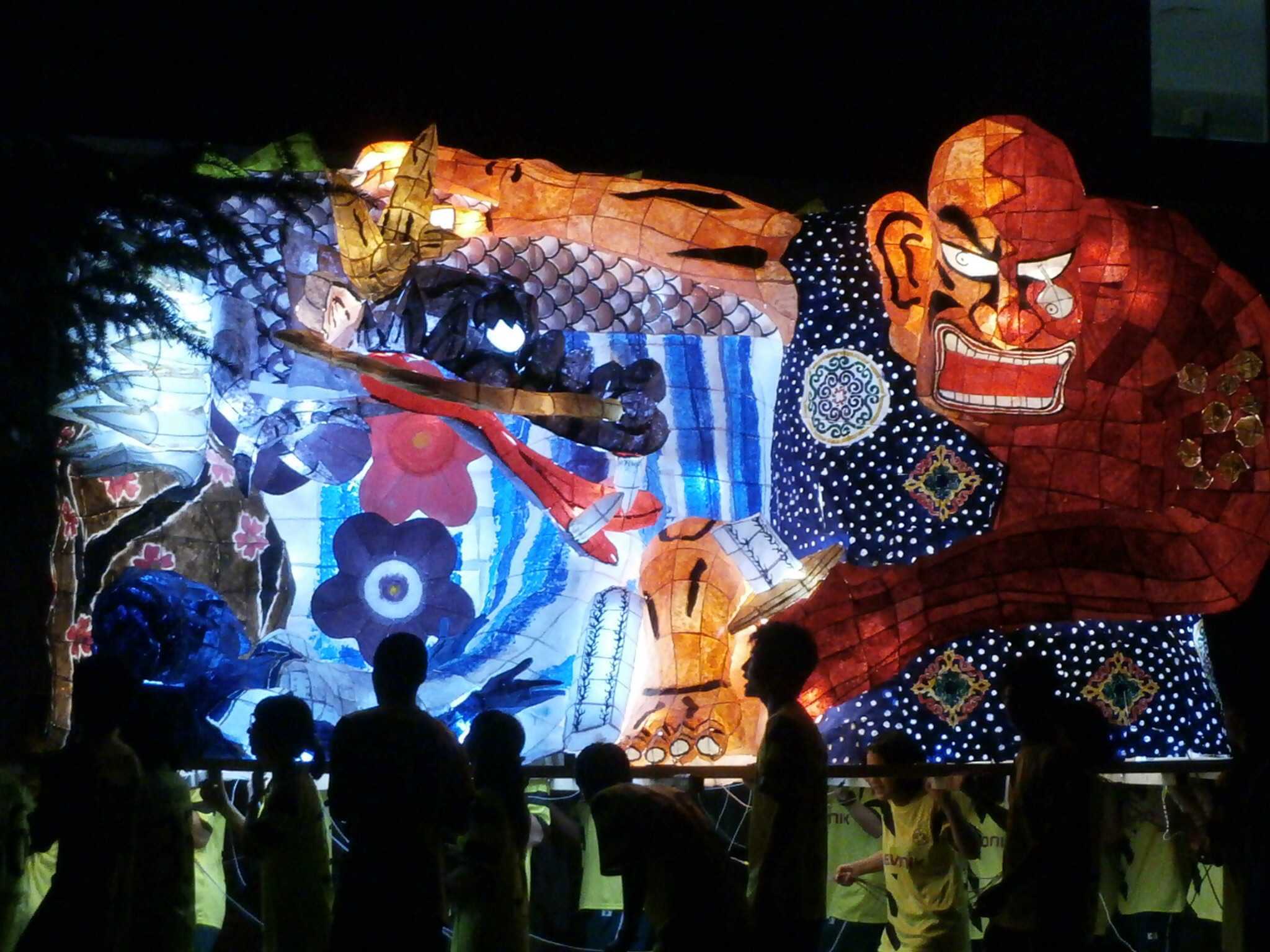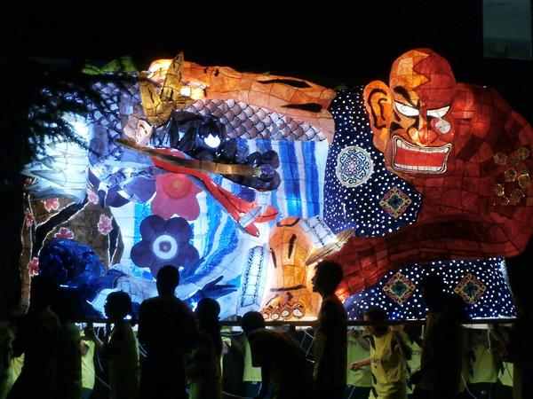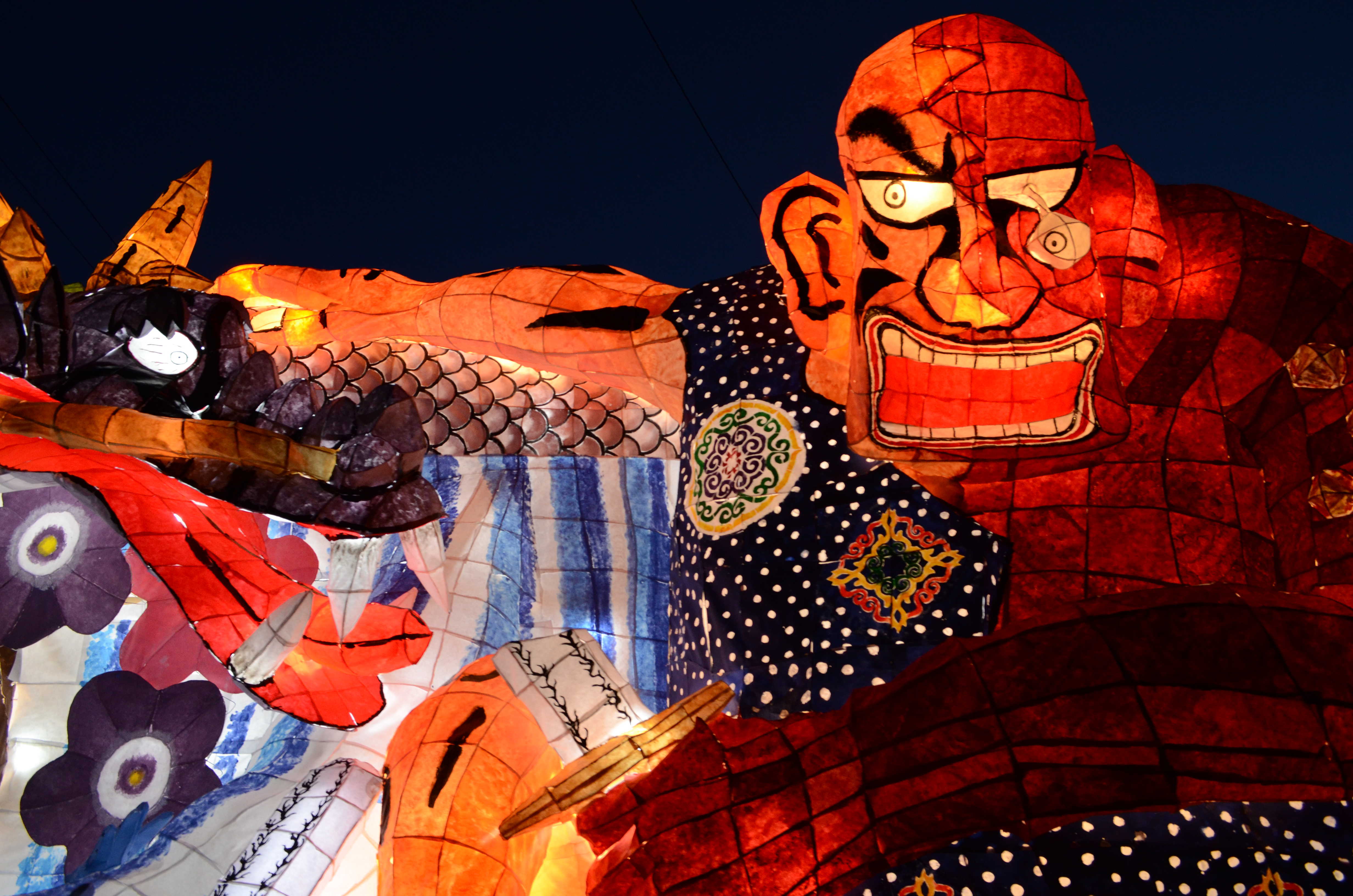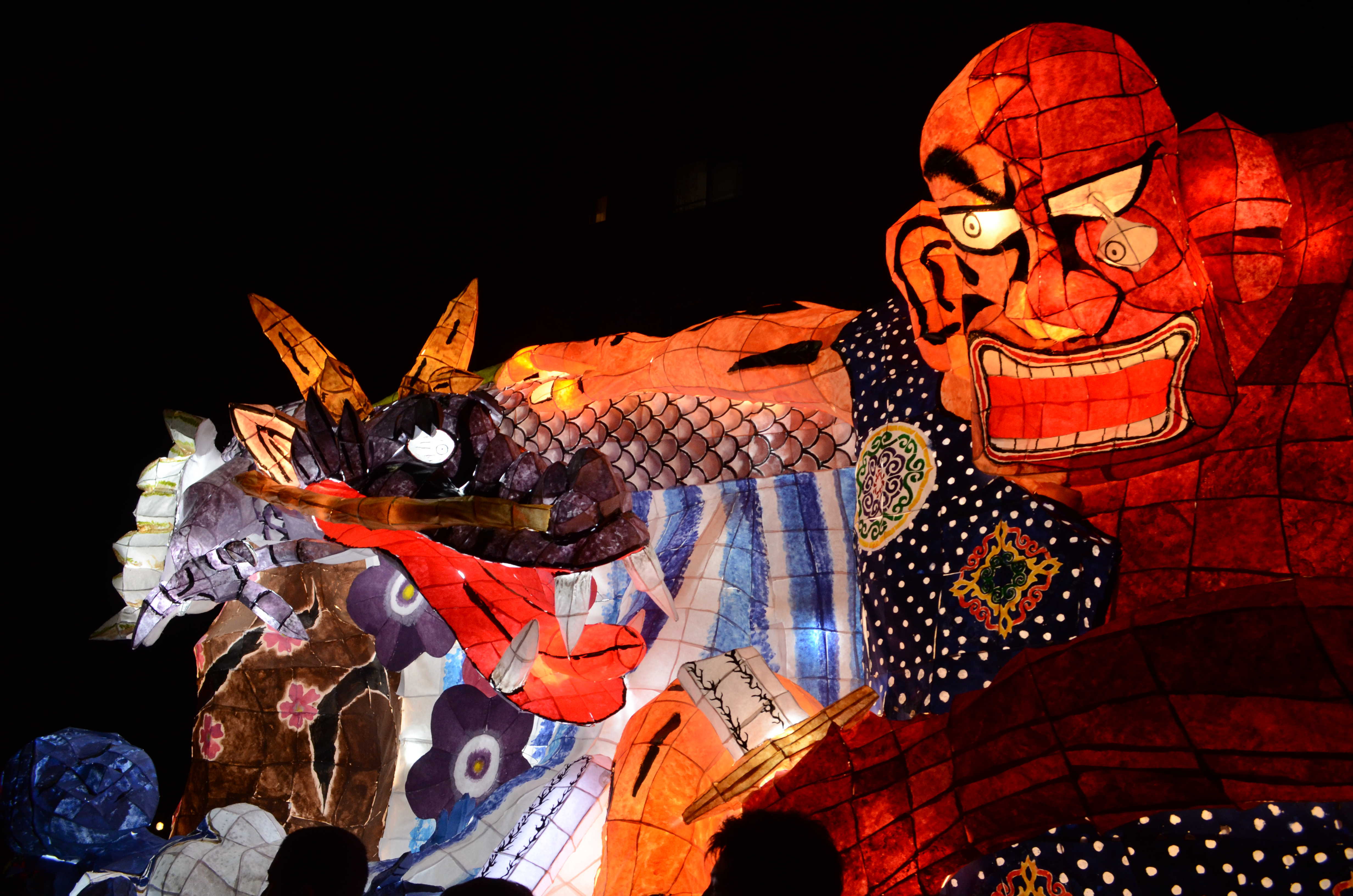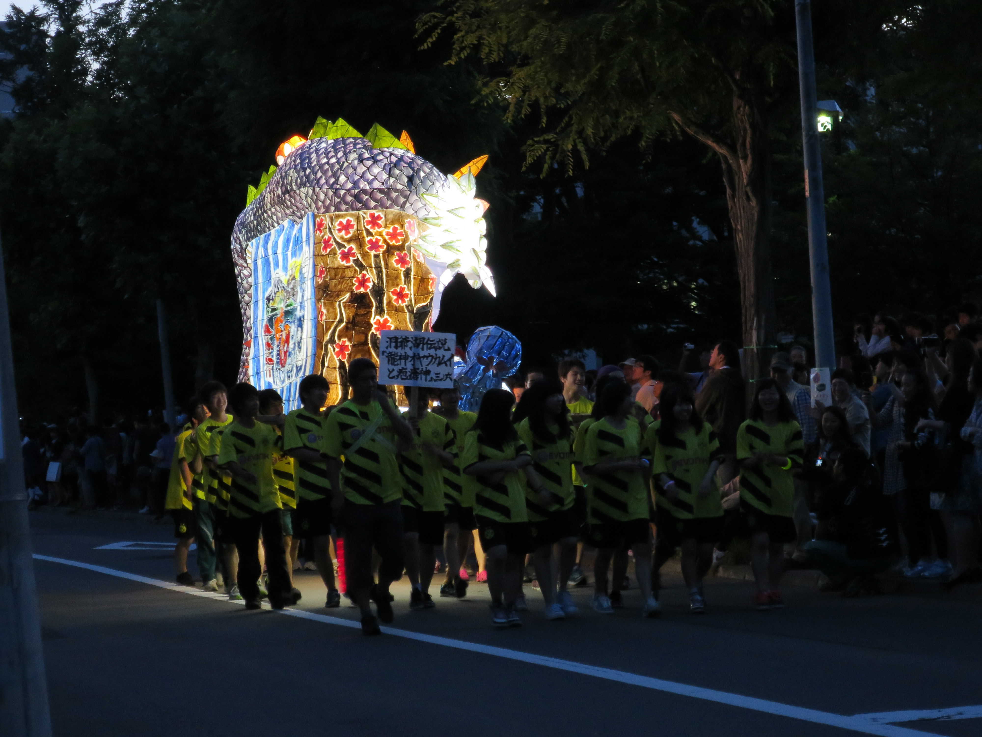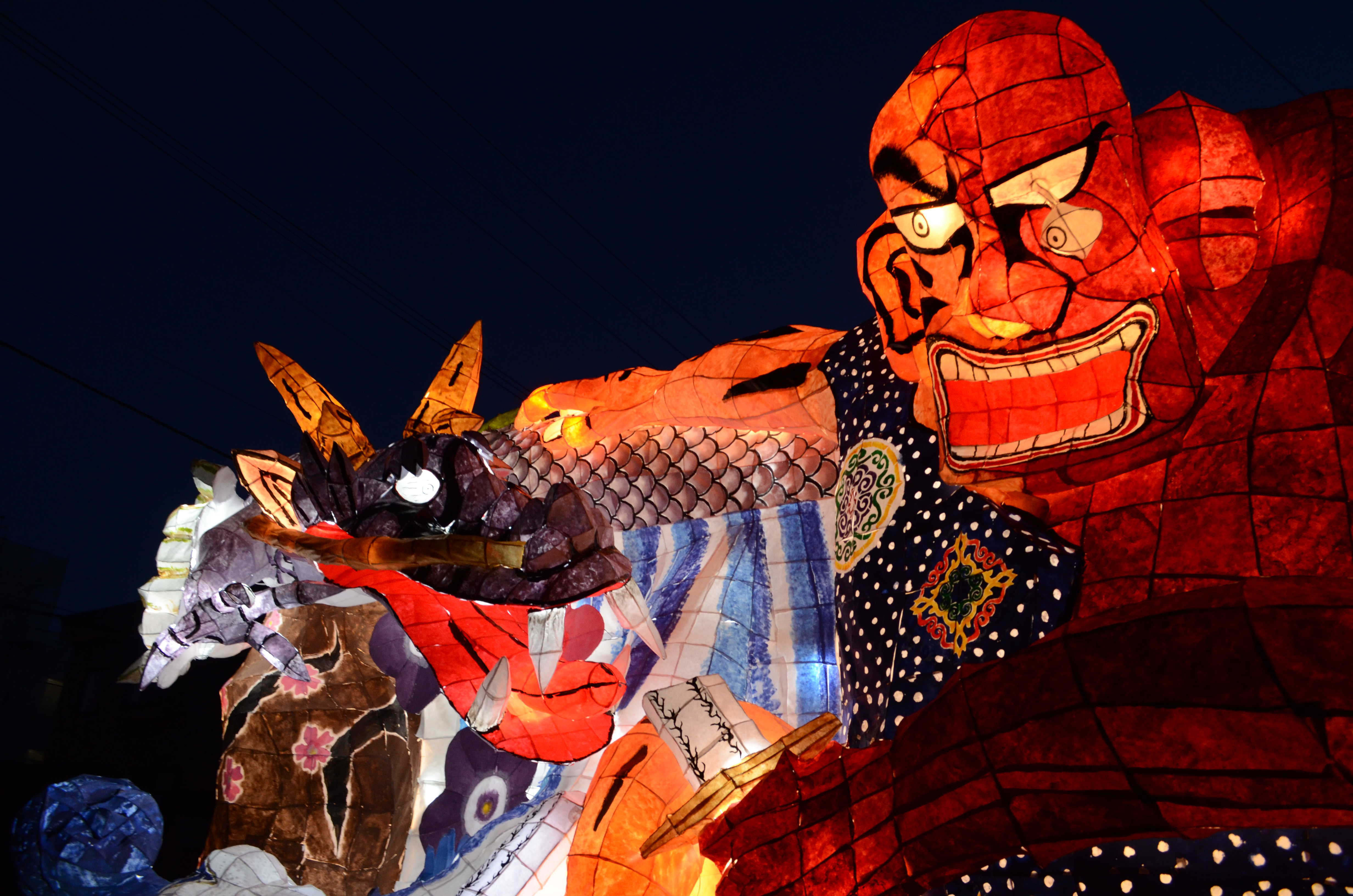 アイヌの伝説によると、洞爺湖に疱瘡を蔓延させて人々を苦しめた疱瘡神を、湖の守り神であり近寄ったものは焼け爛れるという龍神オヤウカムイが追い払ったという。迫力ある戦いの中にも自然の優美さがあり、表裏で時の経過を表現したこの行灯を是非ご覧あれ。