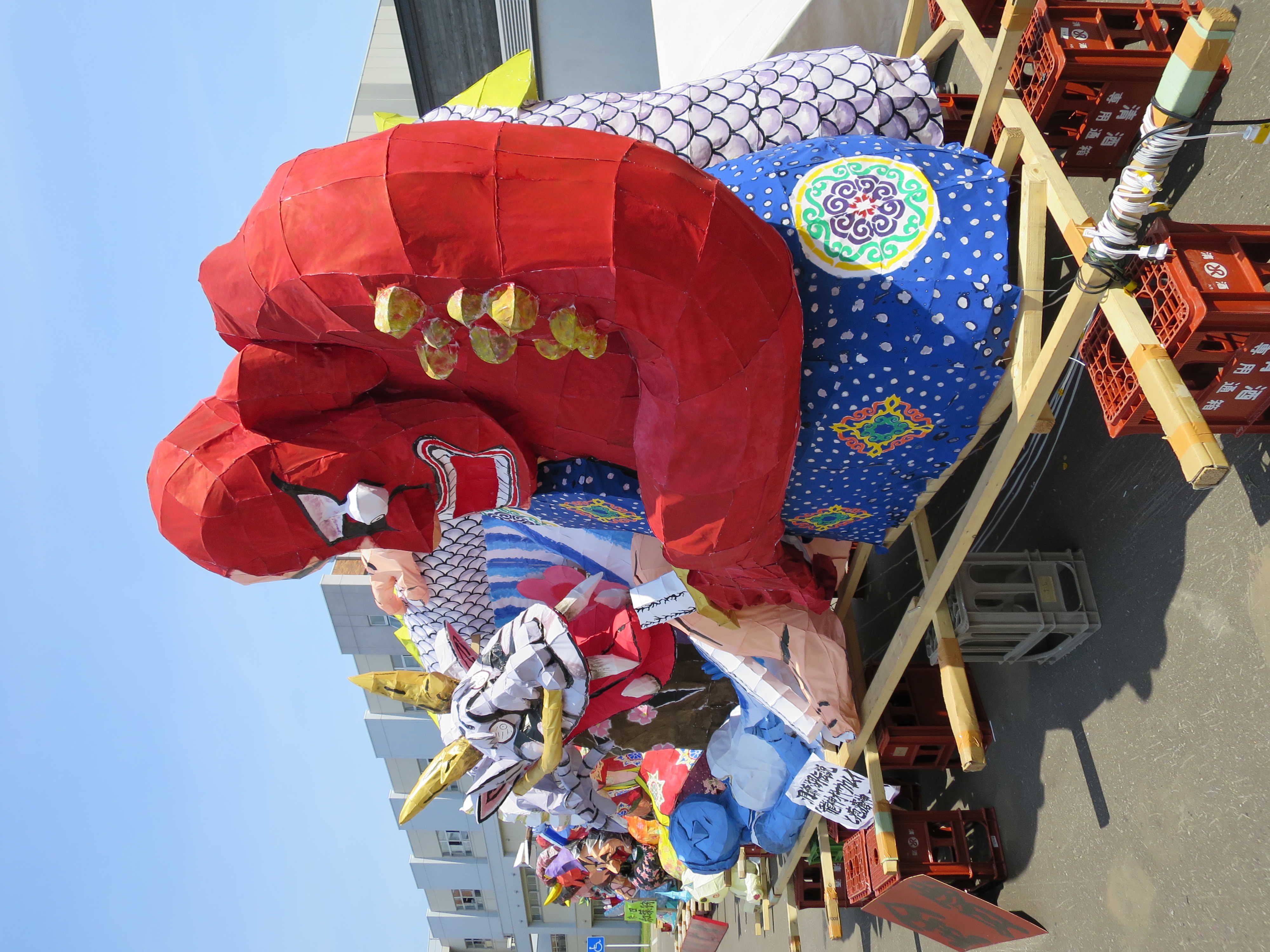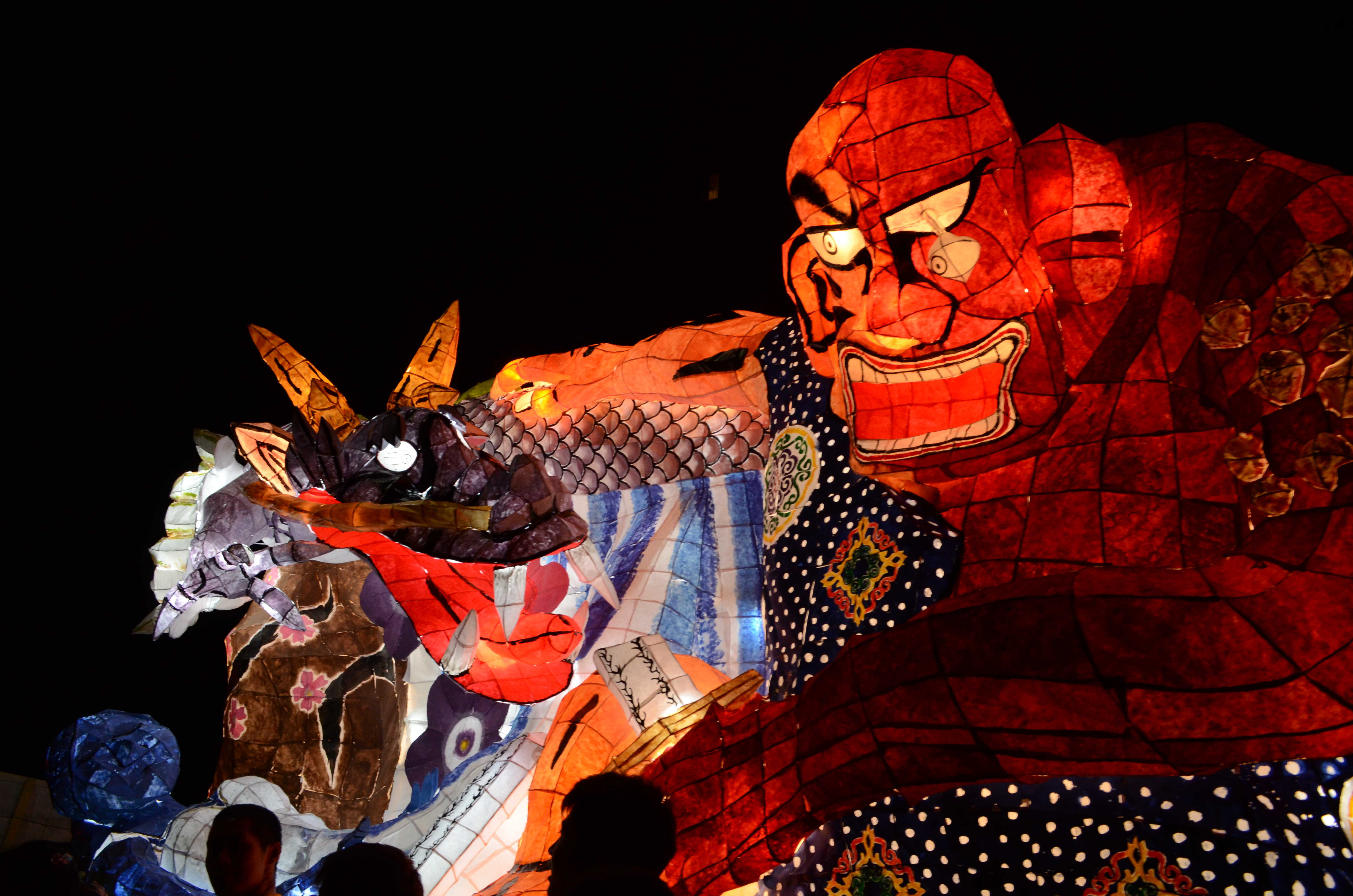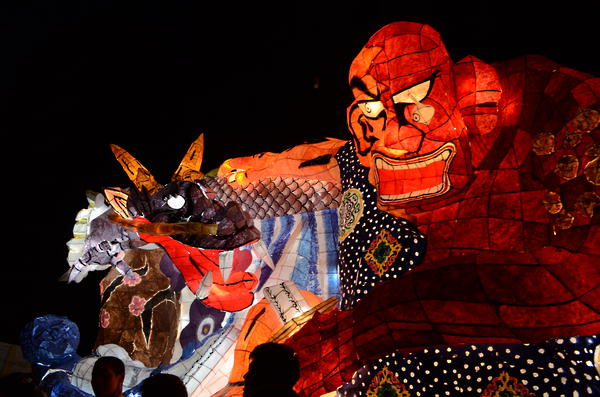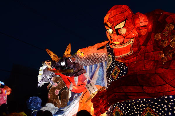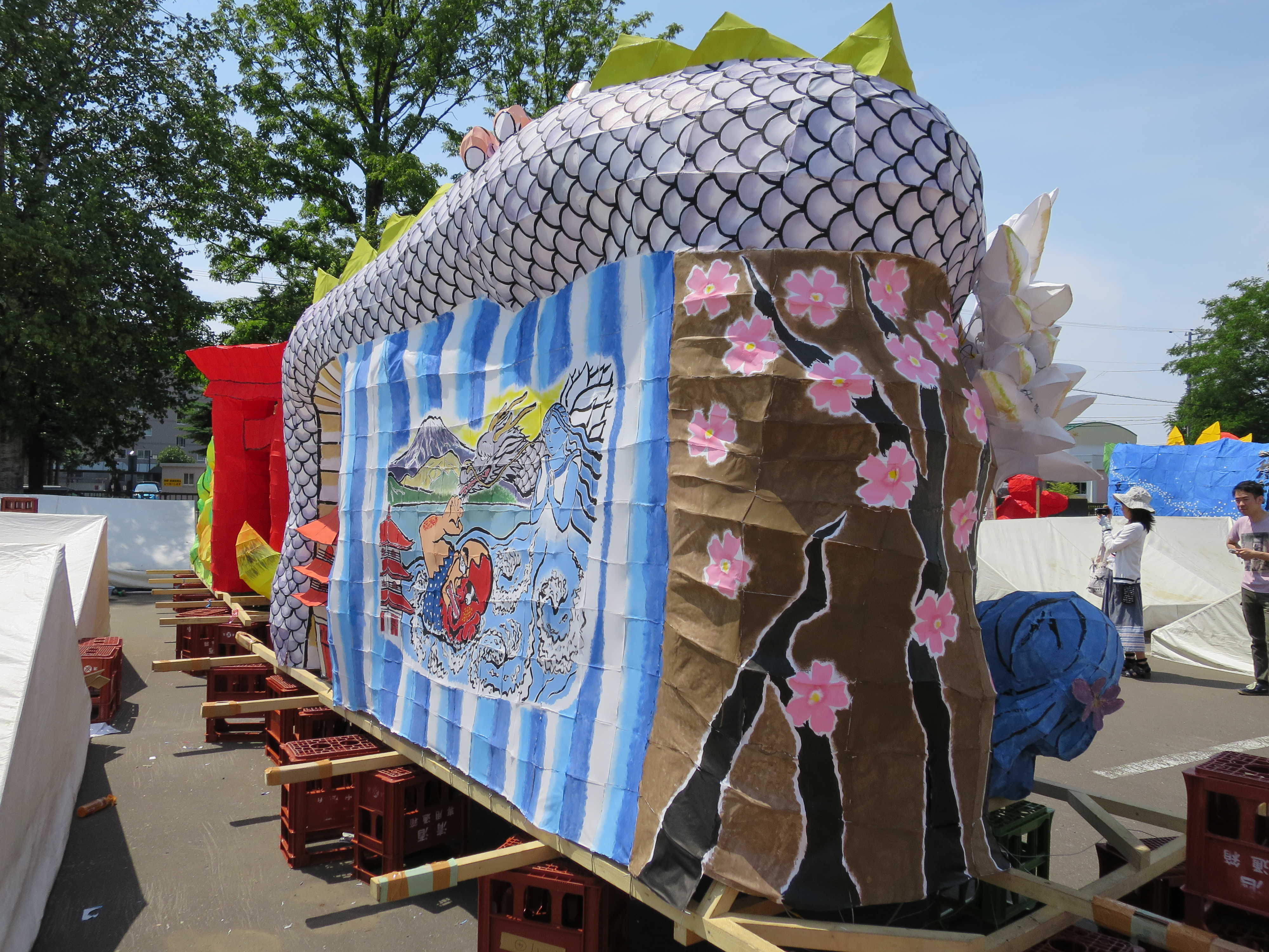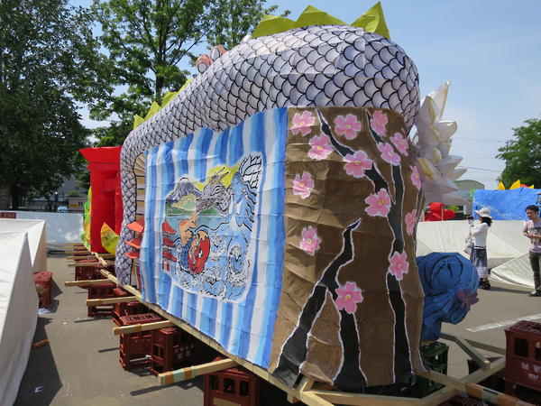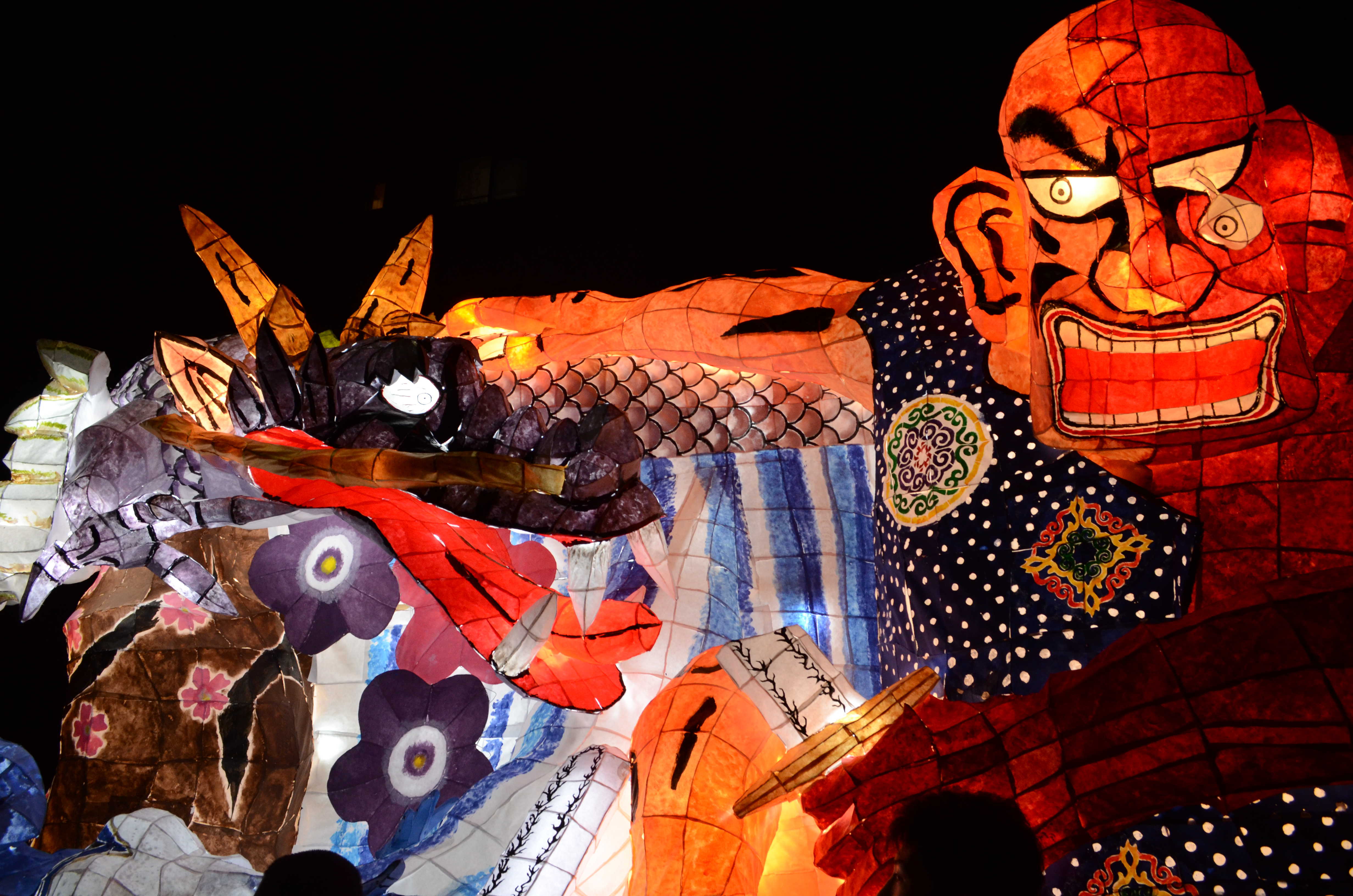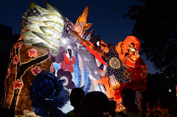アイヌの伝説によると、洞爺湖に疱瘡を蔓延させて人々を苦しめた疱瘡神を、湖の守り神であり近寄ったものは焼け爛れるという龍神オヤウカムイが追い払ったという。迫力ある戦いの中にも自然の優美さがあり、表裏で時の経過を表現したこの行灯を是非ご覧あれ。